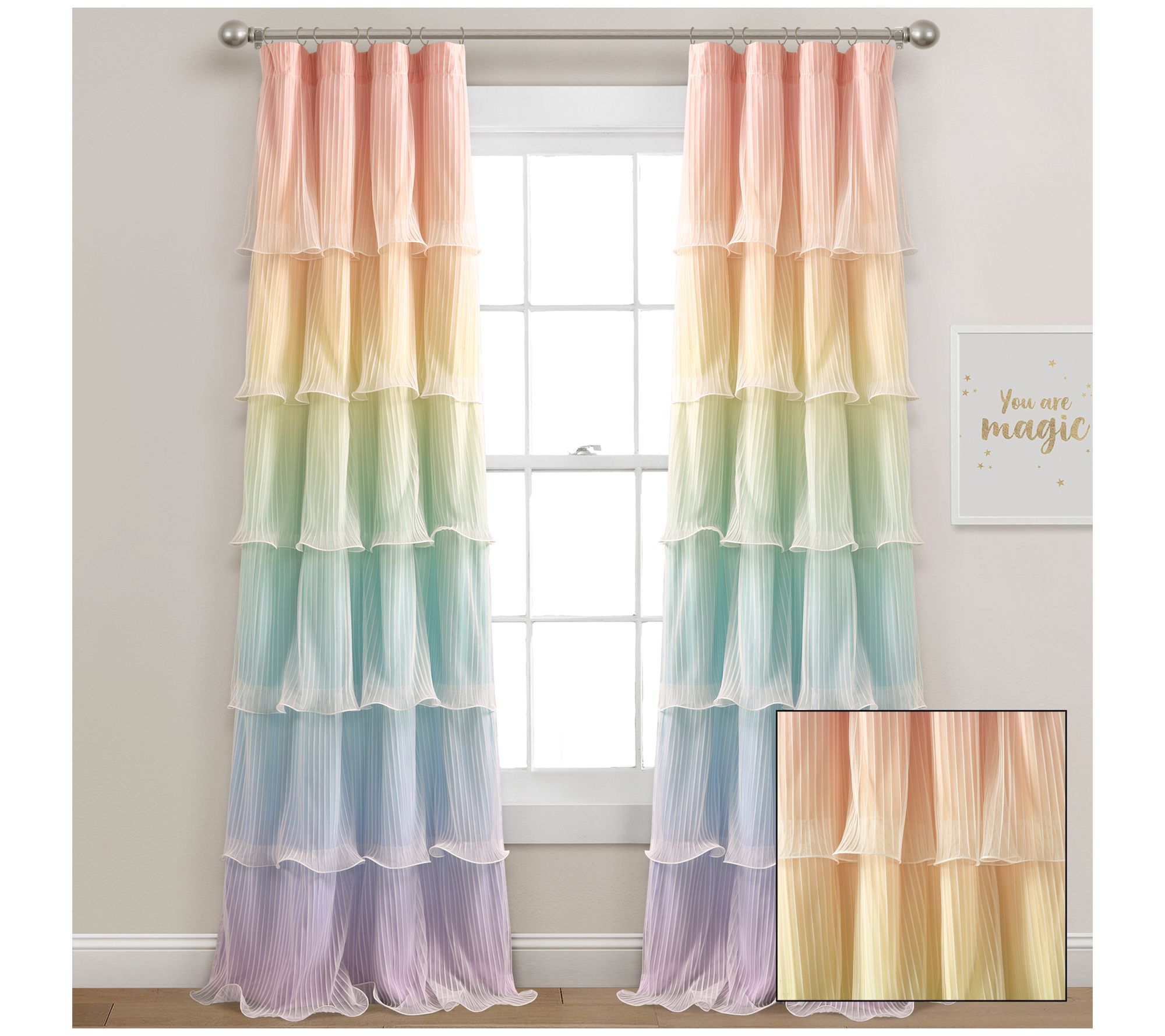 Frame your windows with the rainbow-inspired beauty of these ombre ruffled curtain panels that filter out the light on sunny days with colorful appeal. From Lush Decor.