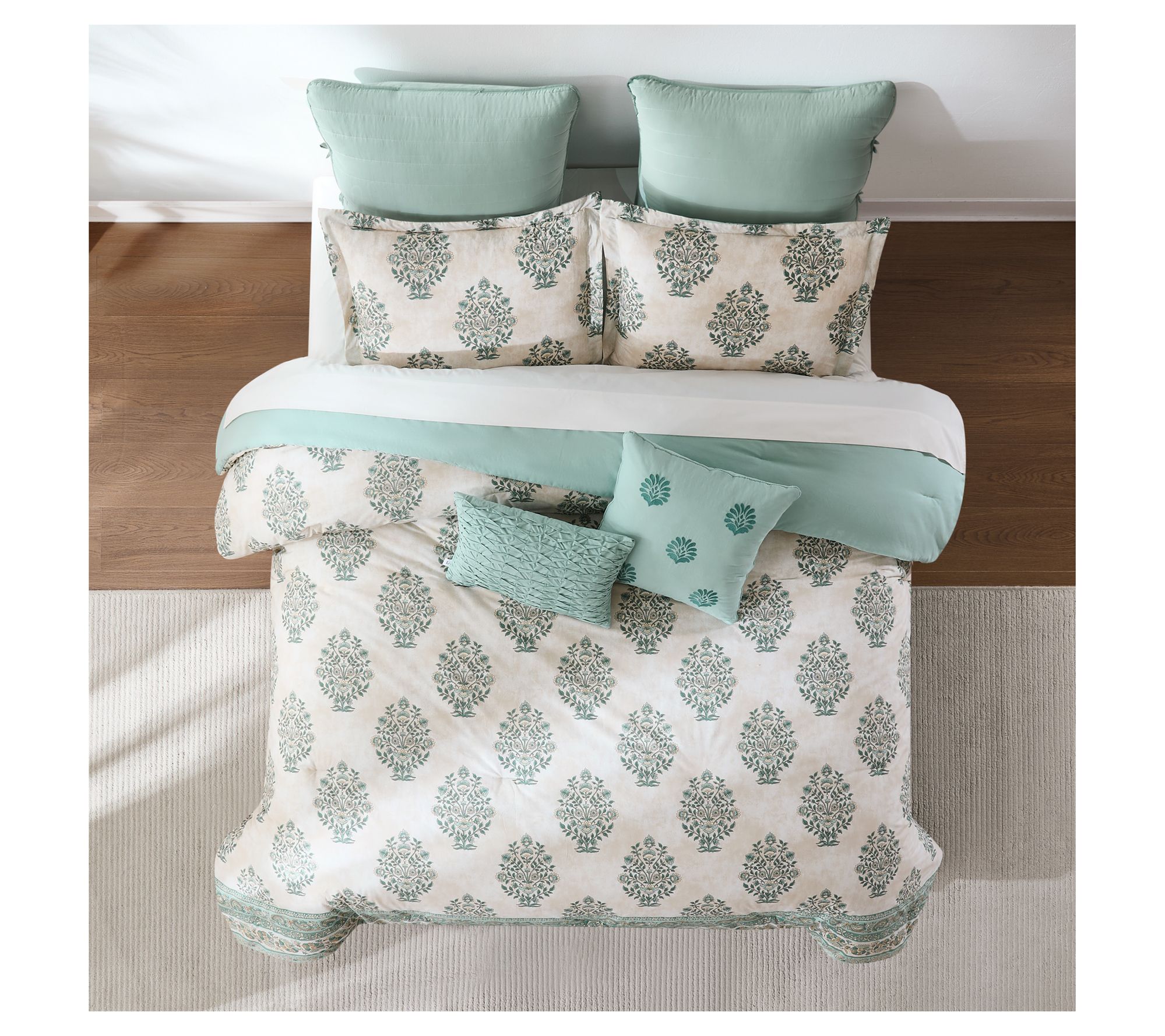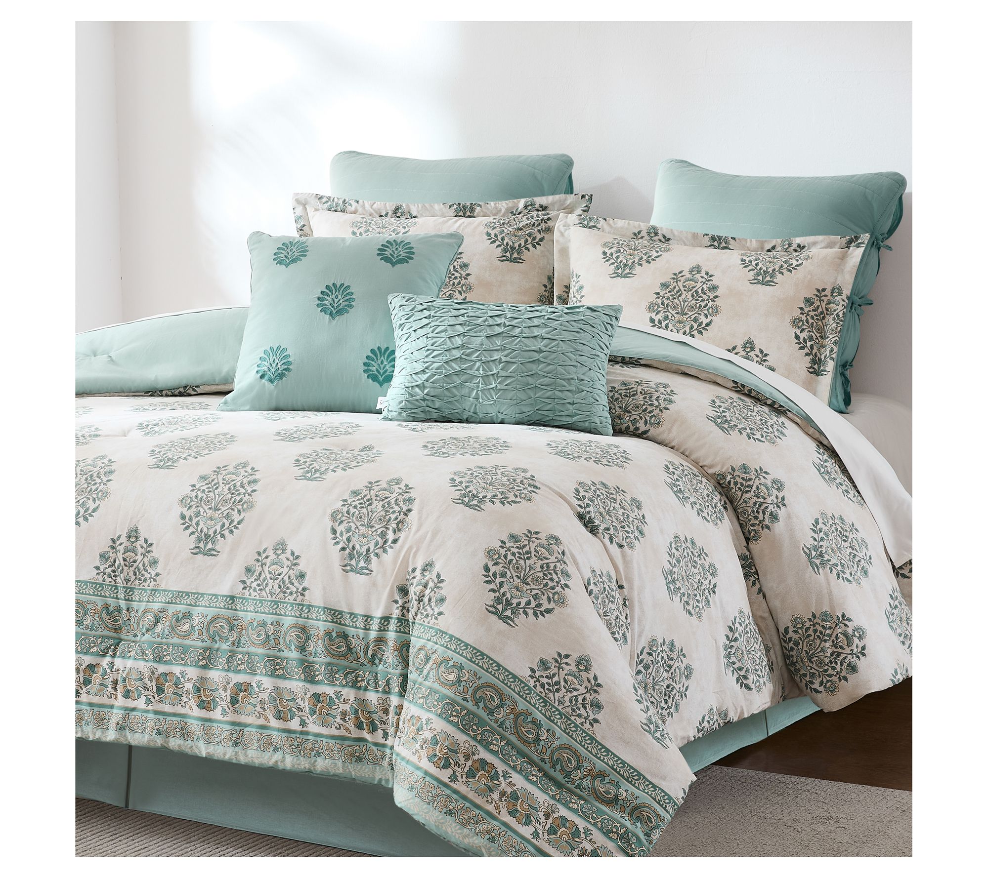 • Includes comforter, bed skirt, two shams, two euro shams, and two decorative pillows