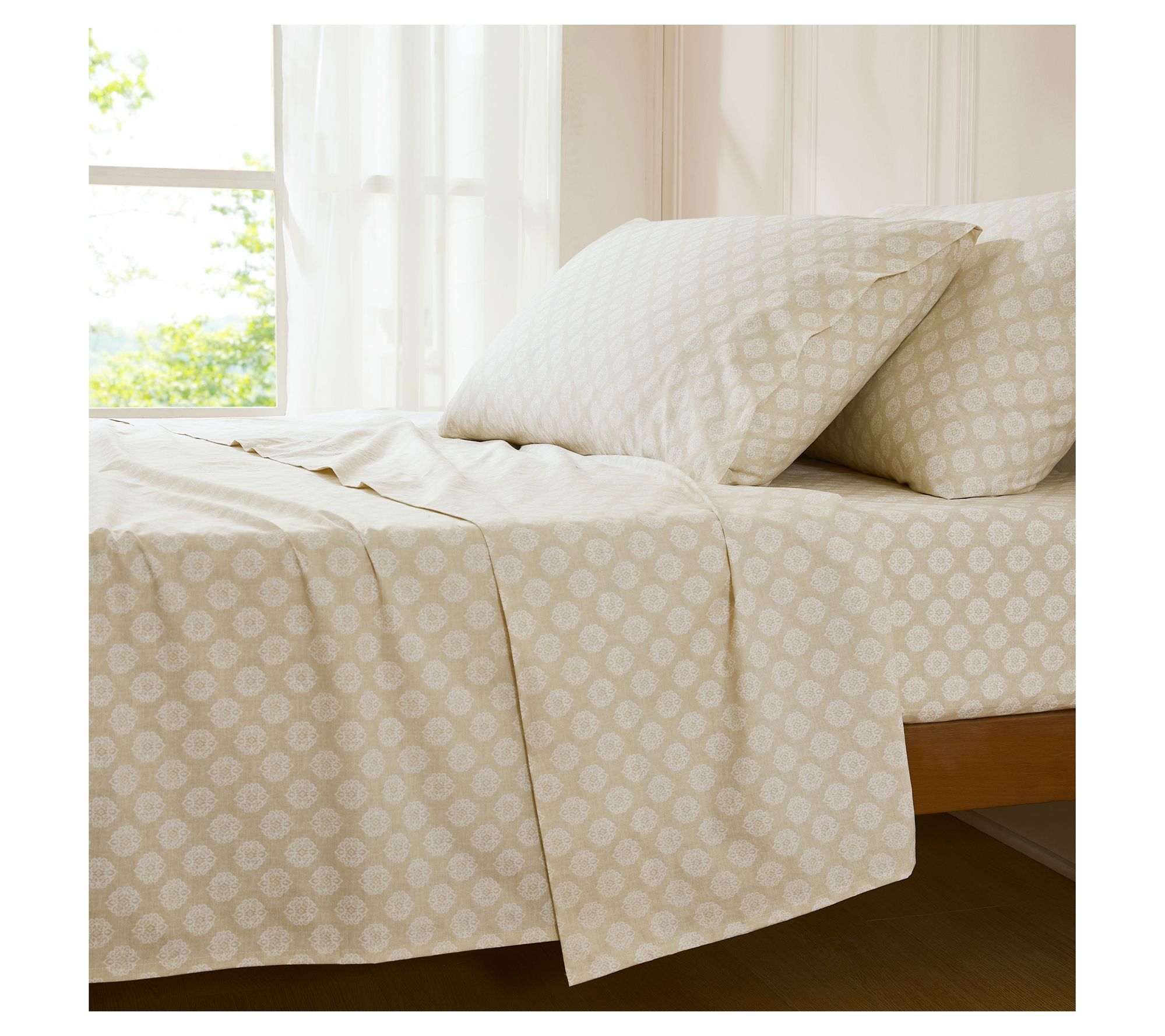 • Includes flat sheet, fitted sheet, and two pillowcases