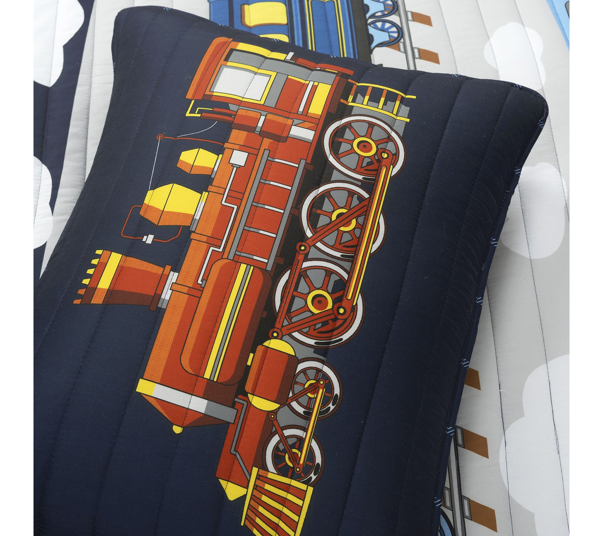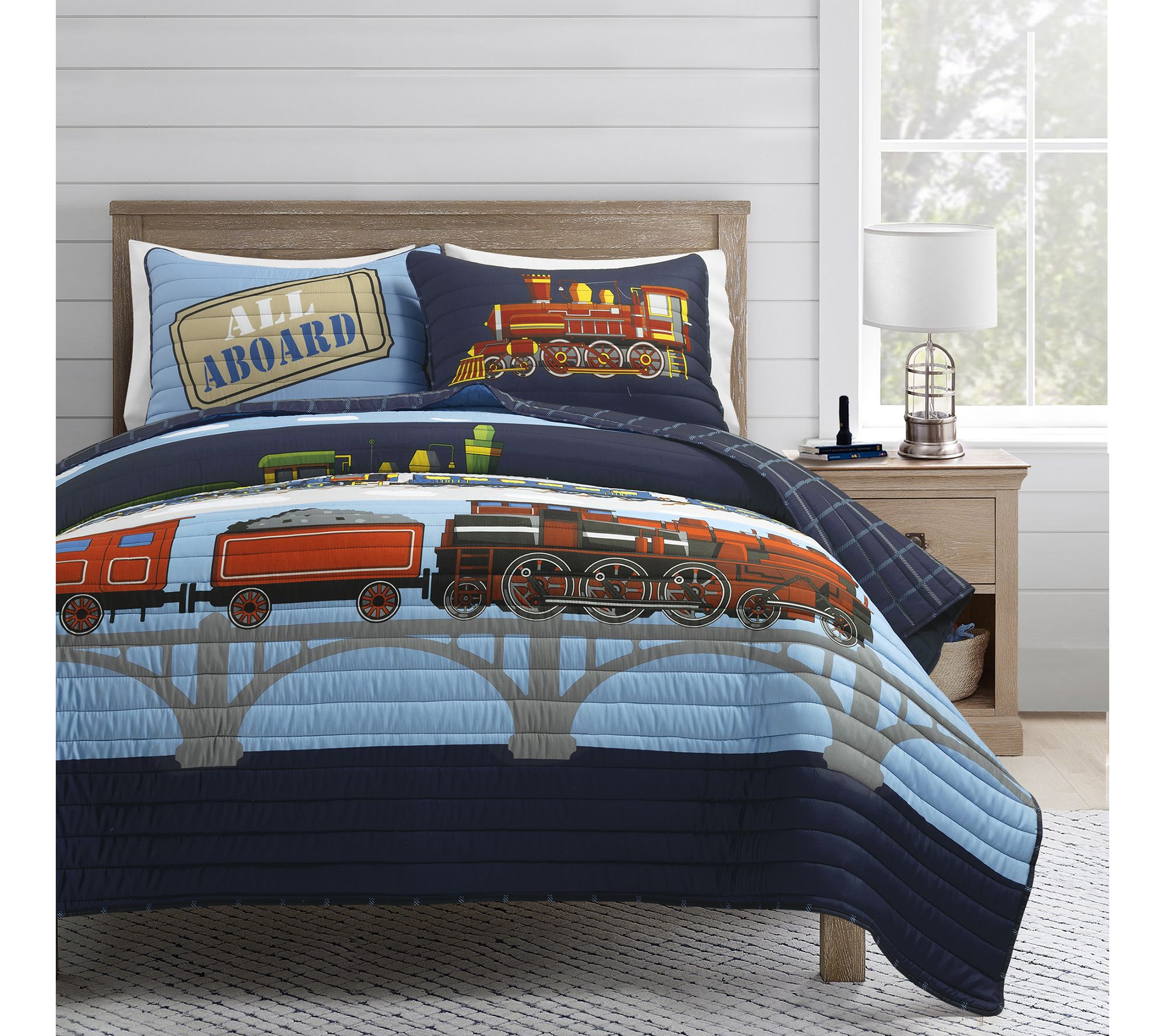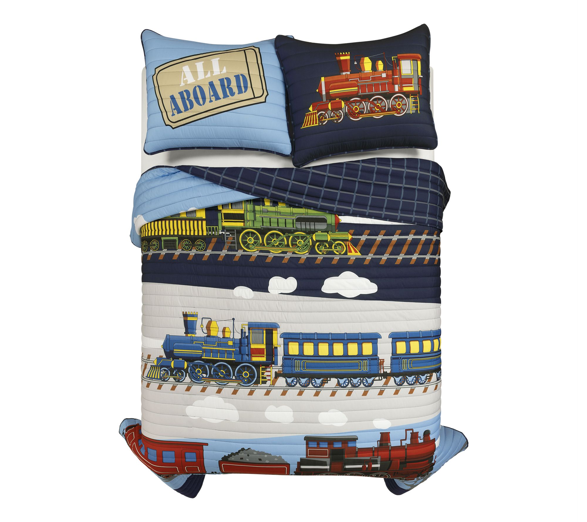 Chug ahead with the colorful Lush Decor Steam Trains Quilt Set! Your child will love the three vintage trains chugging along the tracks, paired with a reversible dark blue grid pattern for versatile styling. Perfect for any season, this lightweight set will keep your child comfortable while inspiring creativity and imagination. From Lush Decor.