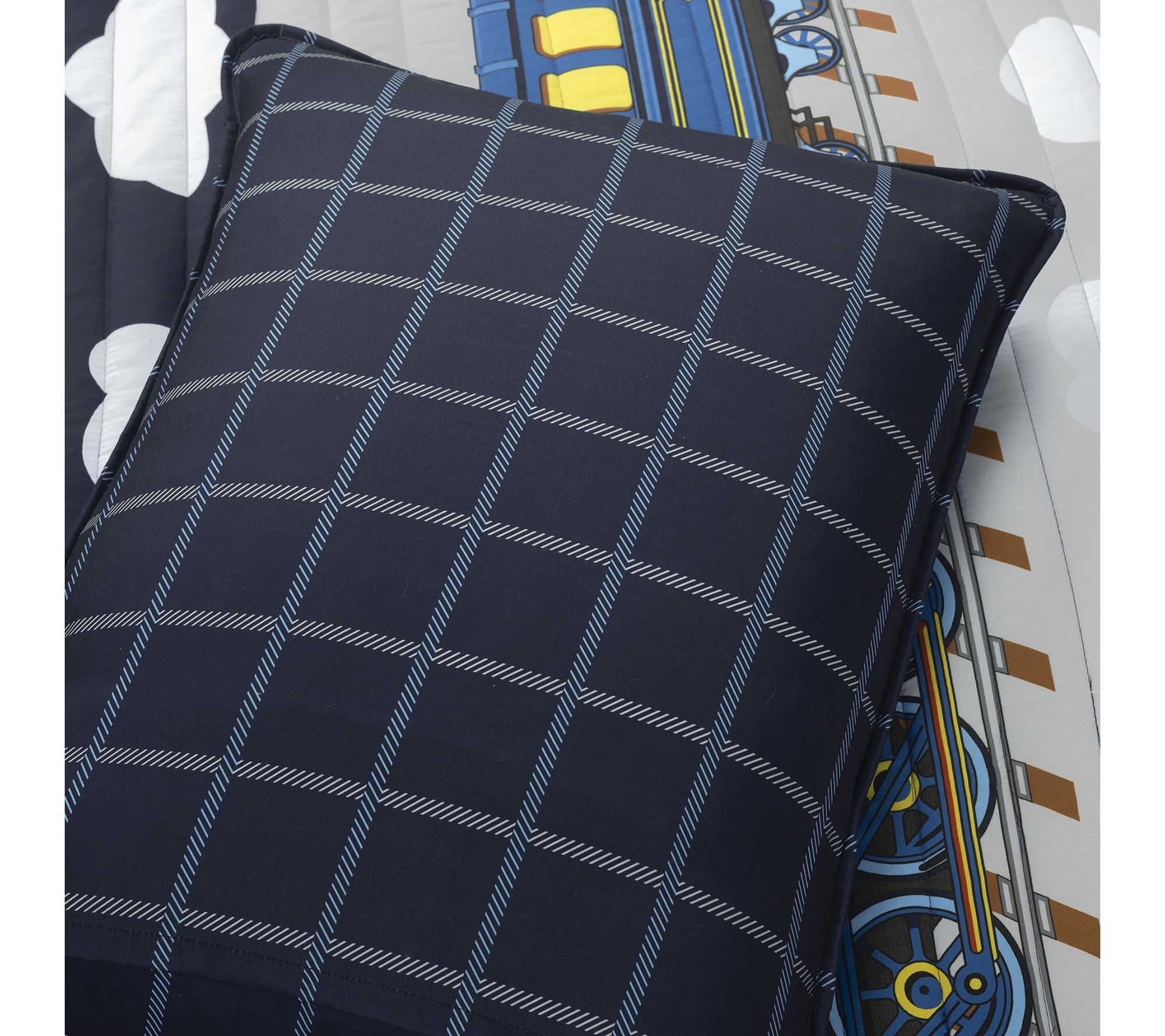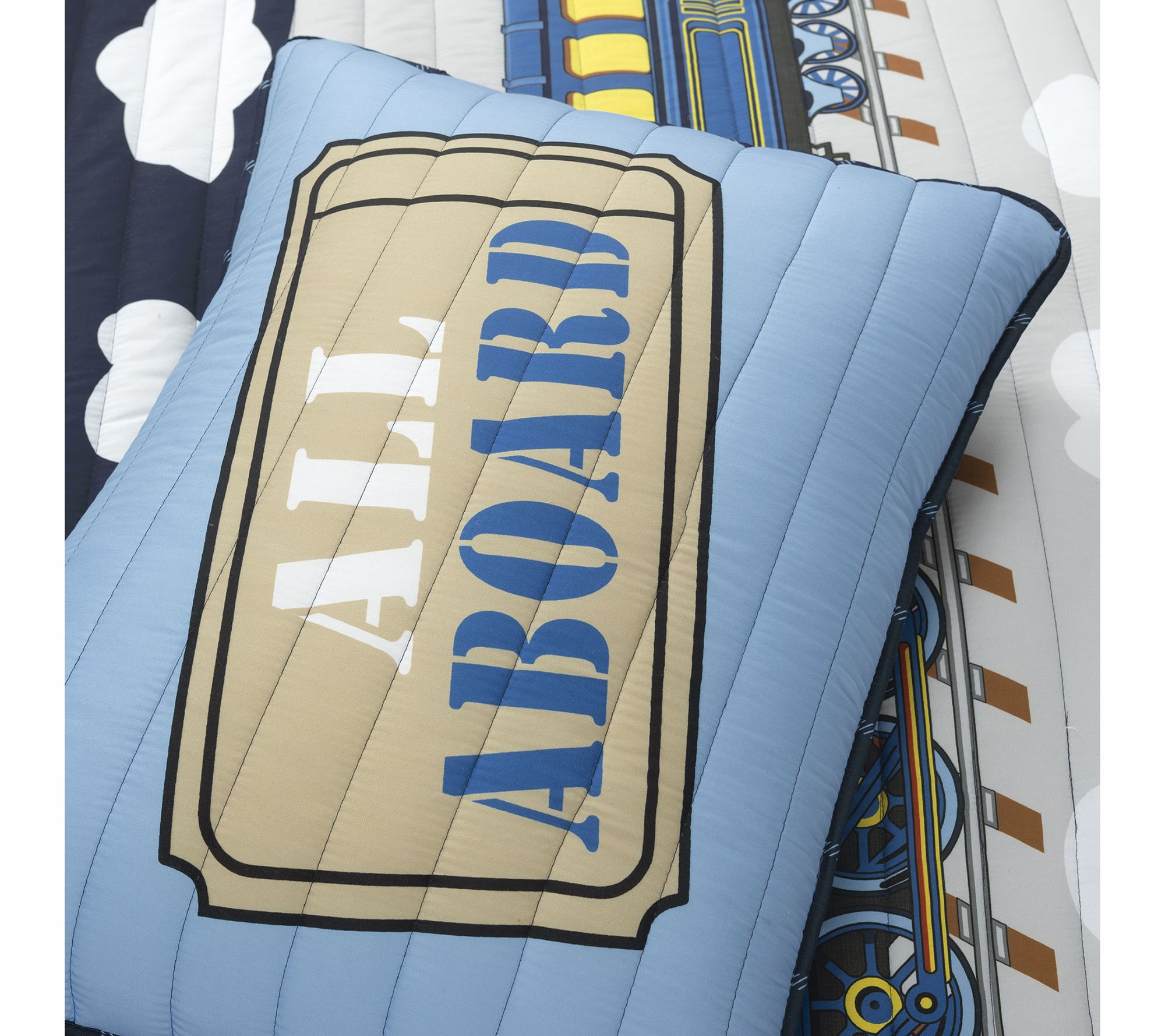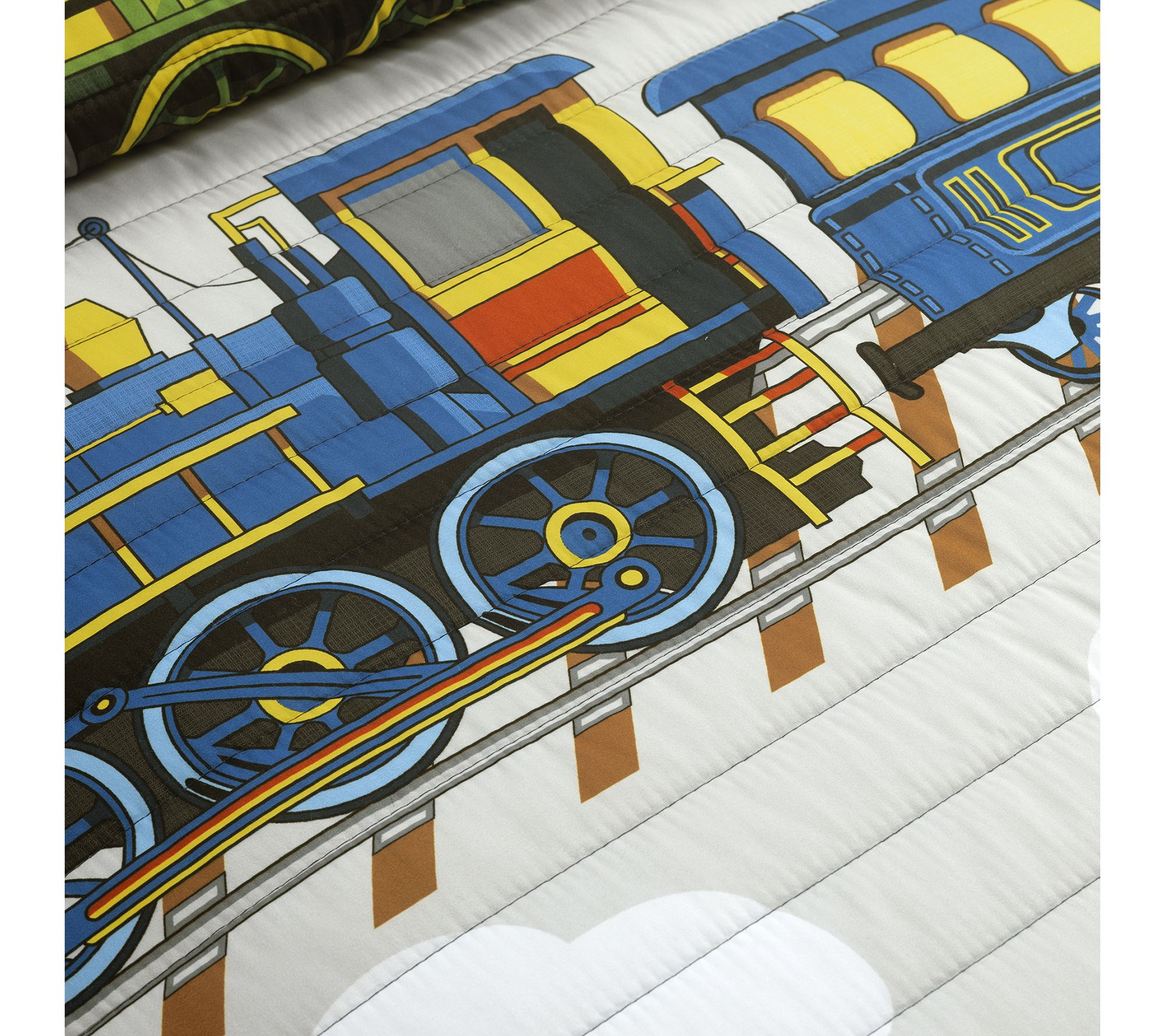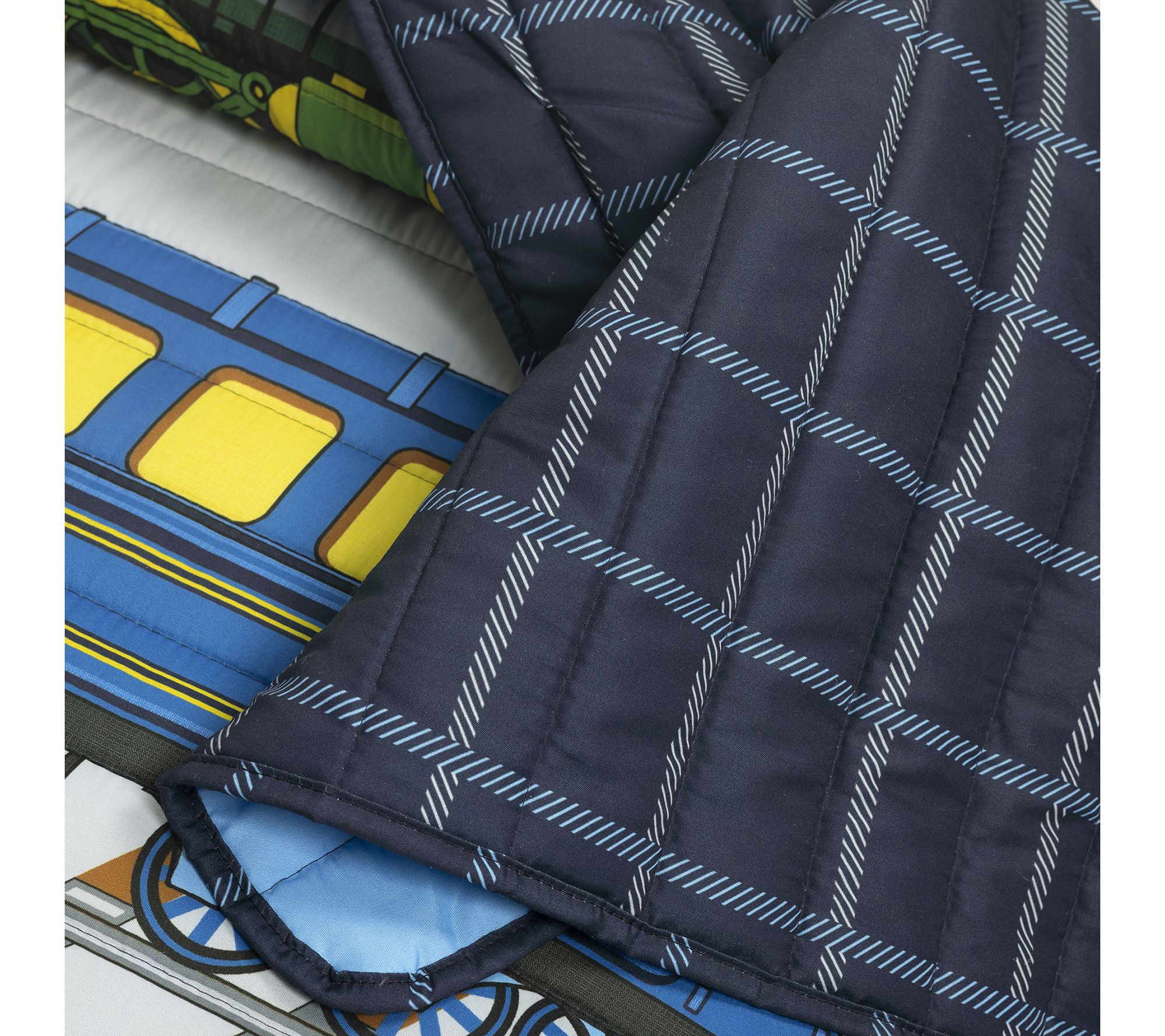 Chug ahead with the colorful Lush Decor Steam Trains Quilt Set! Your child will love the three vintage trains chugging along the tracks, paired with a reversible dark blue grid pattern for versatile styling. Perfect for any season, this lightweight set will keep your child comfortable while inspiring creativity and imagination. From Lush Decor.
