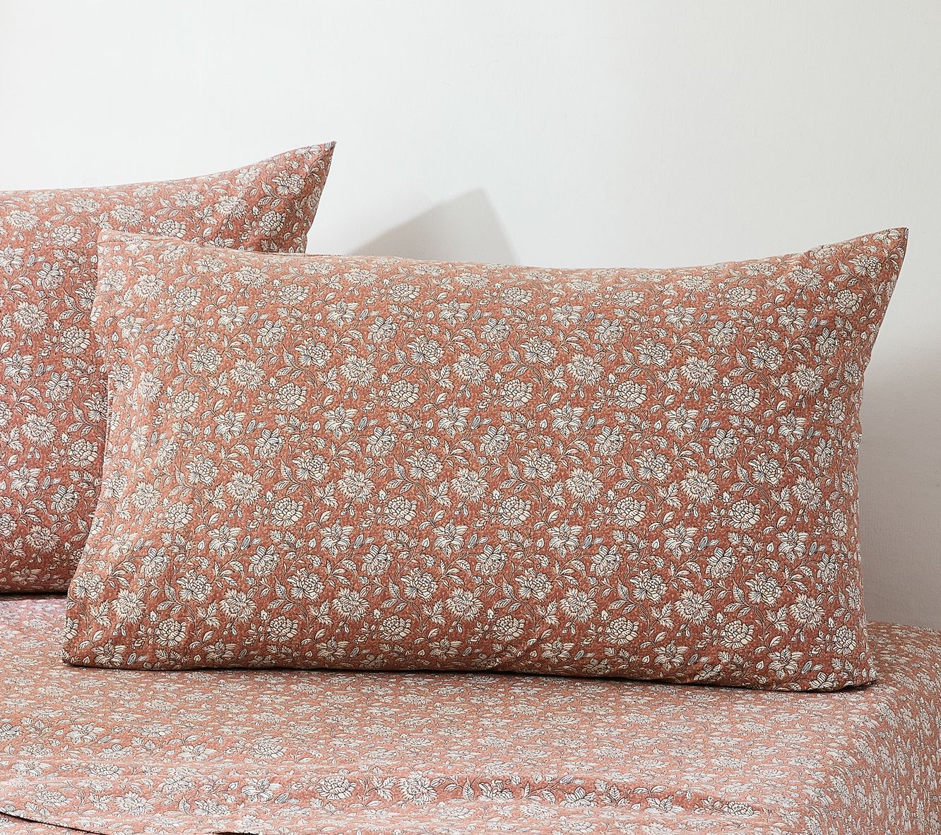 • Floral block print design complements cottage and vintage decor