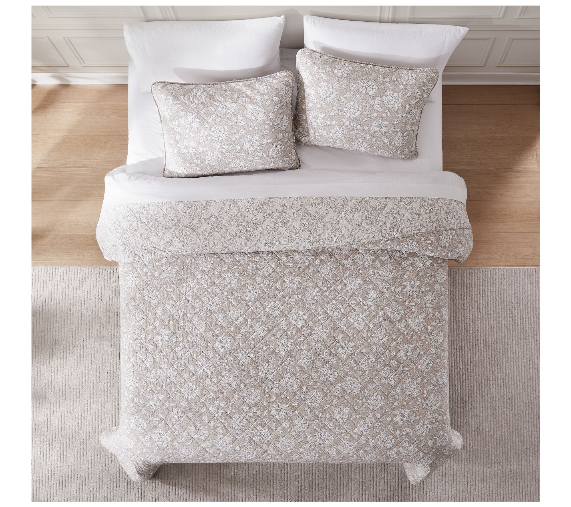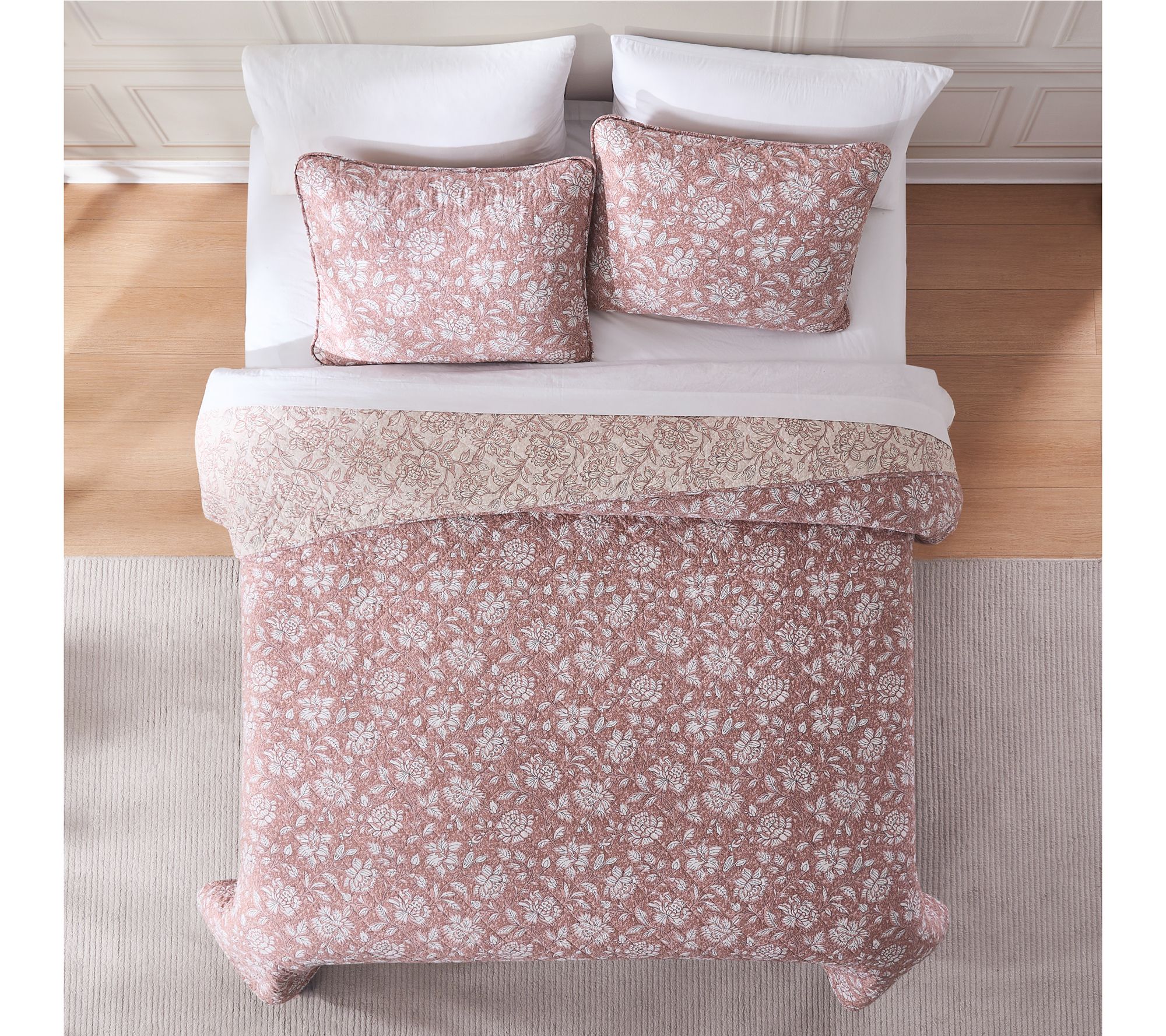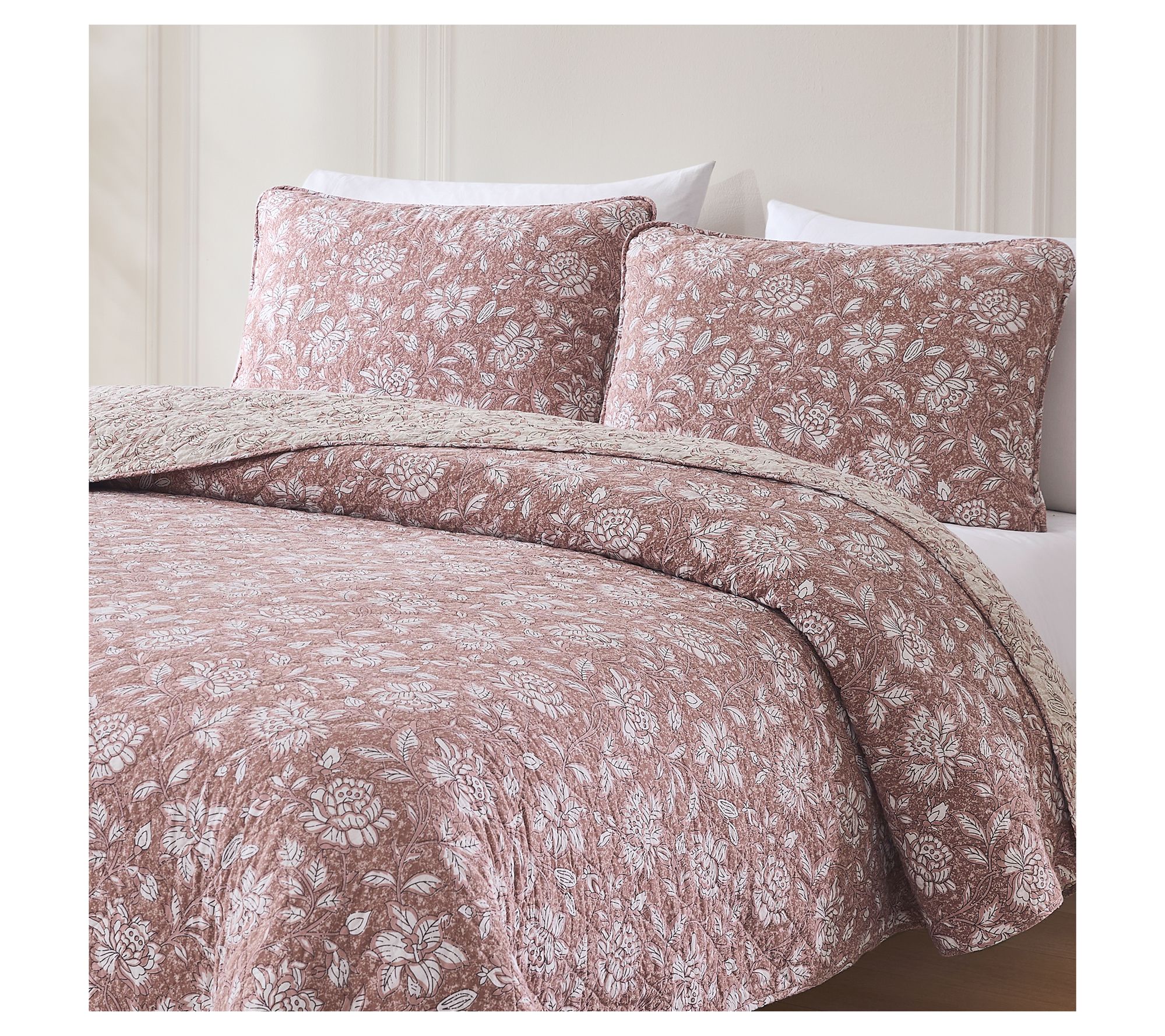 Soft floral details bring effortless charm to your bedroom with this reversible quilt set, offering two distinctive looks in one for easy style shifts. Crafted from 100% cotton, its cozy texture and delicate block print blend beautifully with both boho and modern spaces. Ready to refresh your sleep sanctuary or add a layer of warmth to guest beds. From Lush Decor.