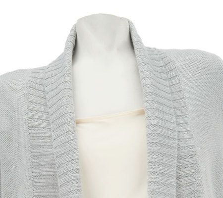 • Shawl collar with rib detail down placket and along hem, fully fashioned 3/4-length sleeves