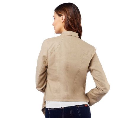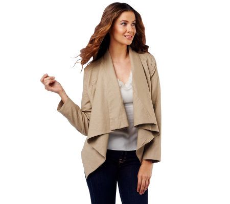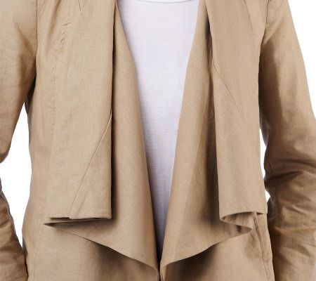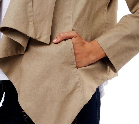 Flow with it. An eye-catching draped lapel dresses up this linen blend jacket with easy-breezy style. Slip pockets and seaming detail finish off the fashionable cover-up. From Rachel Zoe.