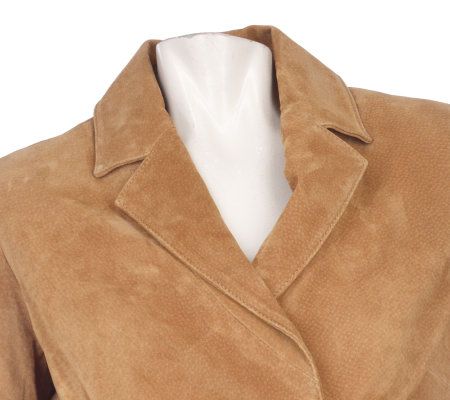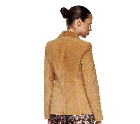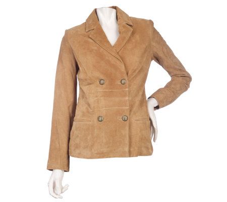 Feel polished and posh each time to step out on the town in this double-breasted suede jacket. Decorative seaming on the front, two front slip pockets, and a notched collar make this the perfect finishing touch over a sweet dress or jeans and a tee. From Rachel Zoe.