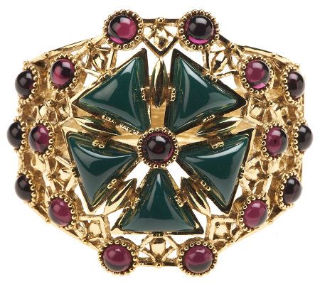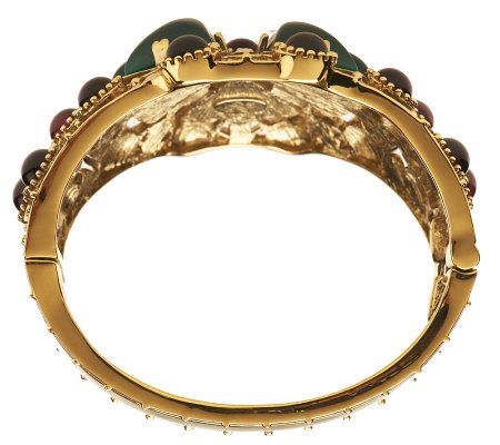 • High-polished, tapered hinge bangle; floral openwork design with triangular and round colored cabochons; additional round colored cabochons scattered throughout; antiqued finish