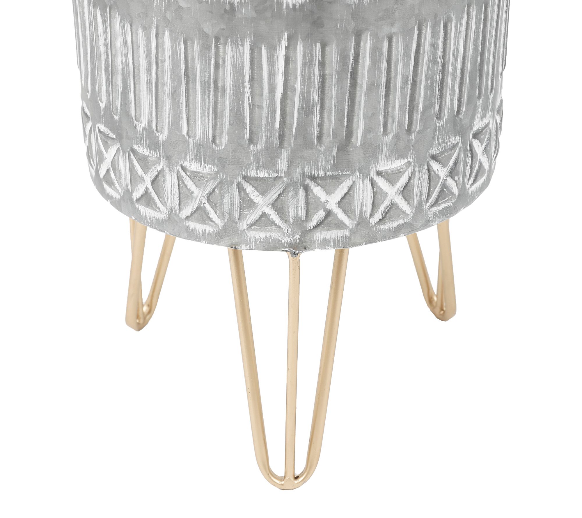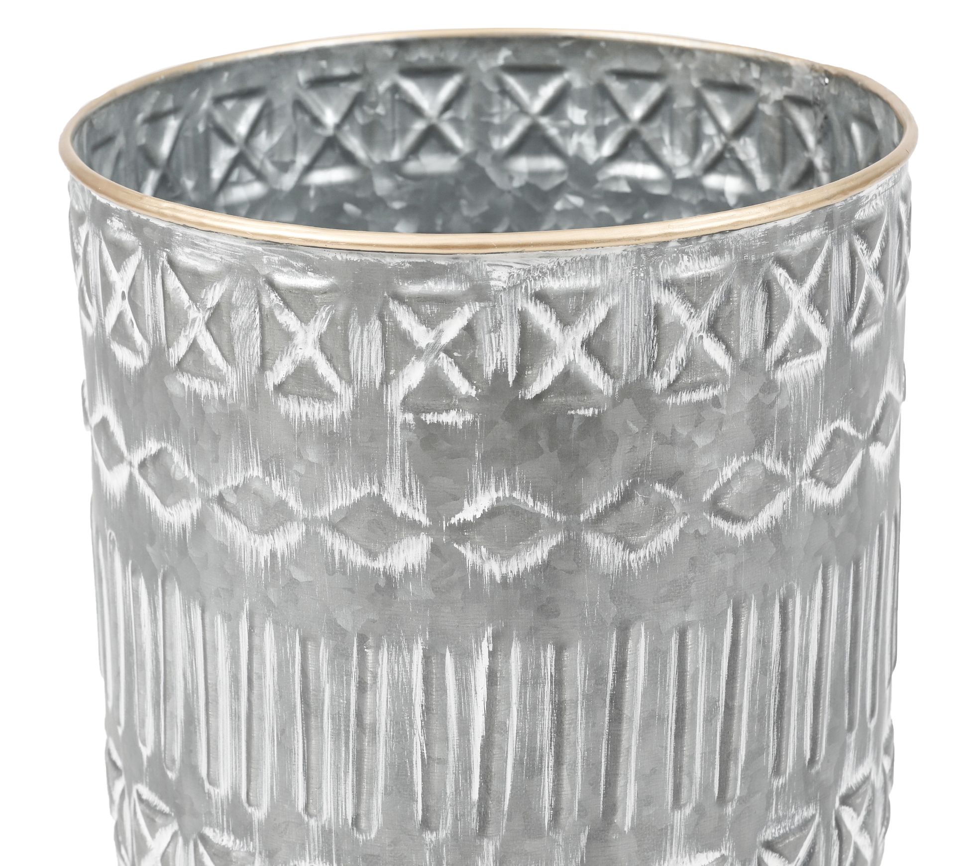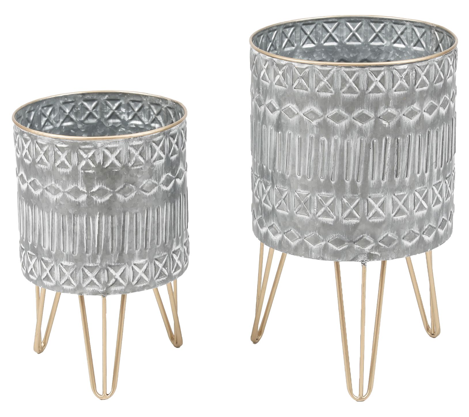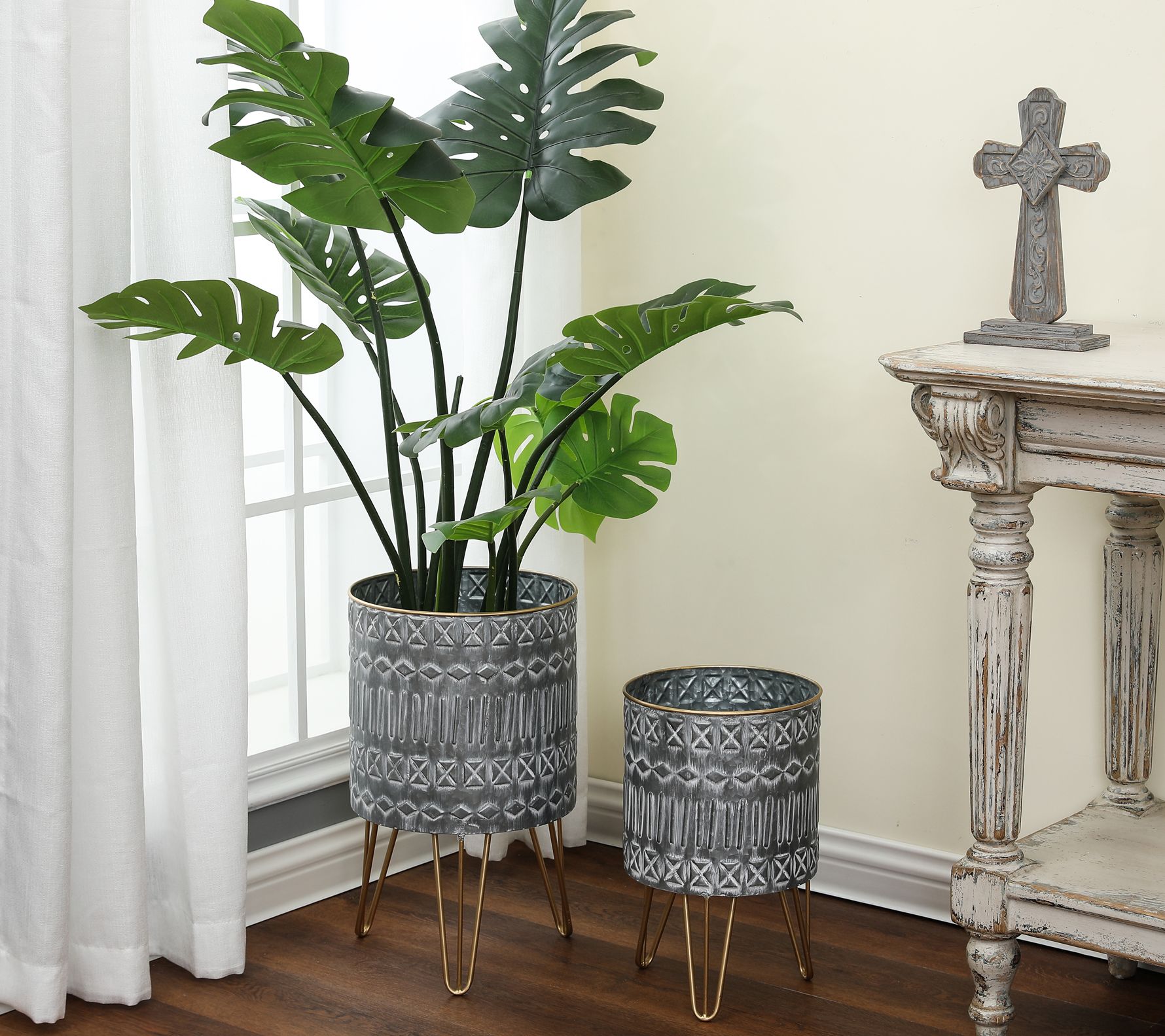 Elevate your greenery in these two metal cache pot planters featuring a cool Aztec design in a gray finish with goldtone trim. From Luxen Home.