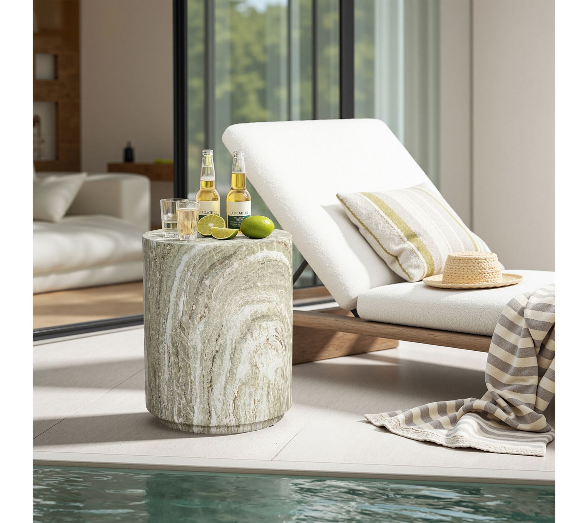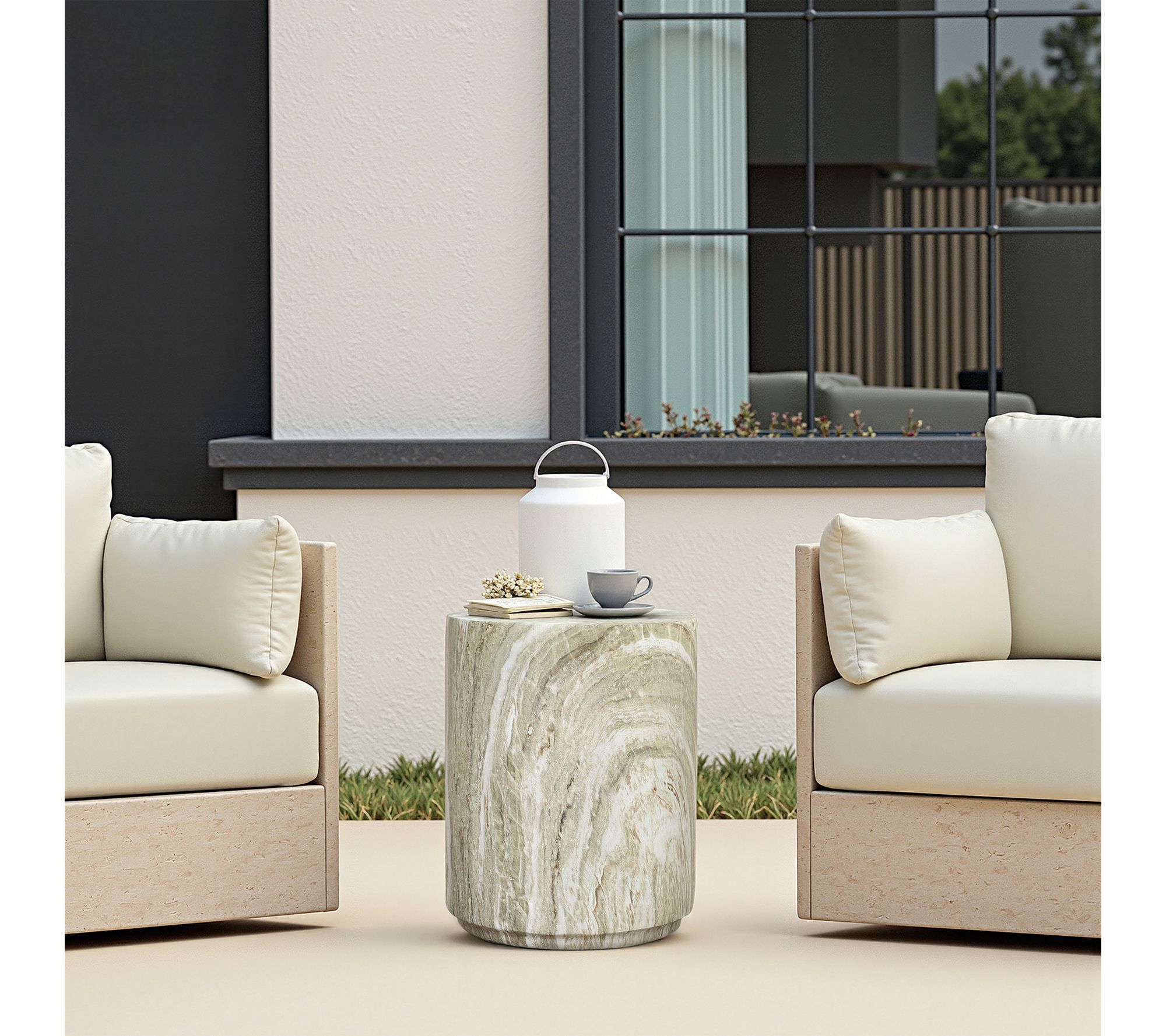 Set the scene for relaxing afternoons or gatherings with friends by featuring this round patio side table, a versatile accent that works beautifully outdoors or inside your home. The marbled green and white design adds a sculptural, refreshing look to any lounge space, while its lightweight construction makes moving it a breeze. Place snacks, drinks, or a favorite plant atop the smooth faux-marble surface for effortless style and functionality. From LuxenHome.