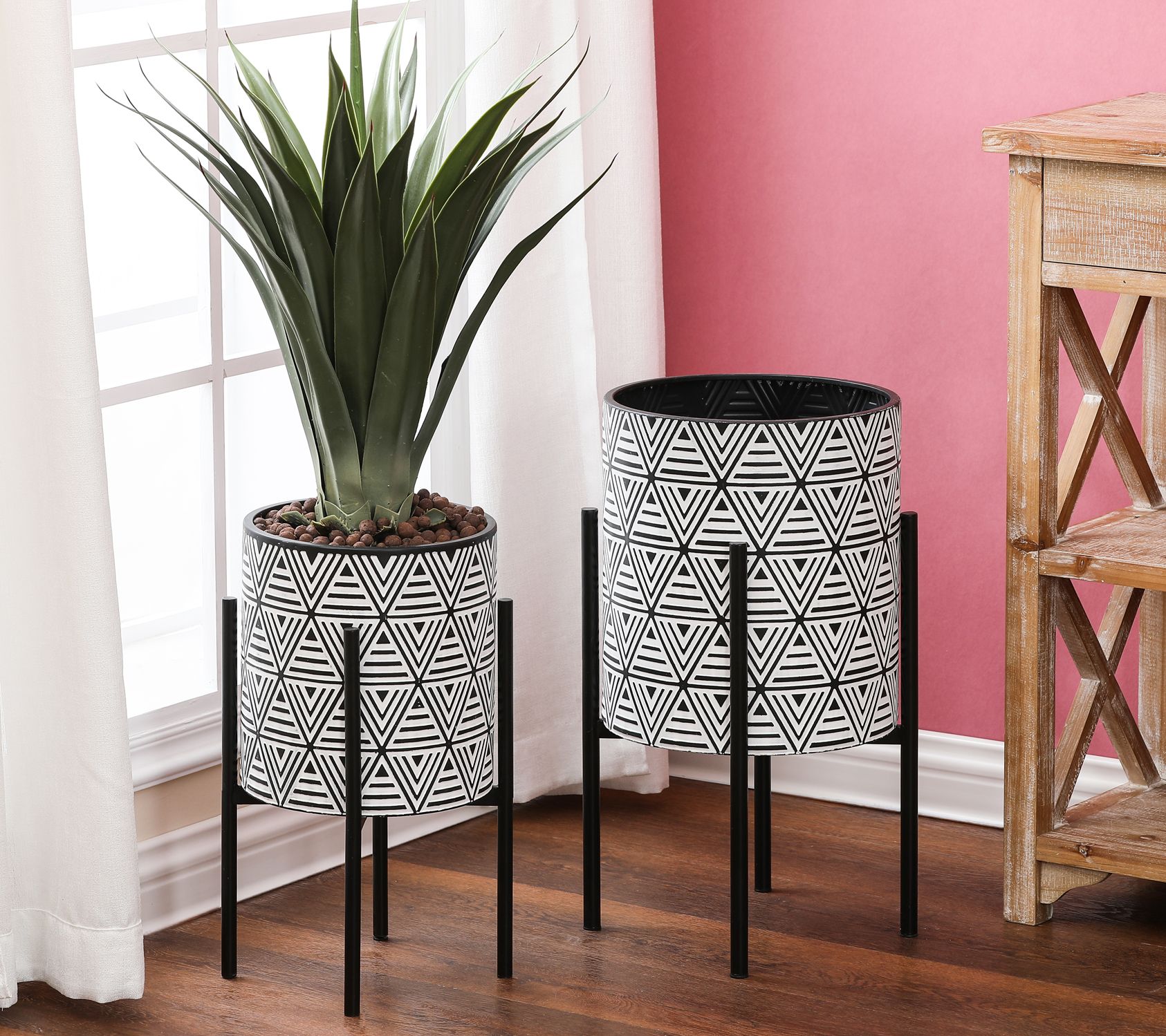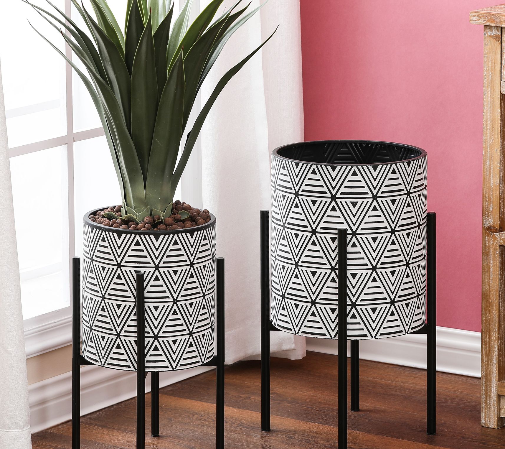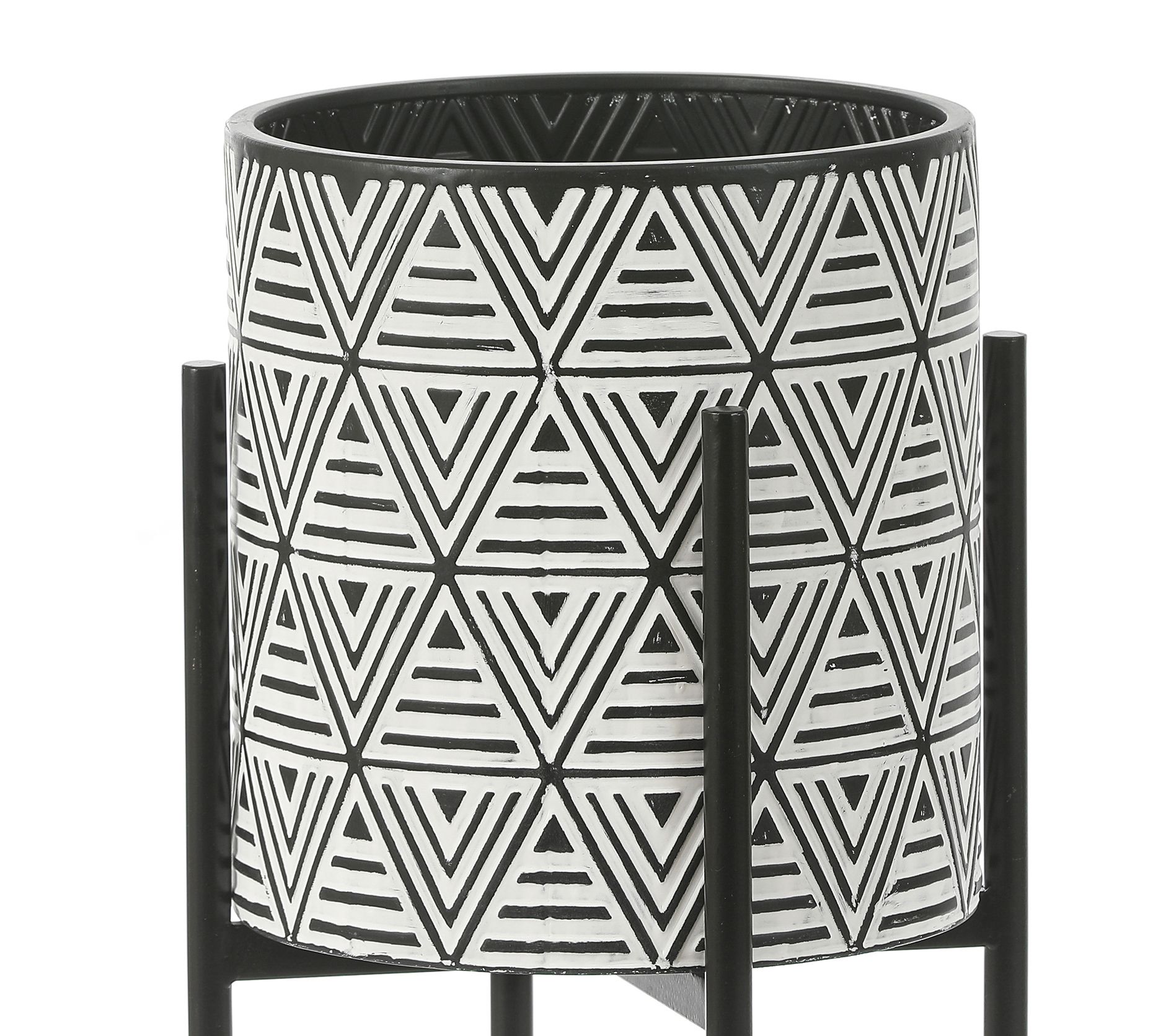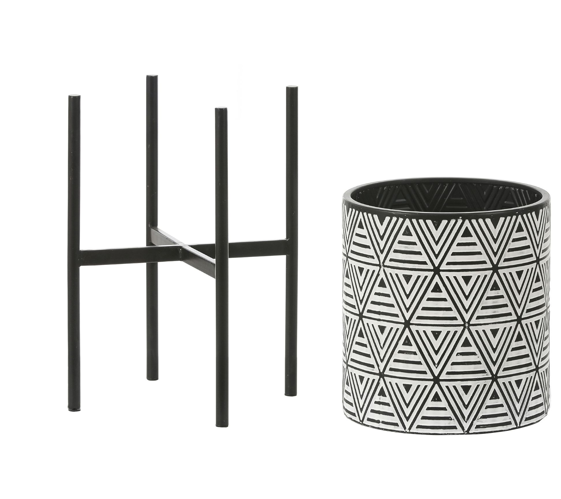 Bring bold, mid-century modern design to your home with this set of cachepots and stands, featuring black and white triangles with lines in an embossed motif that adds style to any room. From LuxenHome.