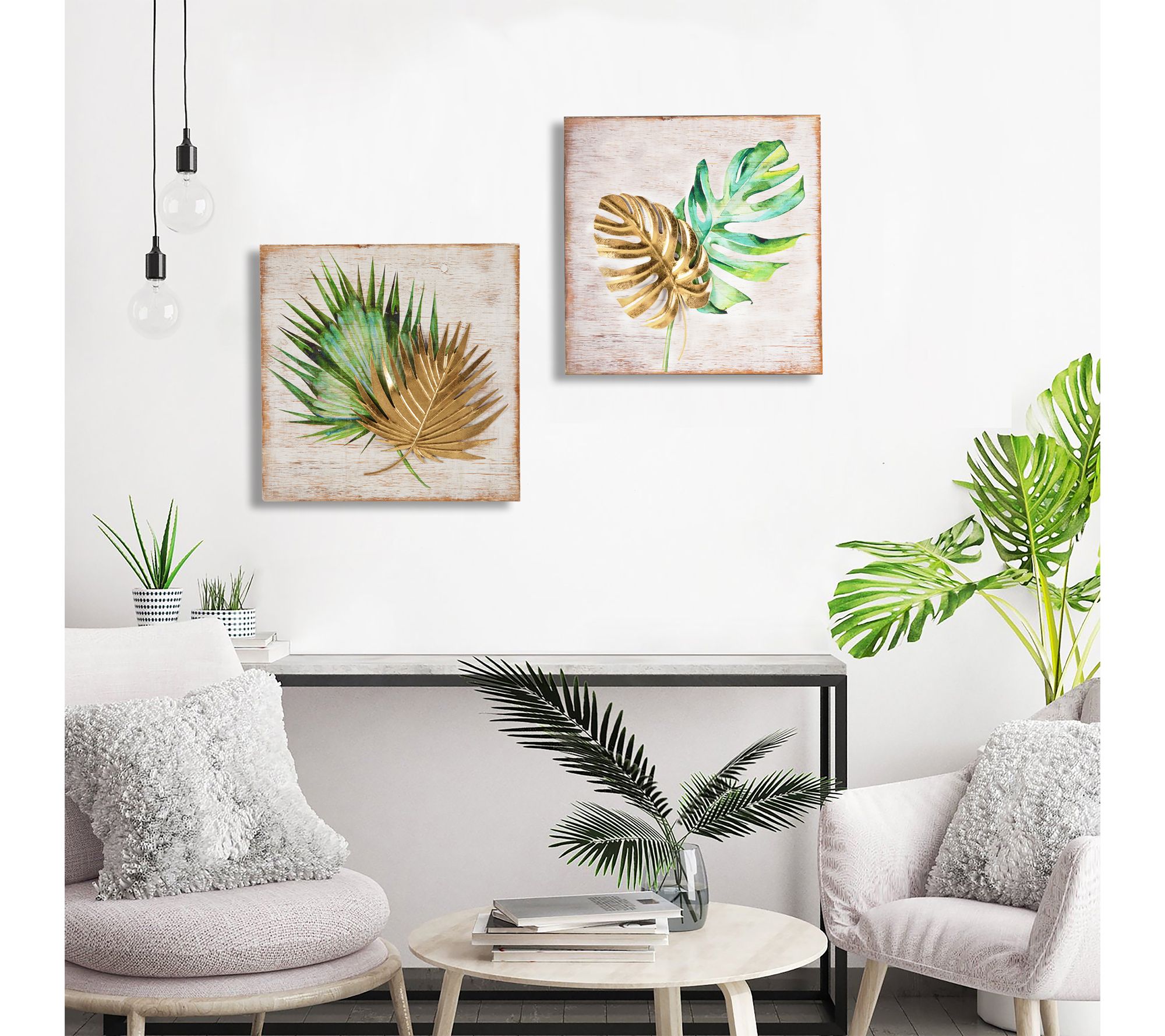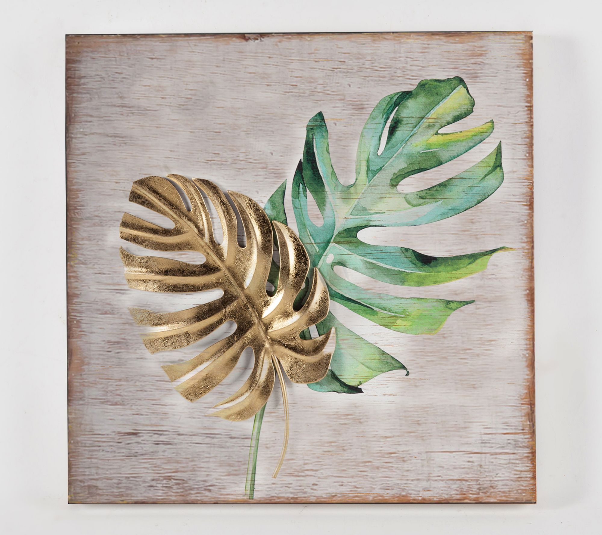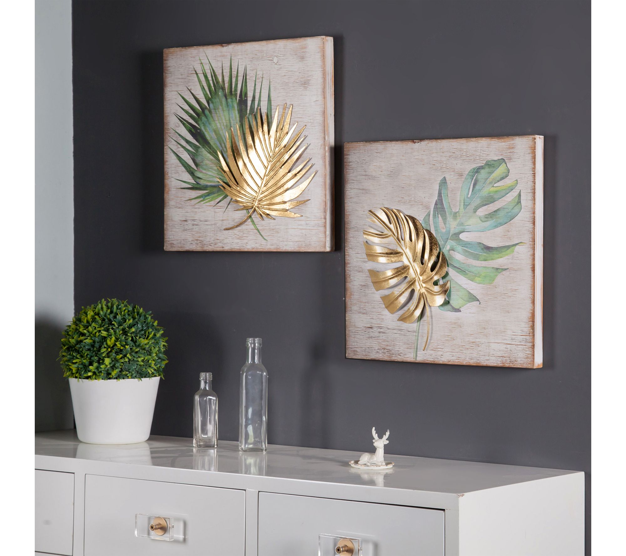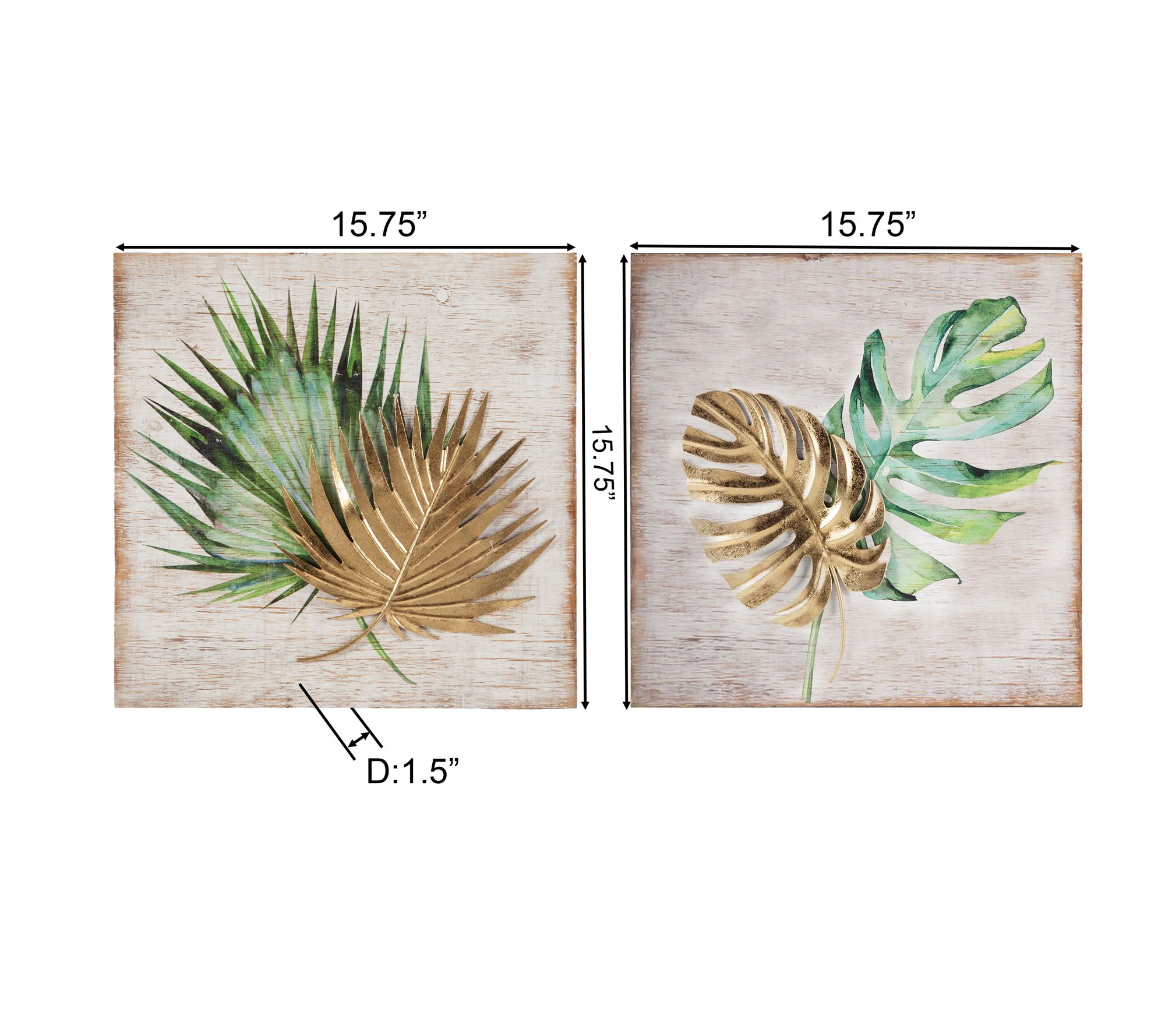 Let lush tropical vibes fill your home with this eye-catching wall decor set. Featuring painted green leaves paired with goldtone metal accents, the coordinating panels make an inviting statement in your entryway, bedroom, or living space. Style them side by side or display individually to bring vibrant color and energy to any room. From LuxenHome.