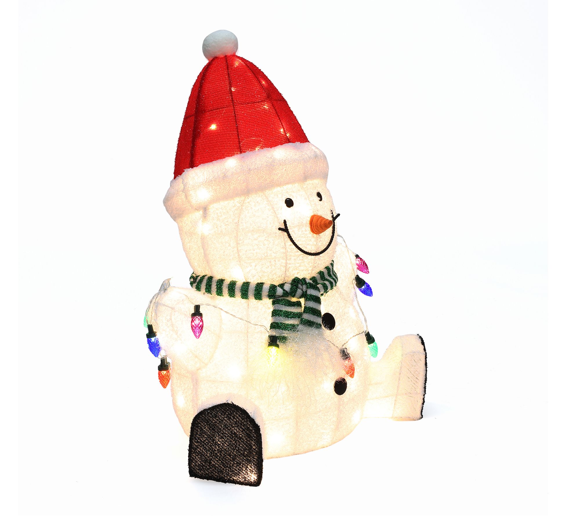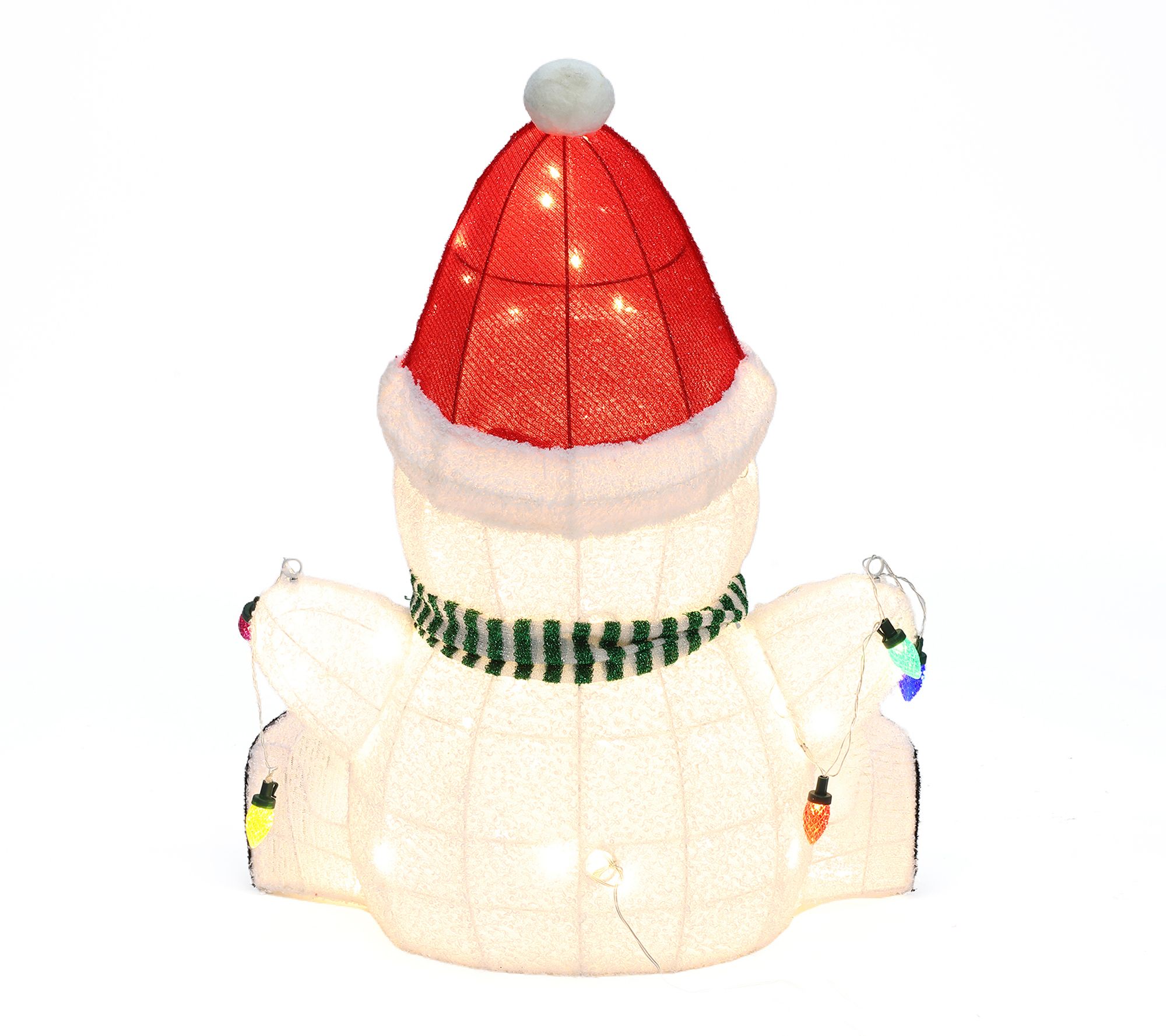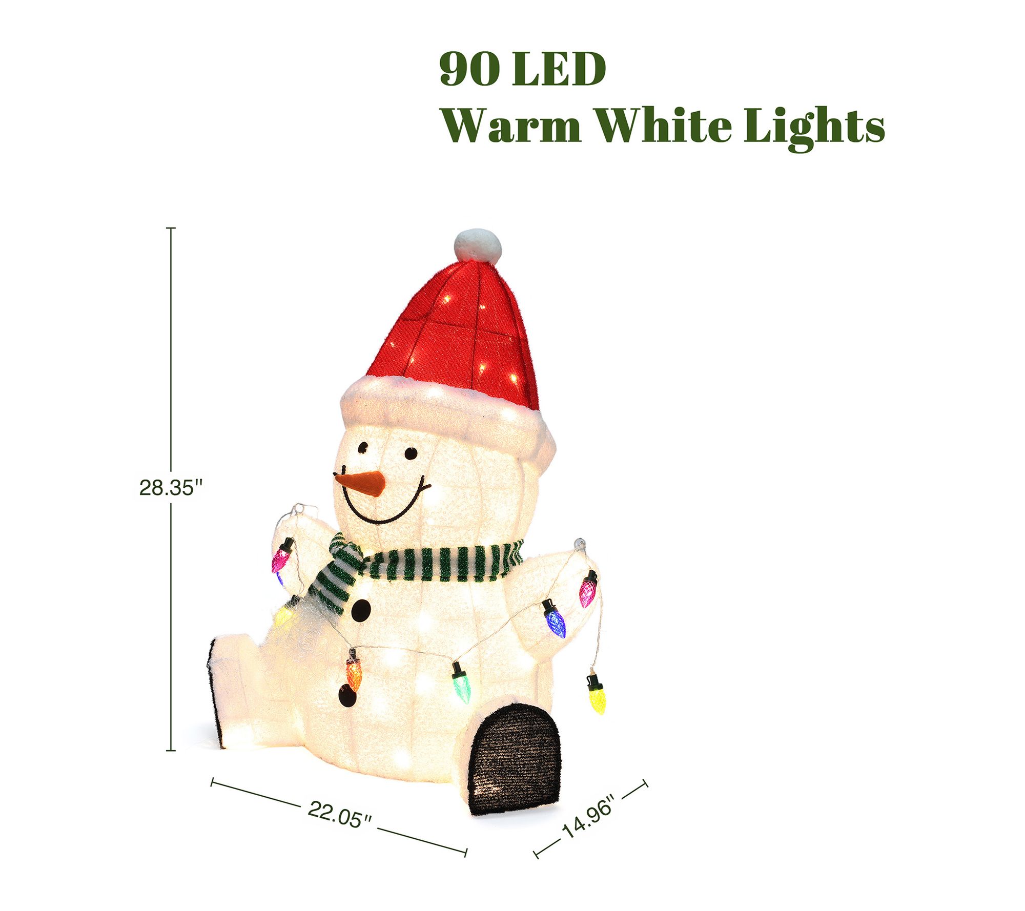 Transform your home or yard into a winter wonderland with this festive Christmas snowman decoration. Dressed in a cheerful Santa hat and striped scarf, this snowman welcomes friends and family with a glowing string of holiday lights, spreading joy wherever he stands. Ninety warm white LEDs illuminate his friendly smile for added holiday charm. From LuxenHome.