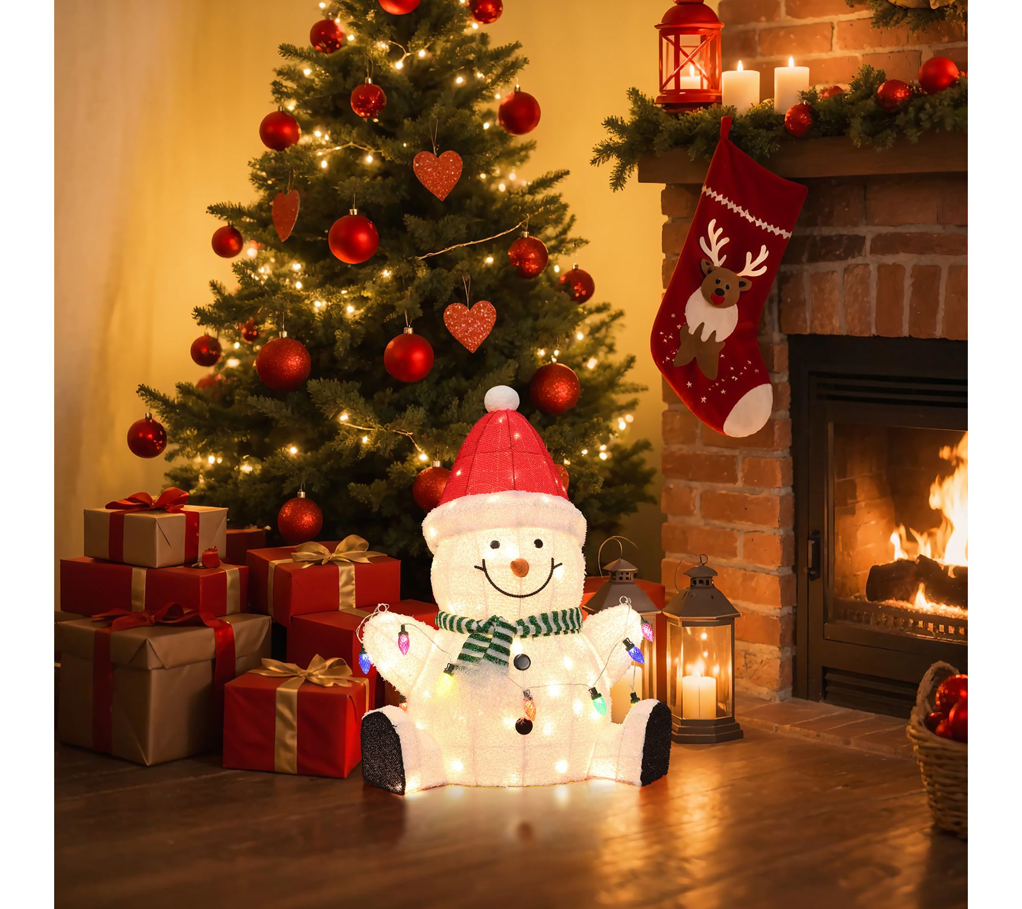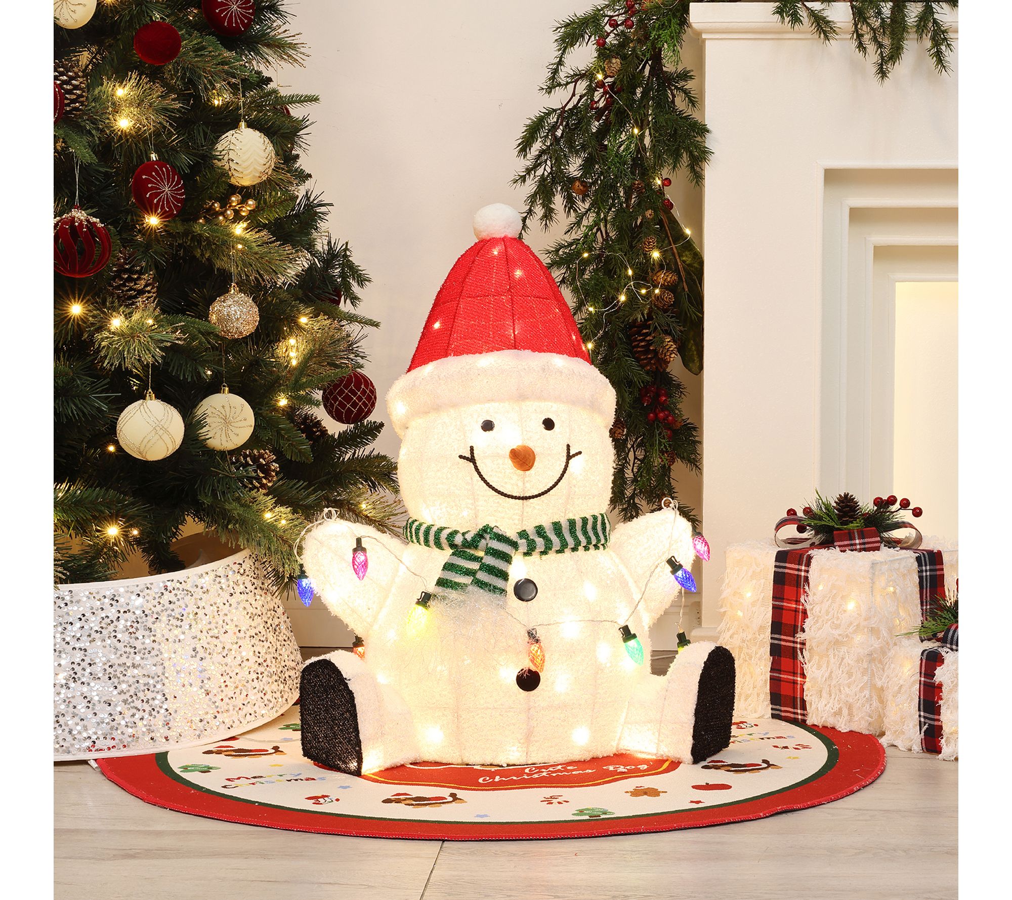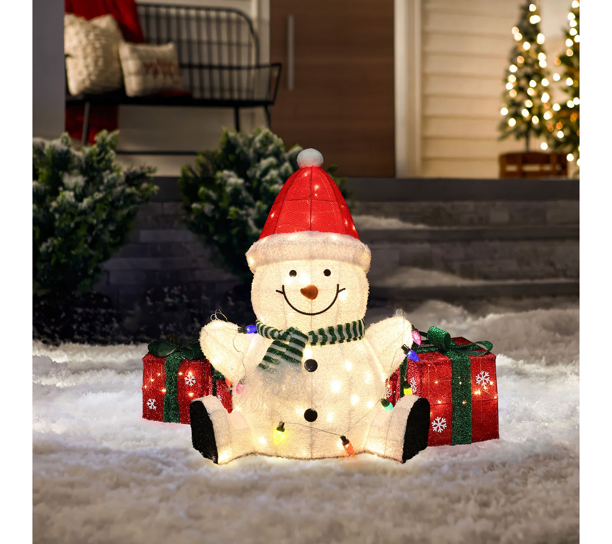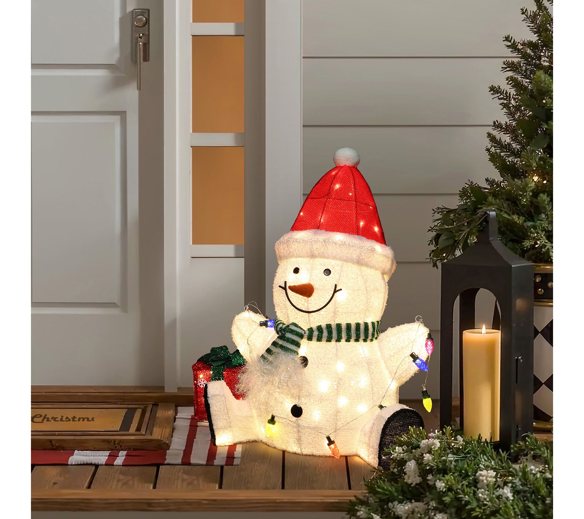 Transform your home or yard into a winter wonderland with this festive Christmas snowman decoration. Dressed in a cheerful Santa hat and striped scarf, this snowman welcomes friends and family with a glowing string of holiday lights, spreading joy wherever he stands. Ninety warm white LEDs illuminate his friendly smile for added holiday charm. From LuxenHome.