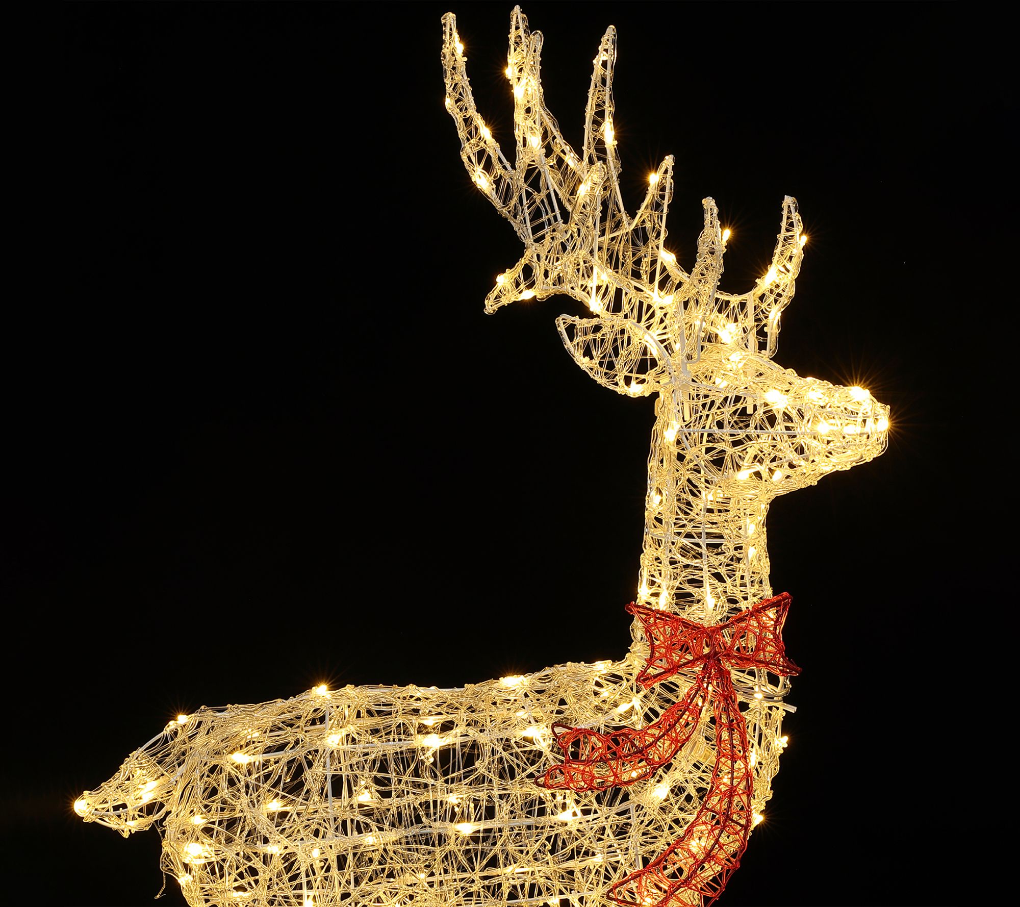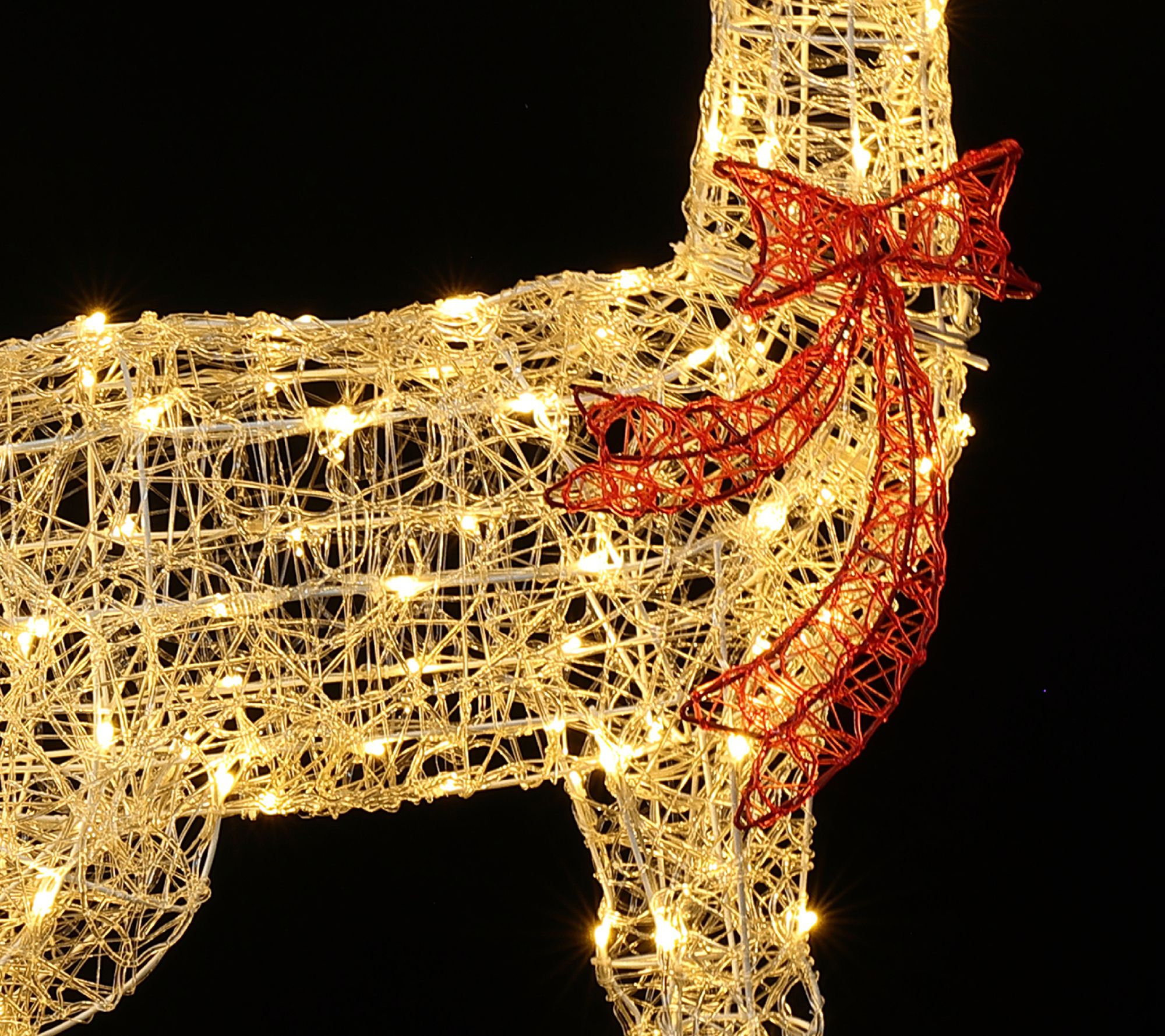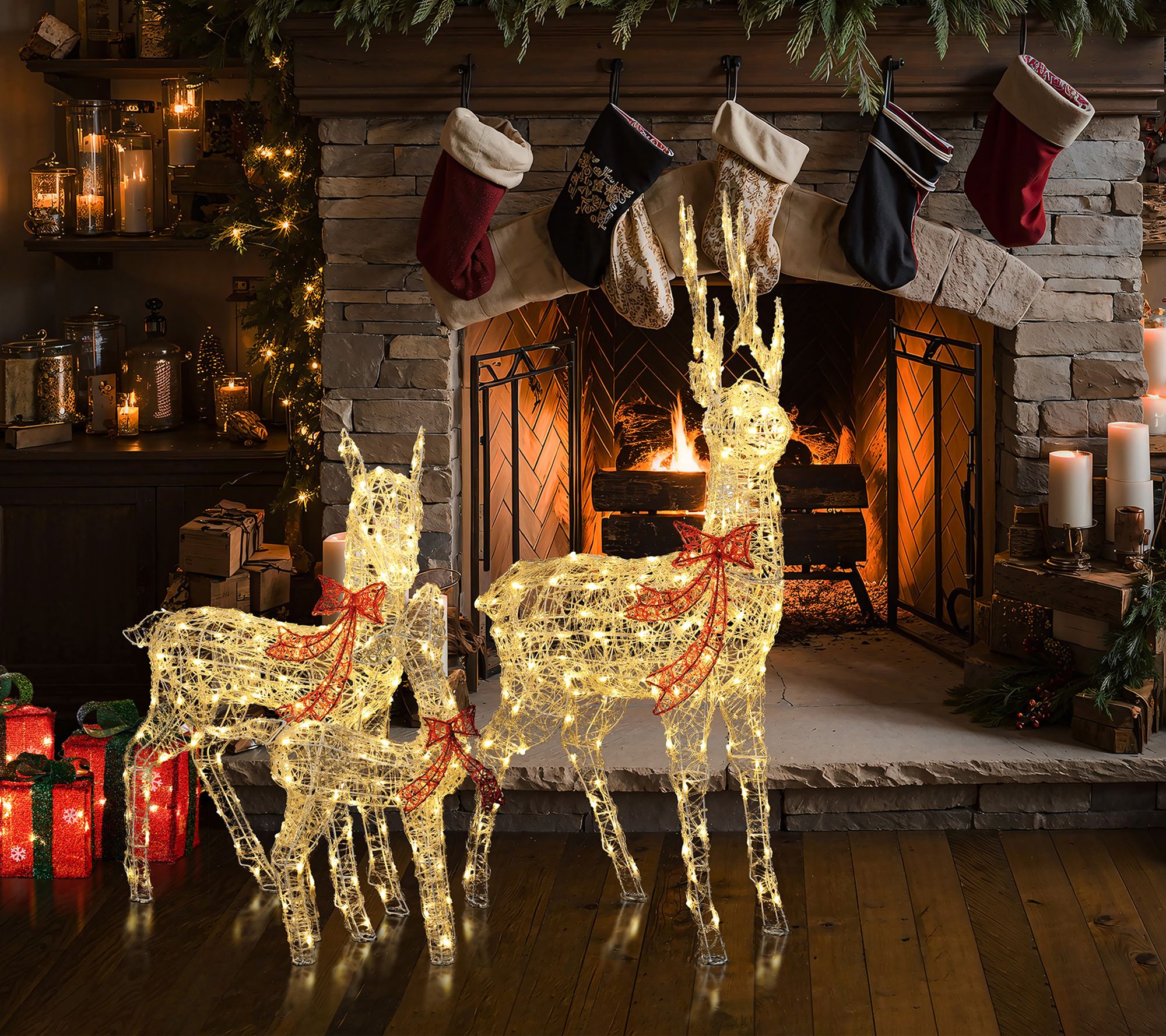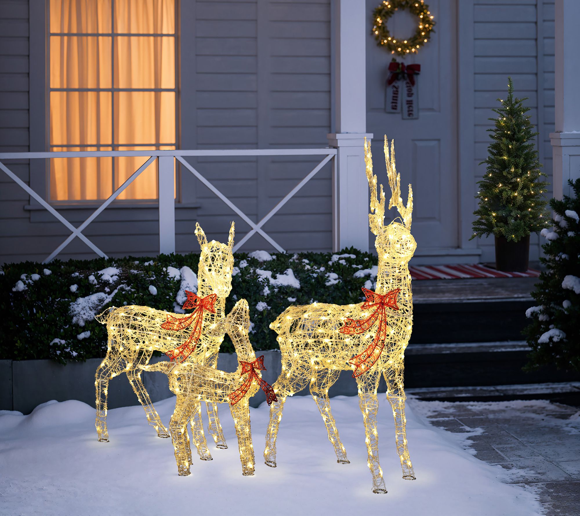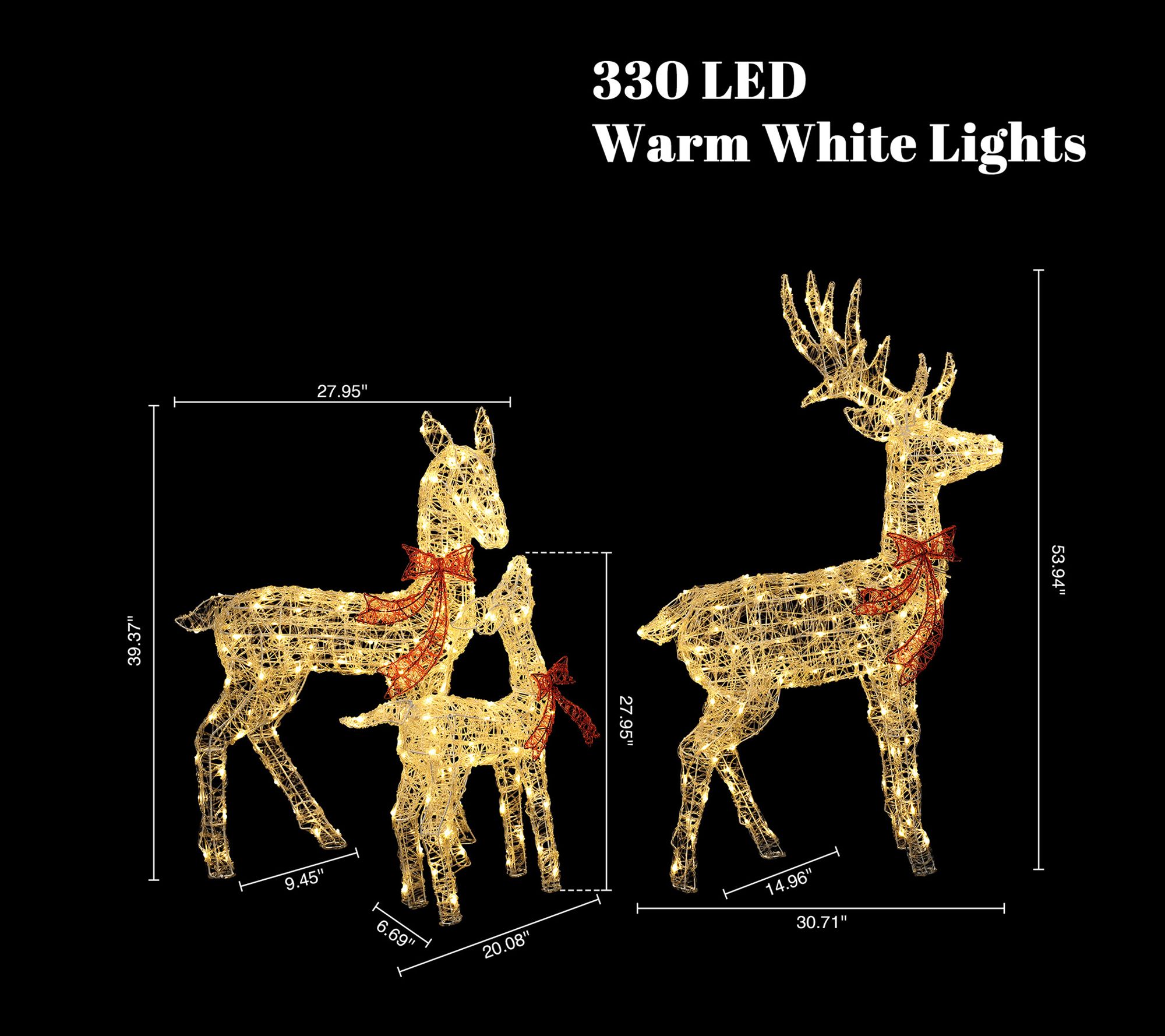 As twinkling lights dance across the yard, this 3-piece lighted deer decoration set transforms your outdoor space into a festive winter retreat. Each graceful deer, illuminated by 330 white LED lights and adorned with bright red bows, creates a welcoming atmosphere for holiday gatherings on the lawn or porch. The set brings a cheerful glow and adds joyful spirit to your seasonal decor. From LuxenHome.