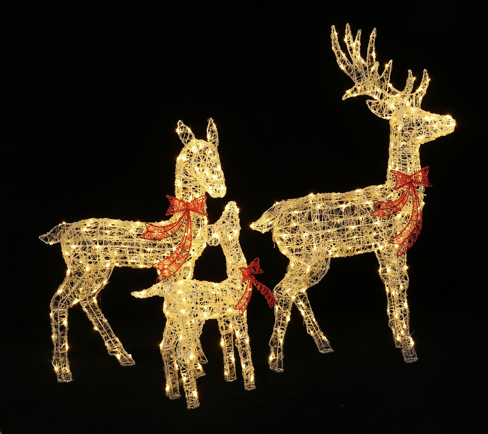 Measures: large deer 53.94" H x 30.71" W x 14.96" D; medium deer 39.37" H x 27.95" W x 9.45" D; small deer 27.95" H x 20.08" W x 6.69" D; overall cord 16'L