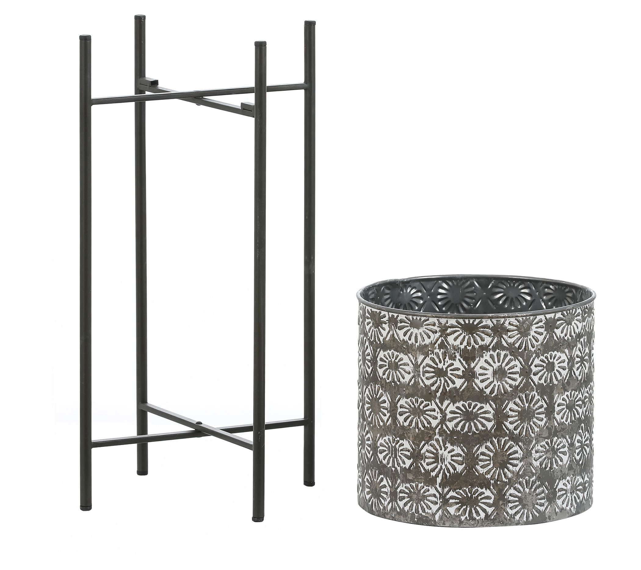 Get that decorator look and enrich any indoor space with the varied heights of this three-piece metal cachepot planter set. Each cachepot planter features a stamped floral classic design in a distressed gray finish for a rustic look, and sits on four black straight legs with an X shape for added stability, exuding a stunning industrial charm. From LuxenHome.