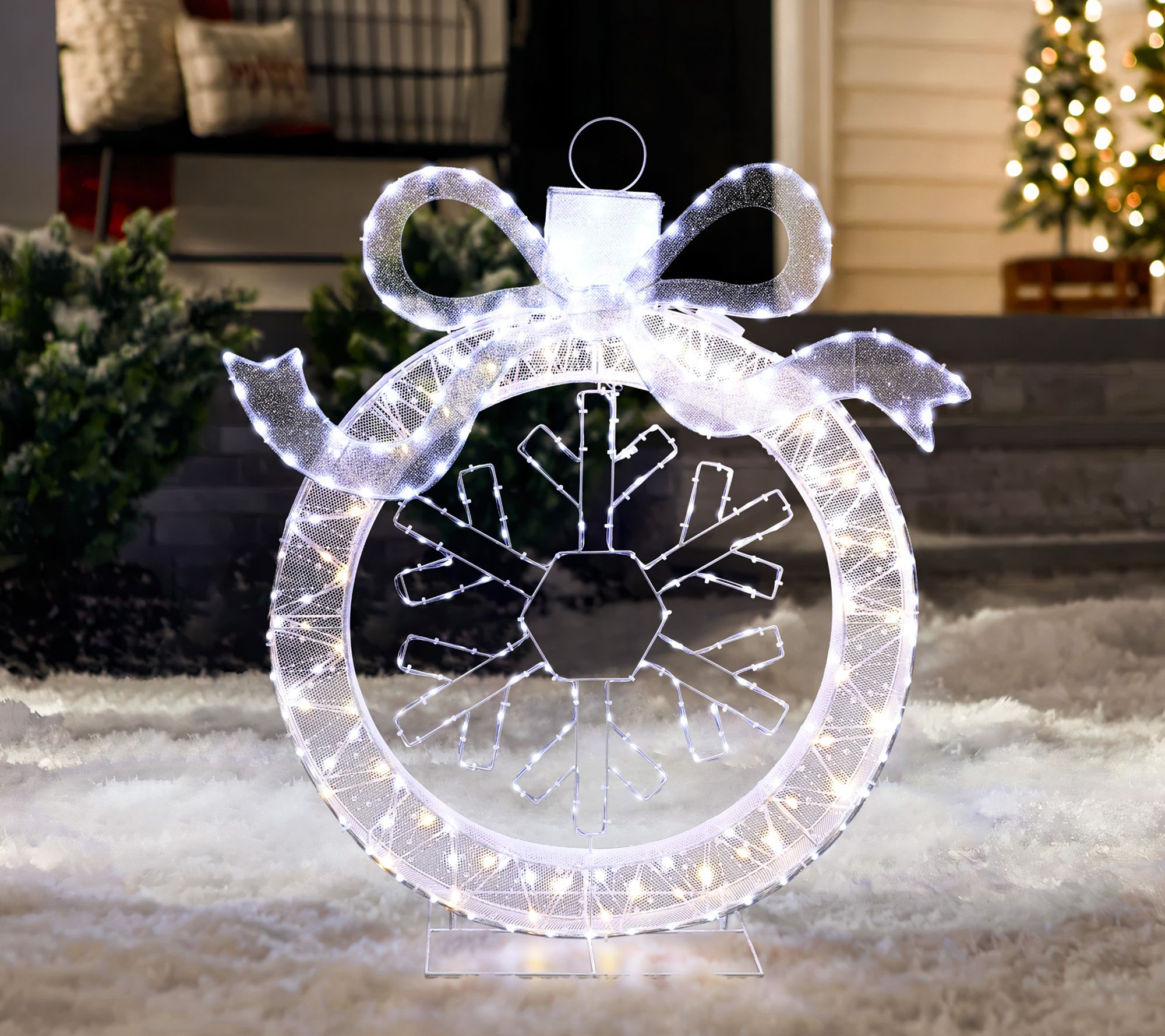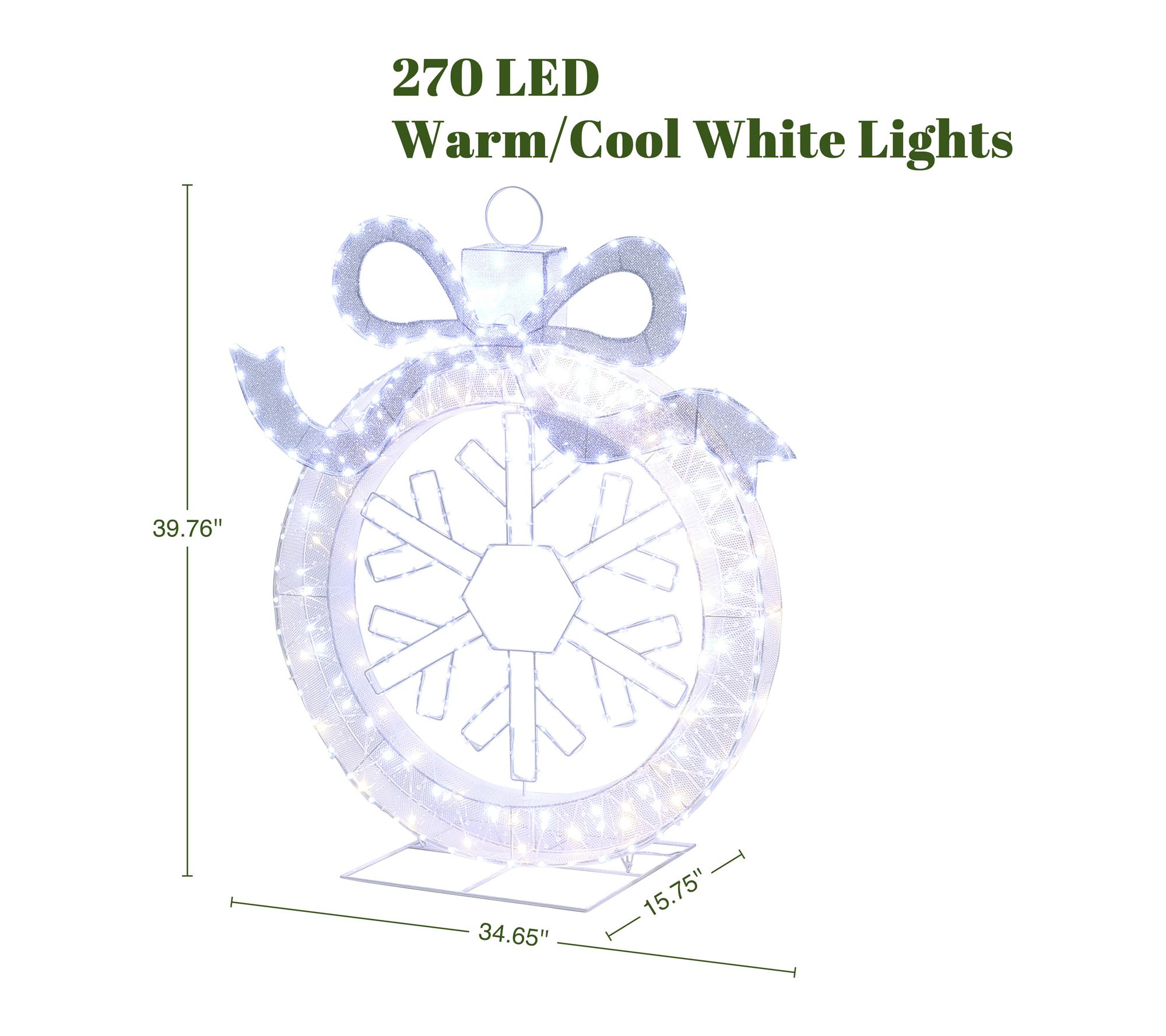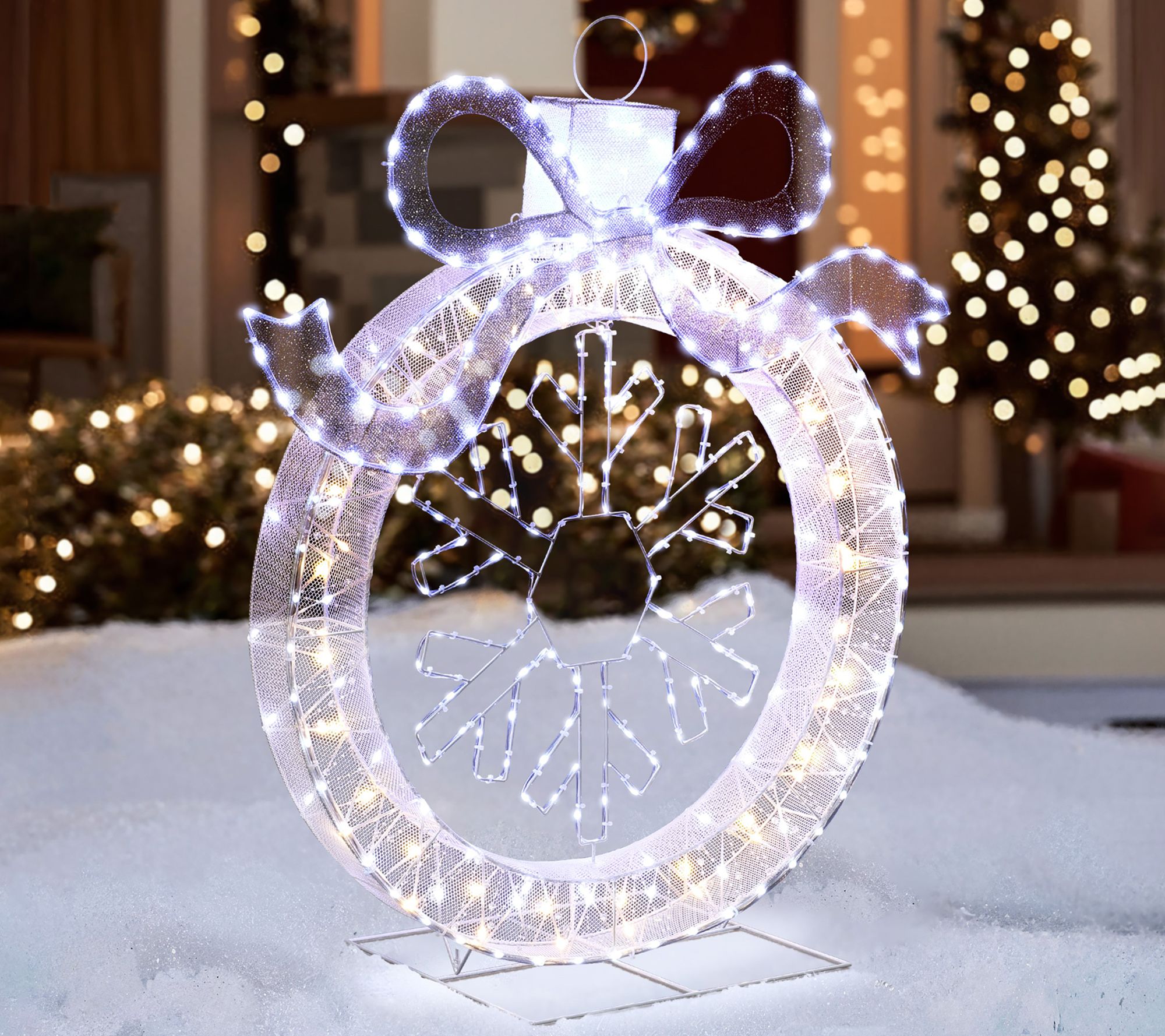 Bring the spirit of the season home with this lighted ornament snowflake wreath decoration. Brilliantly illuminated by 270 LED lights in both warm and cool white tones, this oversized display adds dazzling cheer to your porch, front door, or living room window. The sparkling silver bow and delicate snowflake detail create a magical scene for holiday gatherings. From LuxenHome.