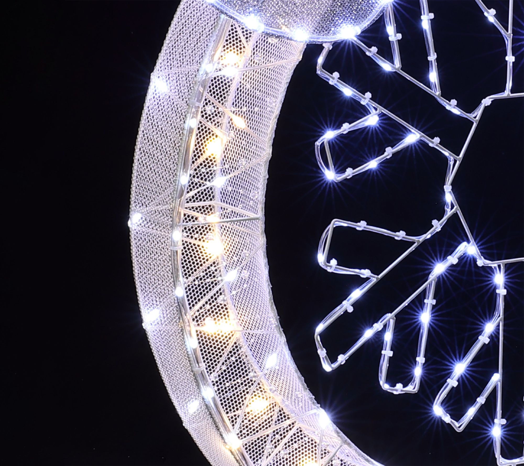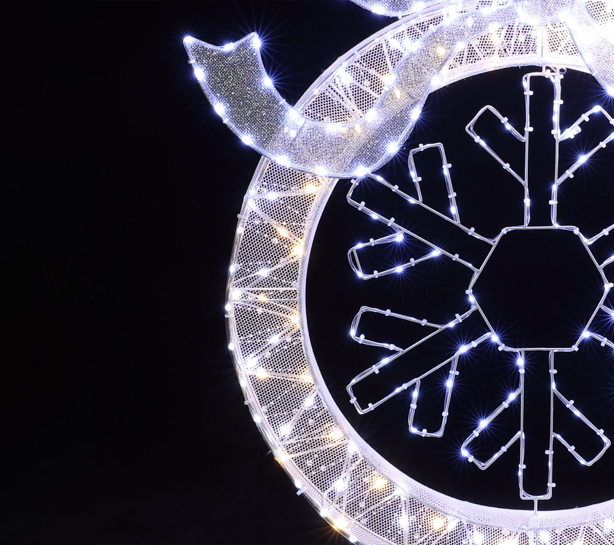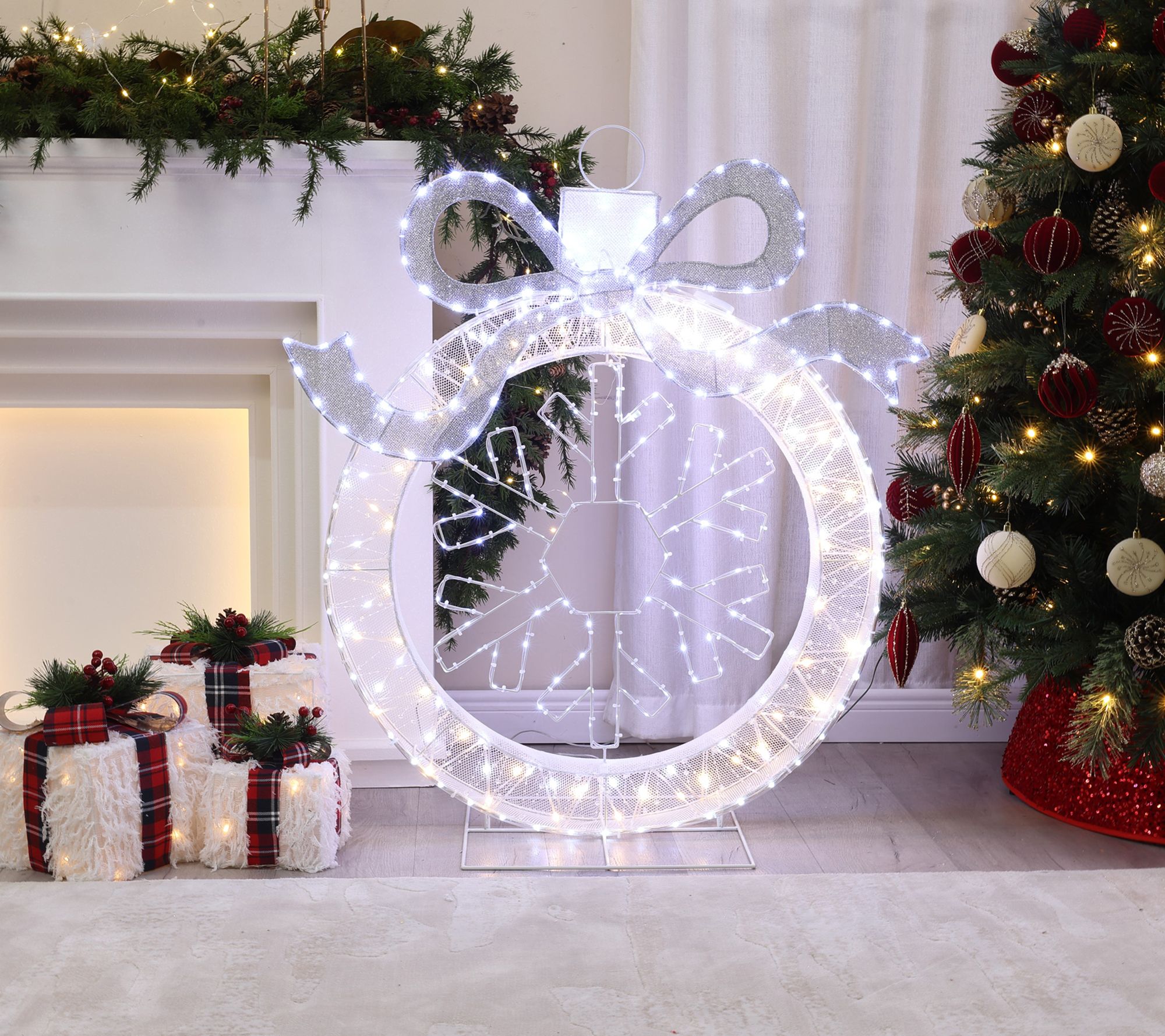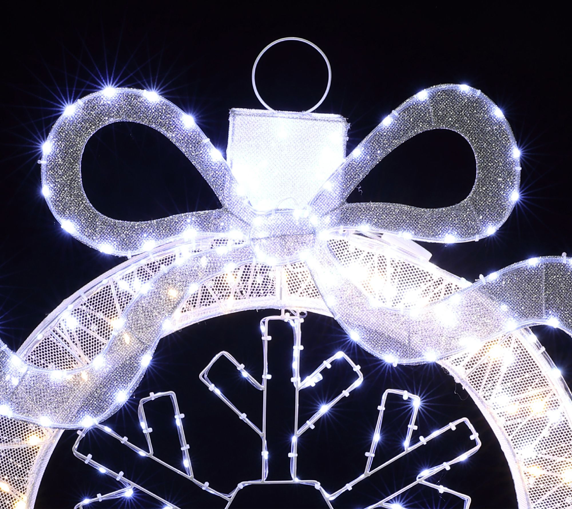 Bring the spirit of the season home with this lighted ornament snowflake wreath decoration. Brilliantly illuminated by 270 LED lights in both warm and cool white tones, this oversized display adds dazzling cheer to your porch, front door, or living room window. The sparkling silver bow and delicate snowflake detail create a magical scene for holiday gatherings. From LuxenHome.