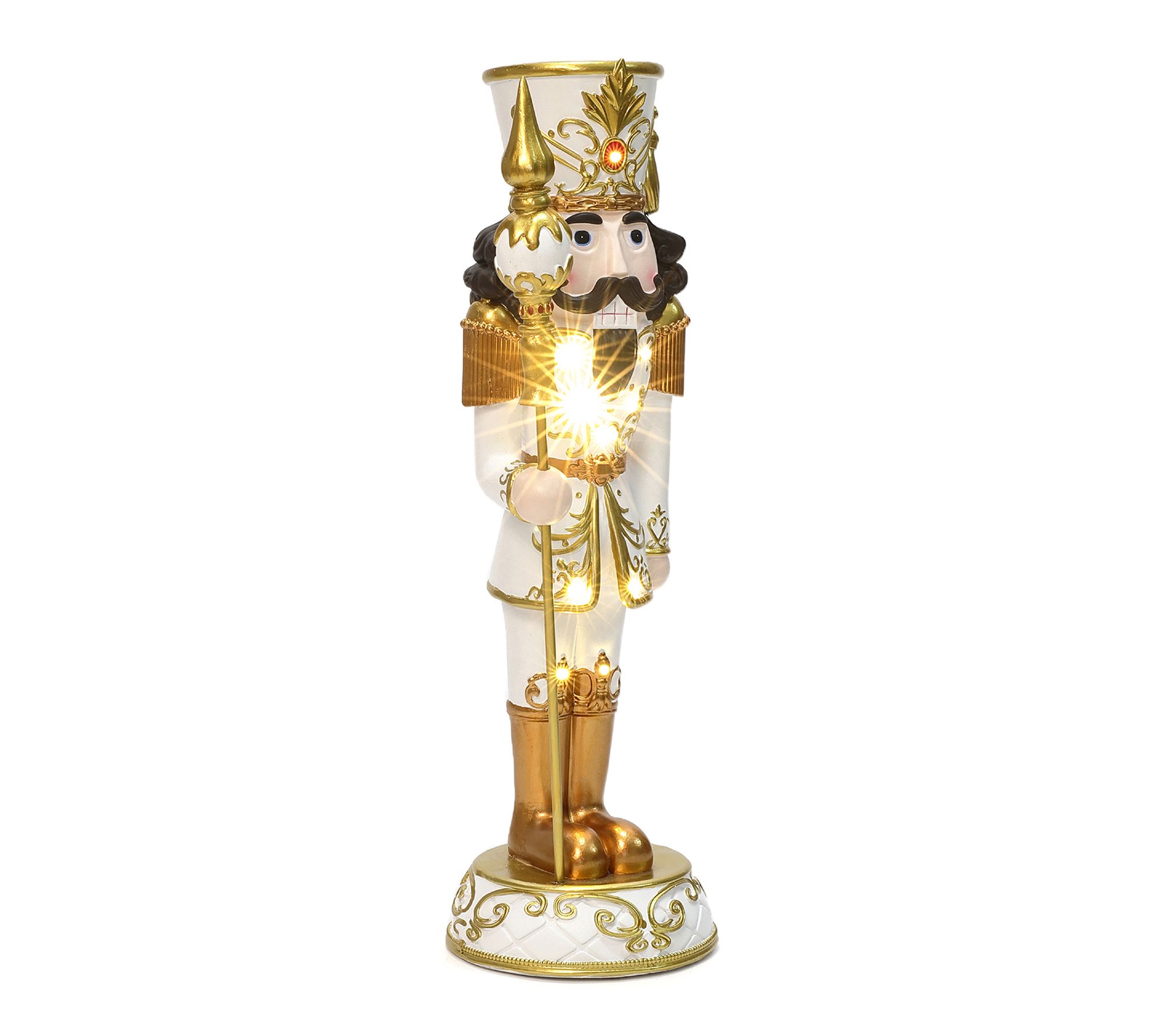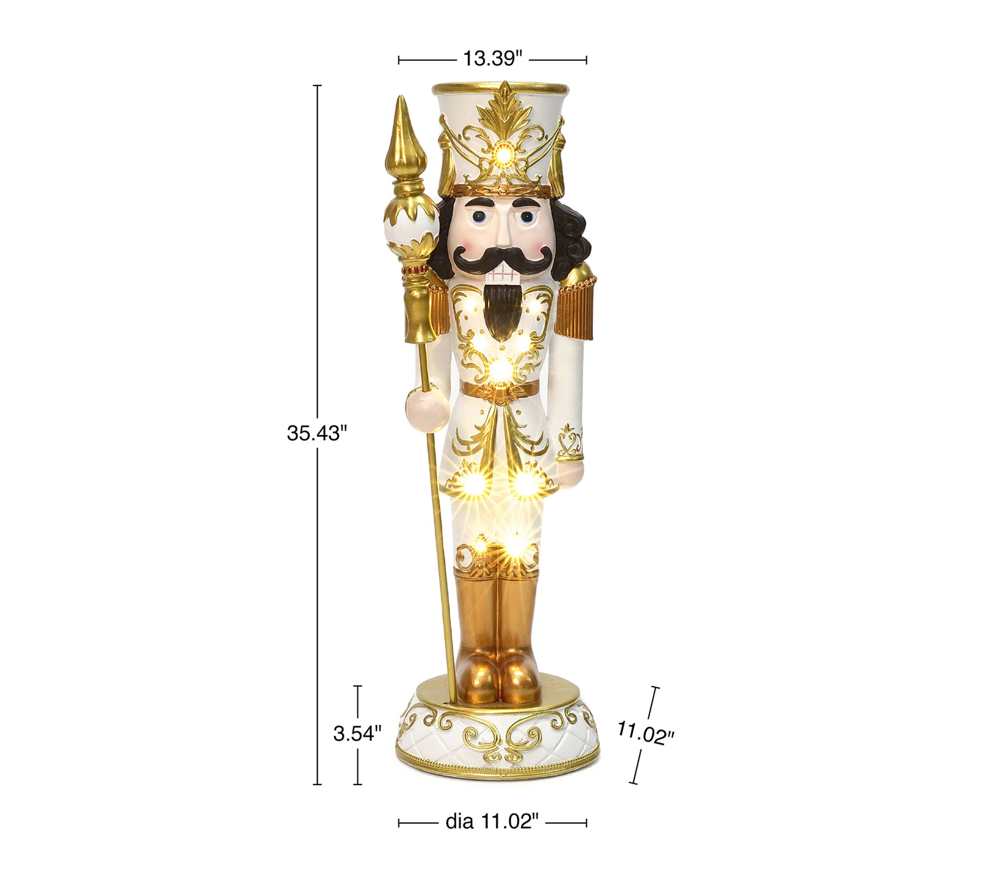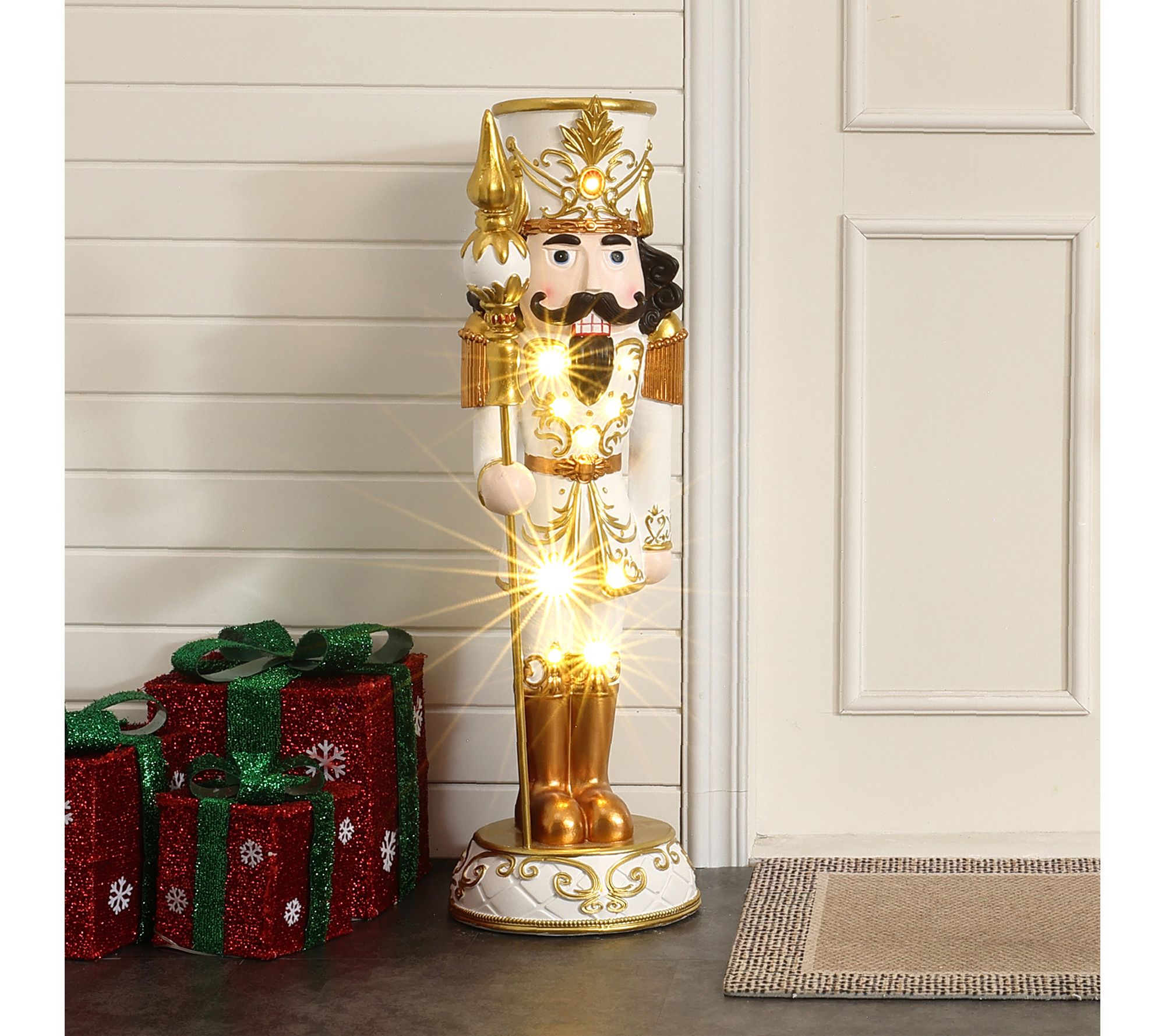Holiday magic comes alive with this three-foot lighted white and gold nutcracker, ready to welcome guests with regal style and a cozy LED glow. Showcasing a jewel-topped crown and elegant scepter, this festive figure instantly brightens entryways or tabletops while refined goldtone accents and intricate details make every corner feel special. From LuxenHome.