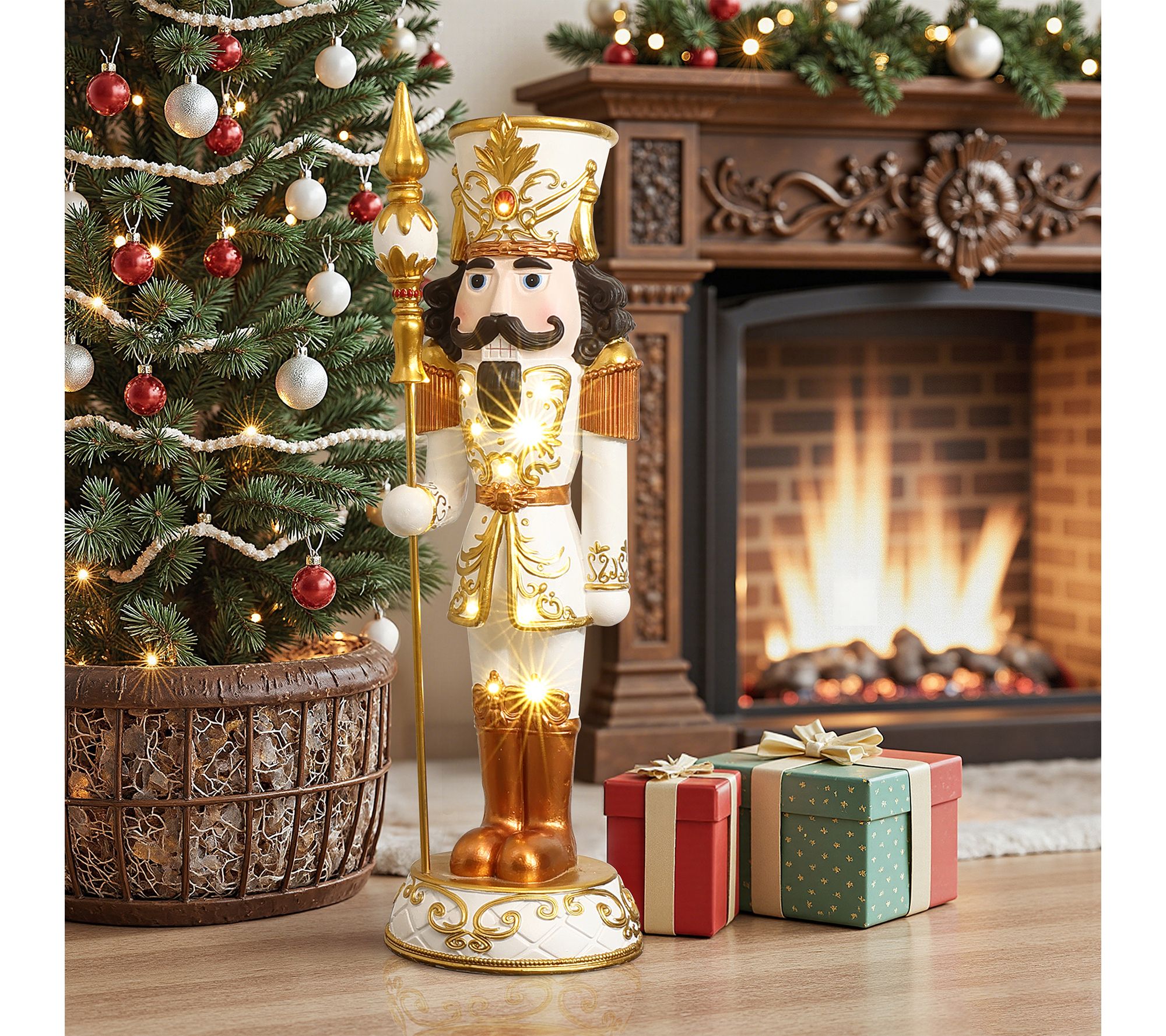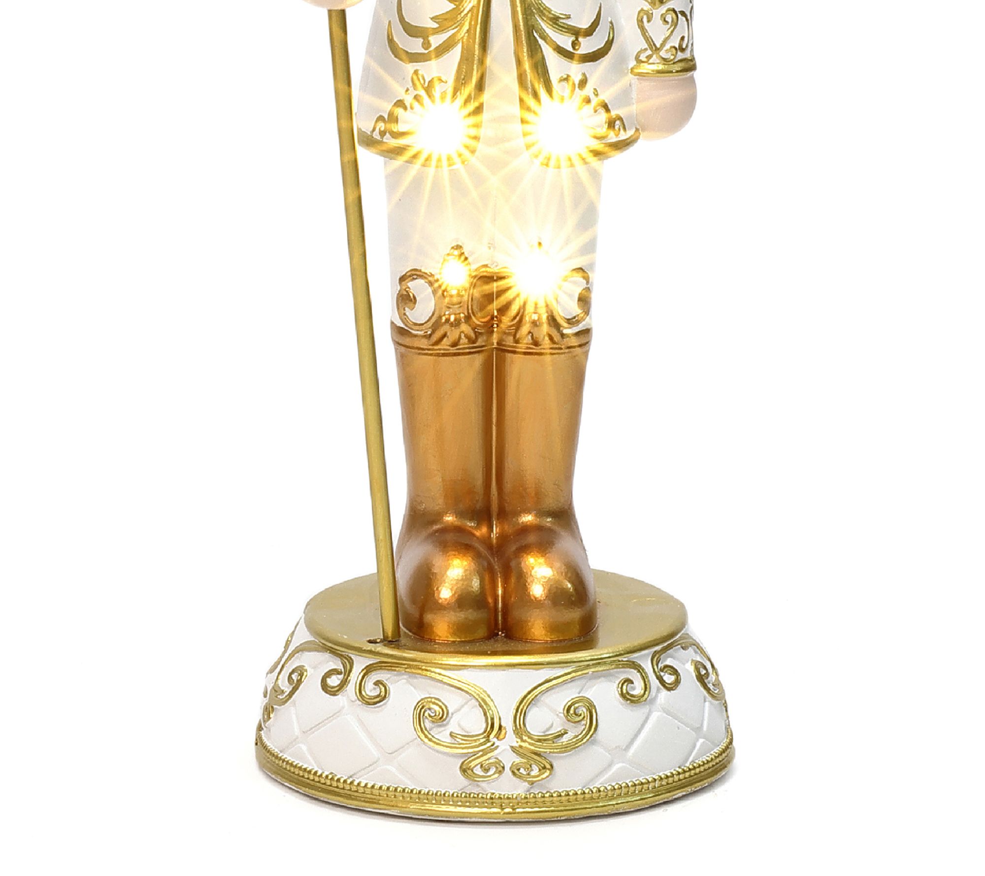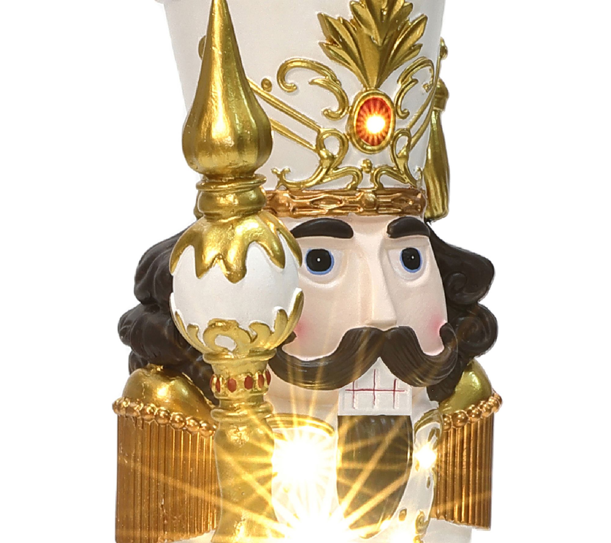 Holiday magic comes alive with this three-foot lighted white and gold nutcracker, ready to welcome guests with regal style and a cozy LED glow. Showcasing a jewel-topped crown and elegant scepter, this festive figure instantly brightens entryways or tabletops while refined goldtone accents and intricate details make every corner feel special. From LuxenHome.