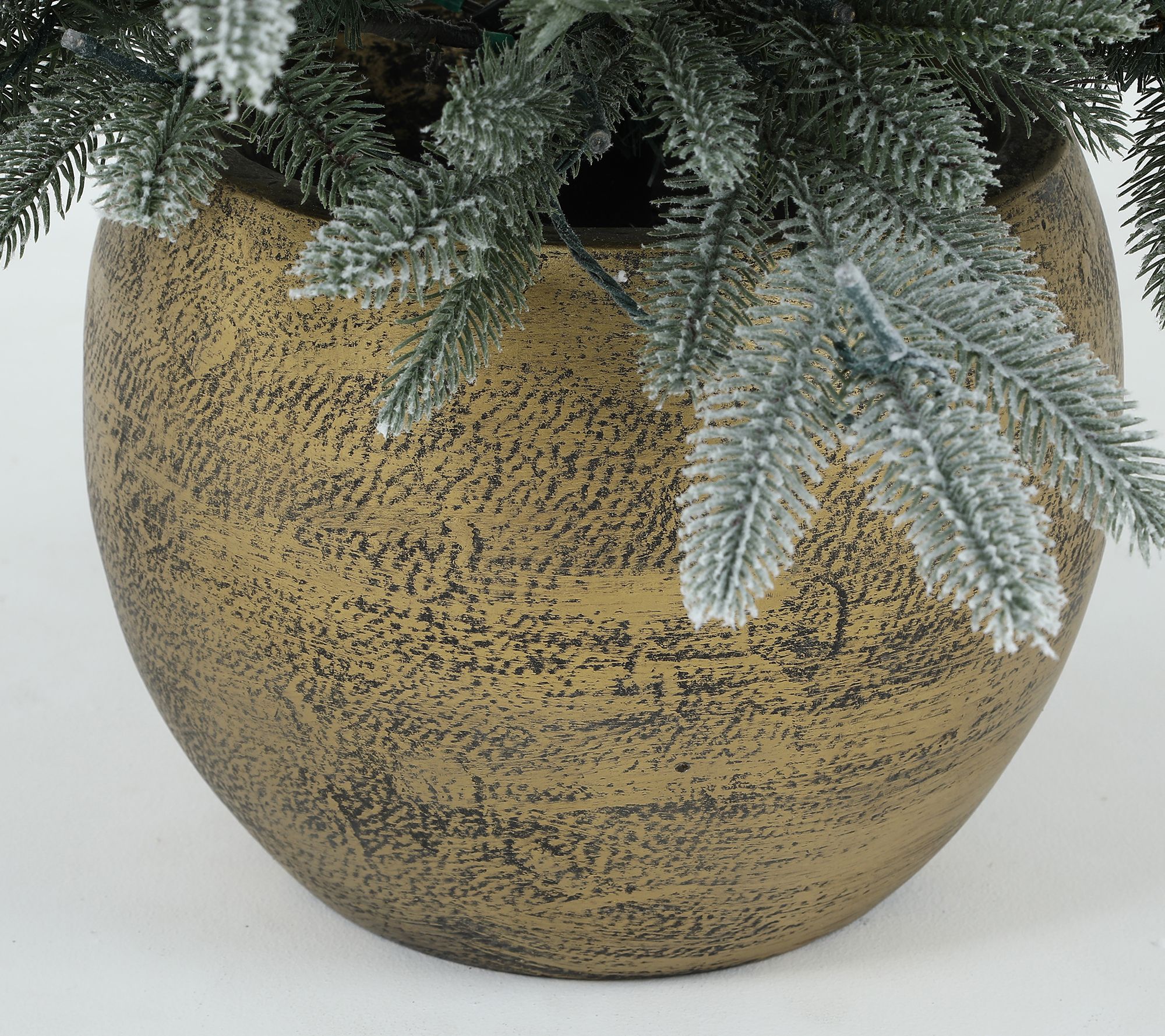 • Flocked artificial tree in a bowl planter with a goldtone distressed finish