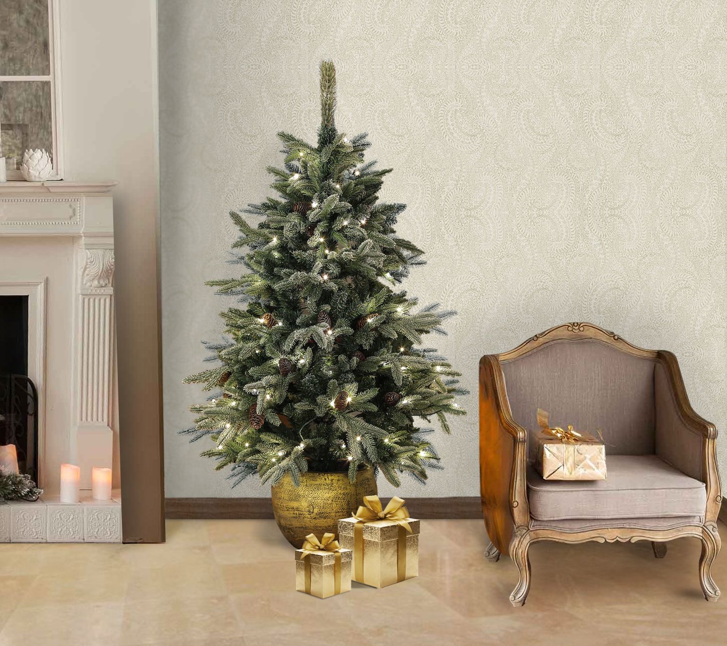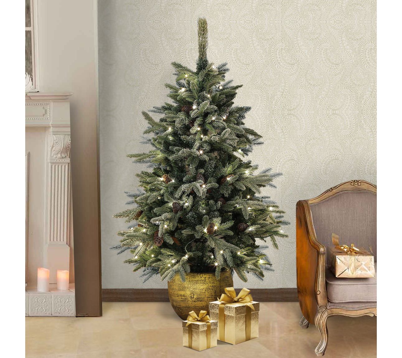 LuxenHome 4.5Ft Flocked Pre-Lit Porch Tree witPinecones