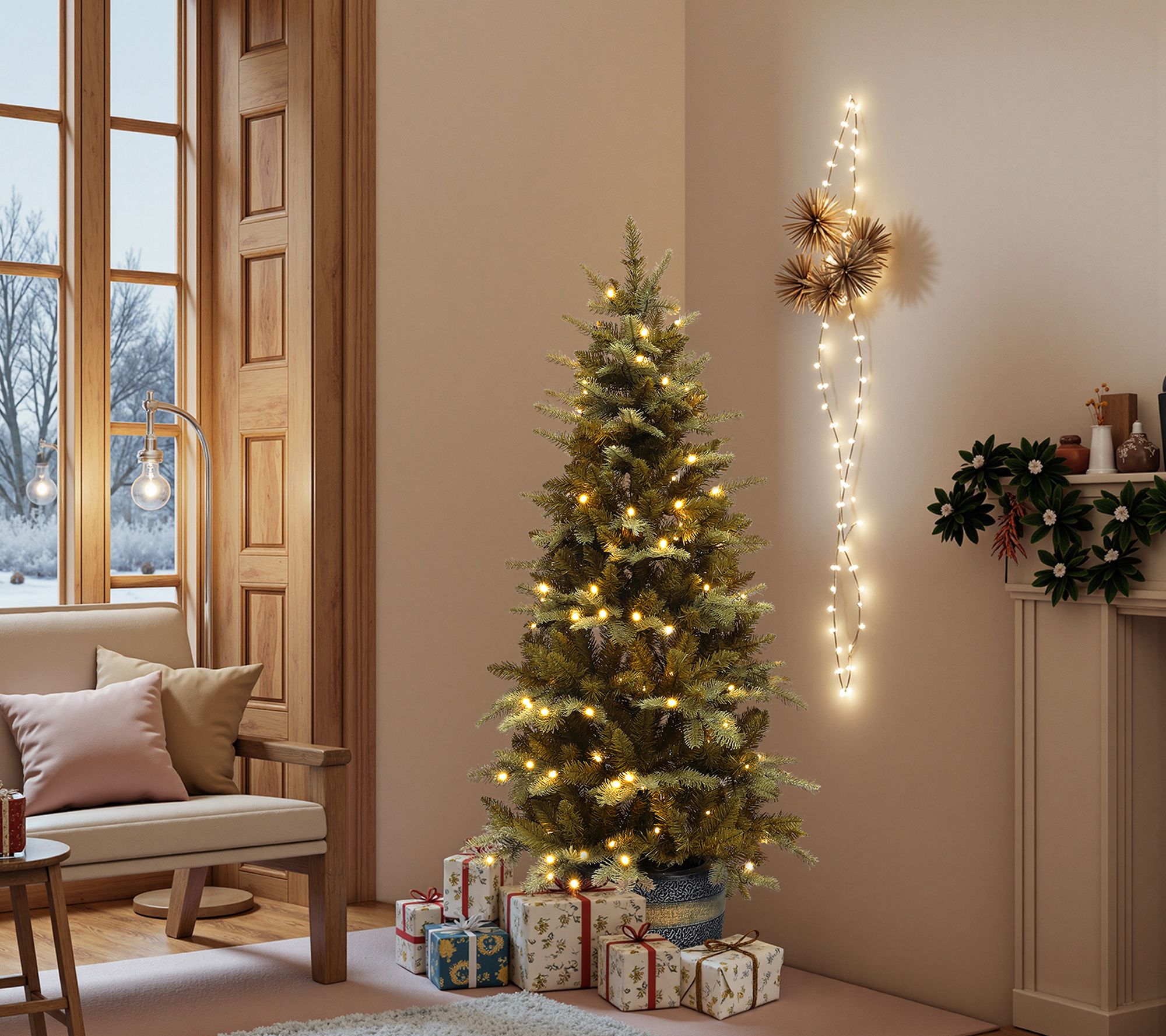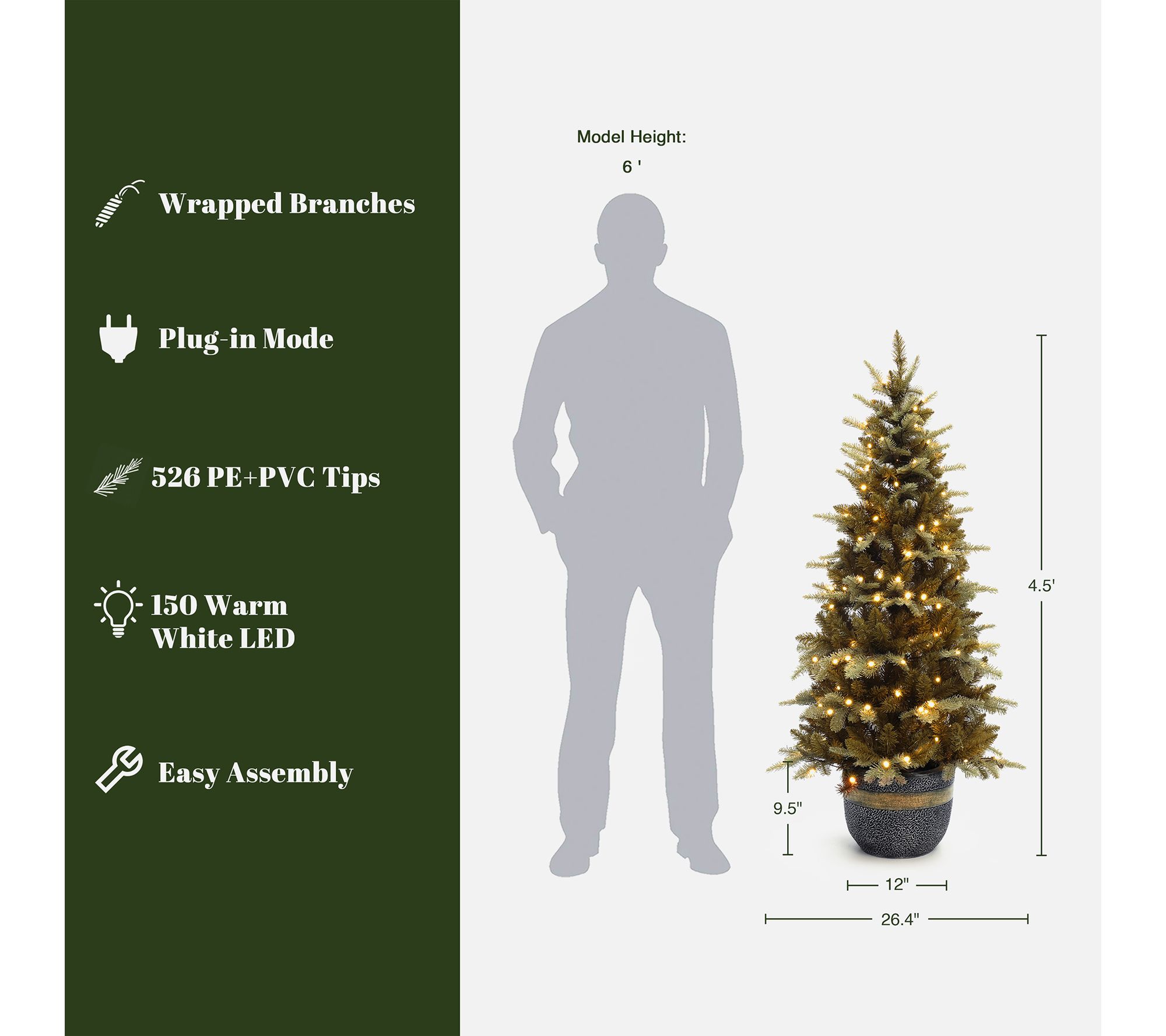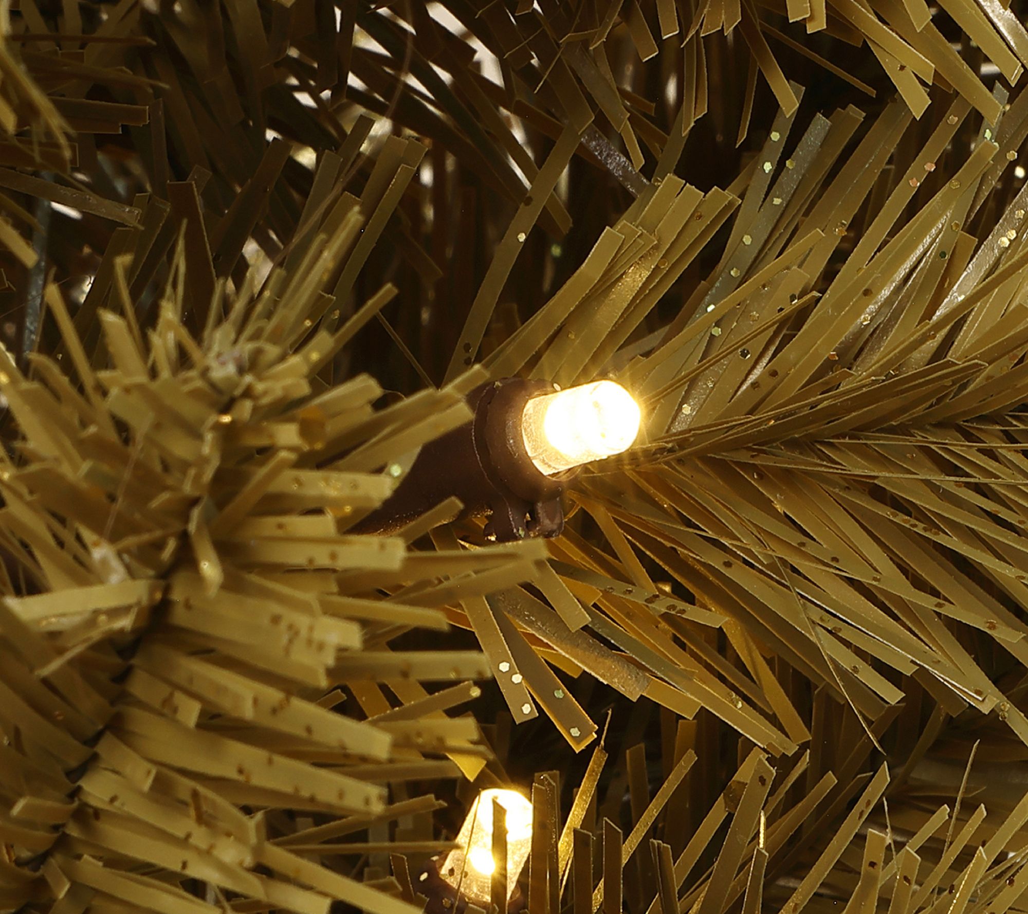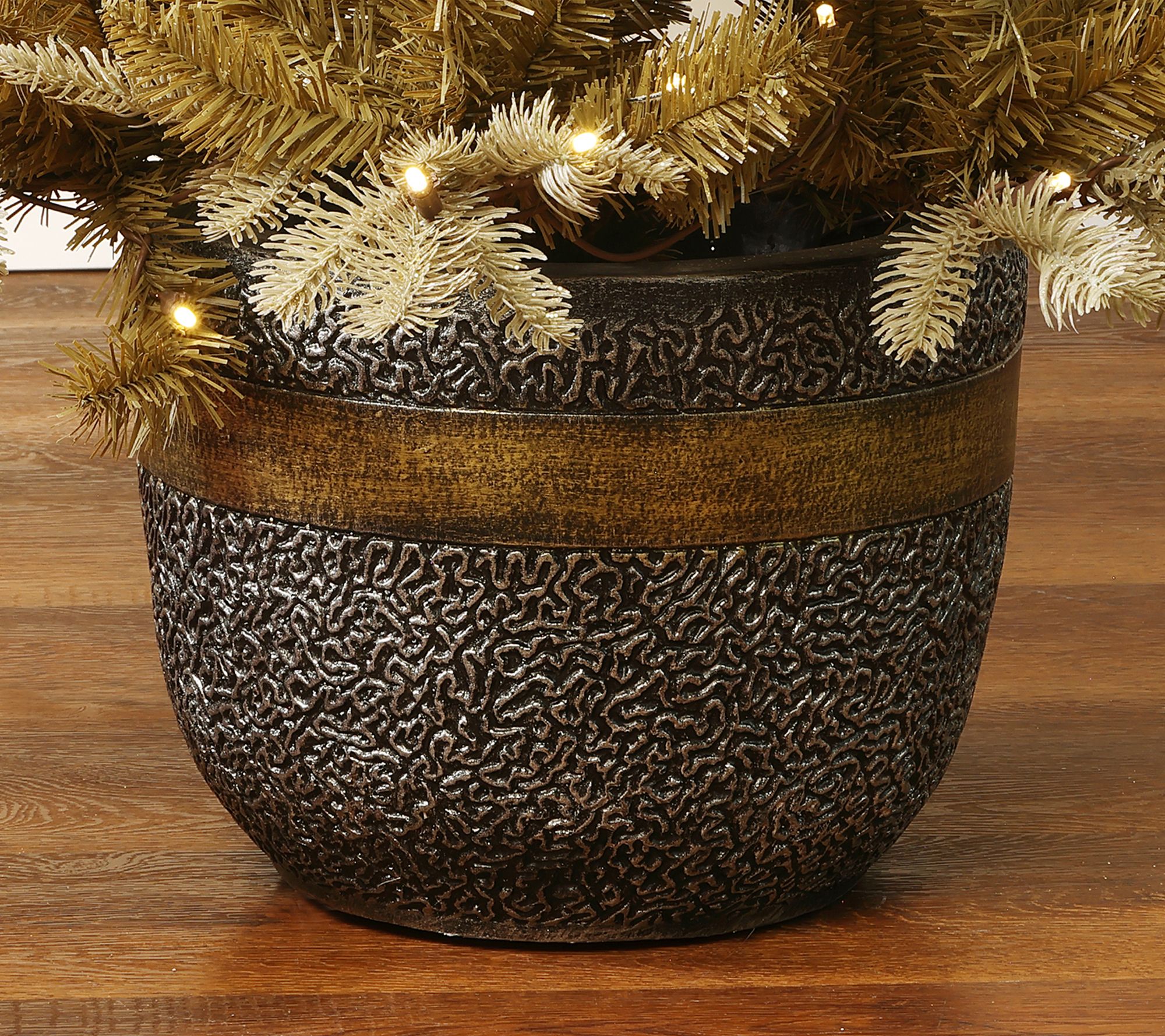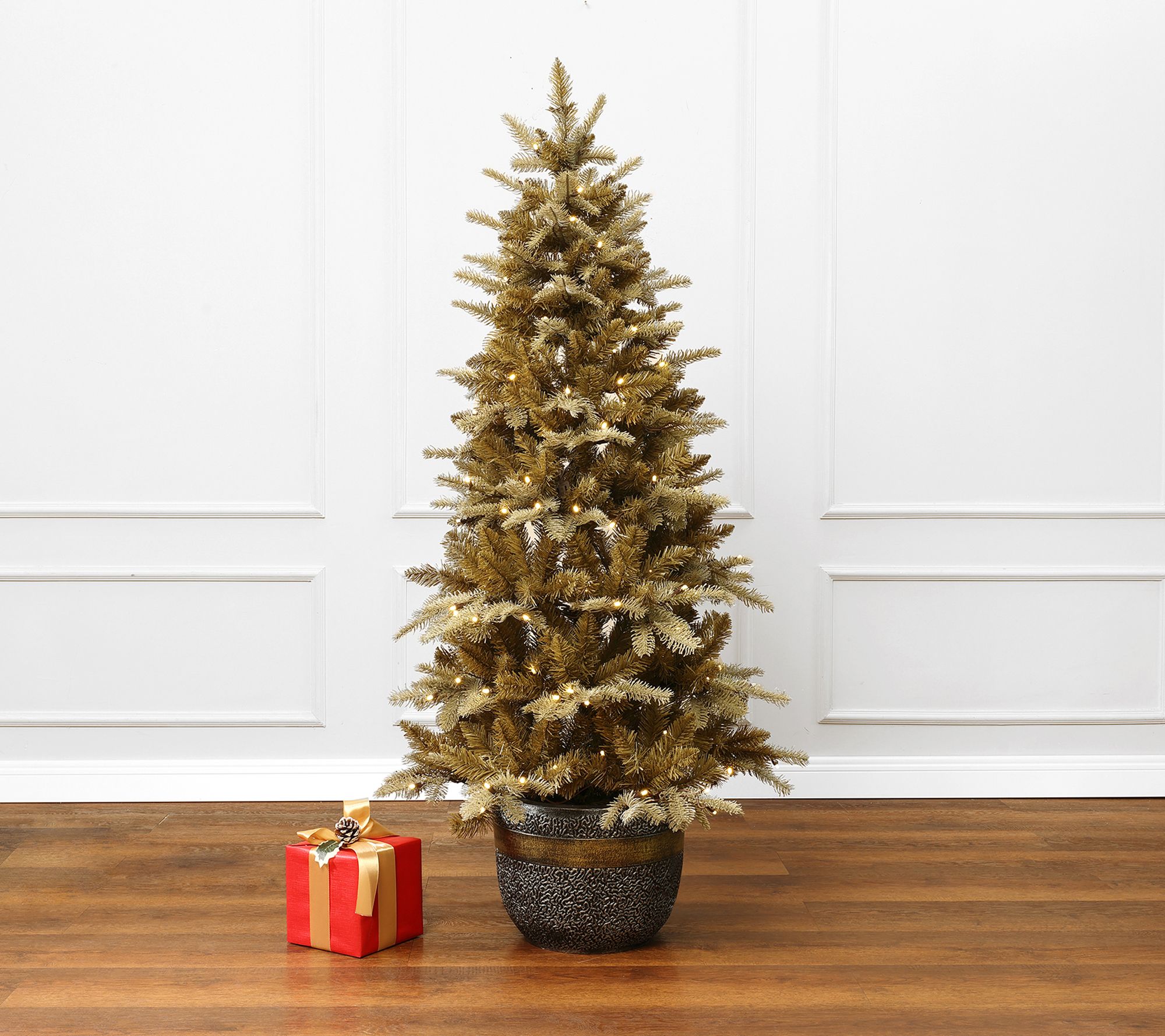 Holiday gatherings get an extra touch of elegance with this pre-lit Christmas tree, impressively styled with gold branches and set in a decorative bronze planter. Brighten any entryway or cozy corner with 150 warm white LED lights glimmering through lifelike tips for an inviting, festive glow. Quick to assemble and easily stored, this showpiece brings handmade charm to apartments and smaller spaces alike. From LuxenHome.