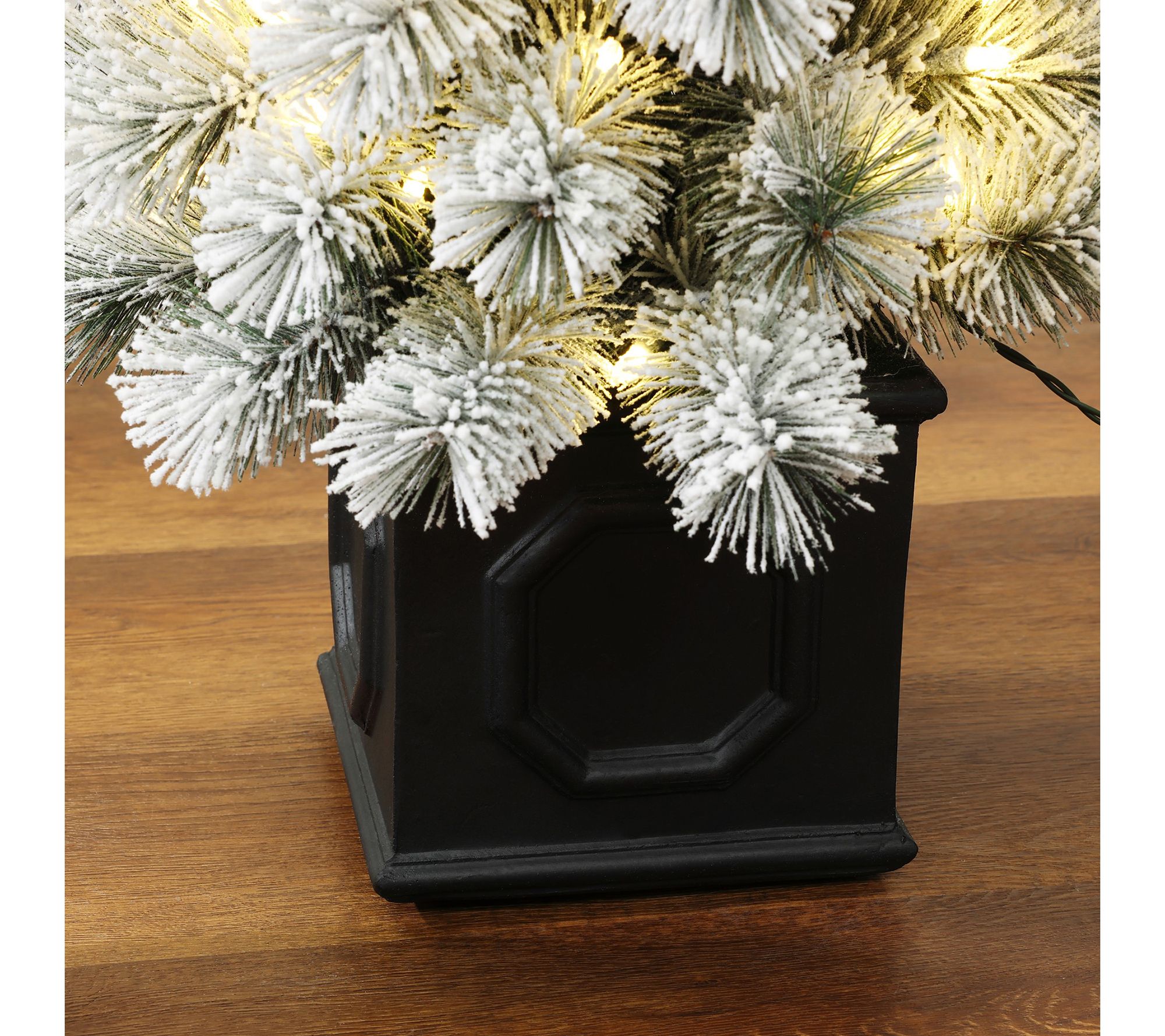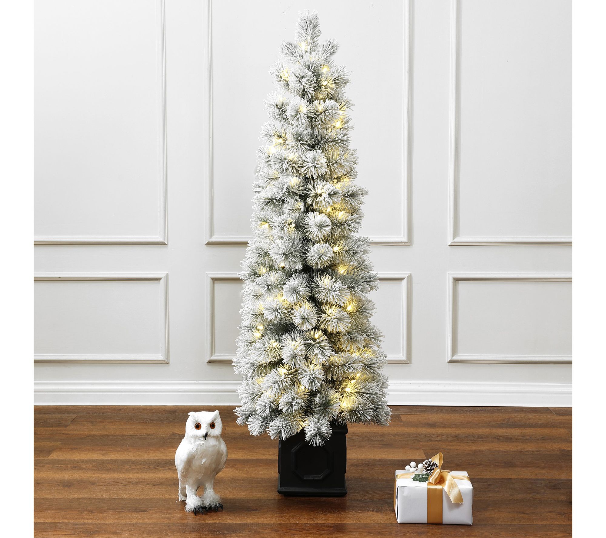 Embrace the joy of the holiday season with the LuxenHome pre-lit snow-flocked artificial tree. This elegant tree, adorned with warm white lights and white pine needles, brings the ambiance of wintry forests into your home. Its rectangular potted base adds a touch of modern appeal and stability. From LuxenHome.