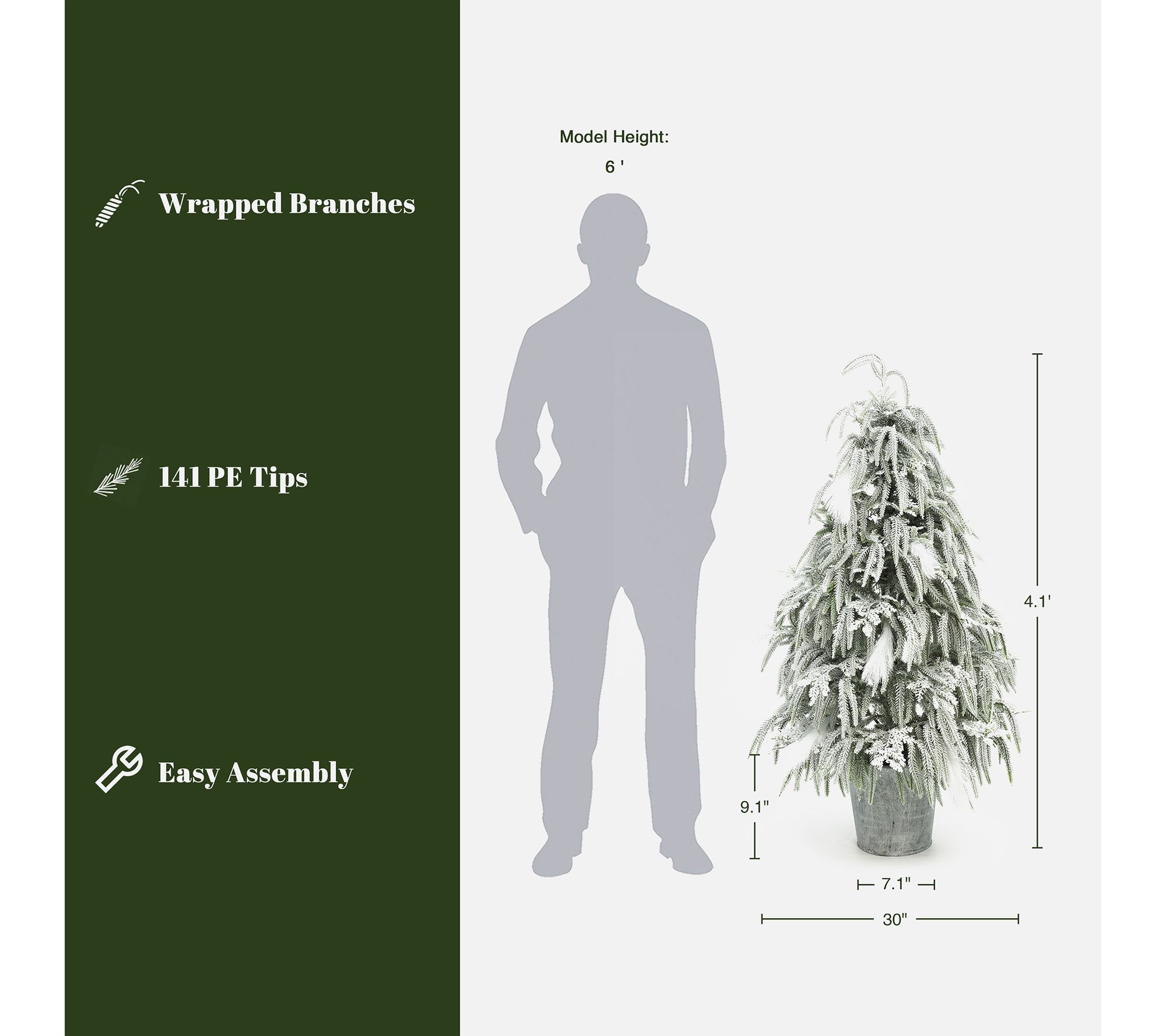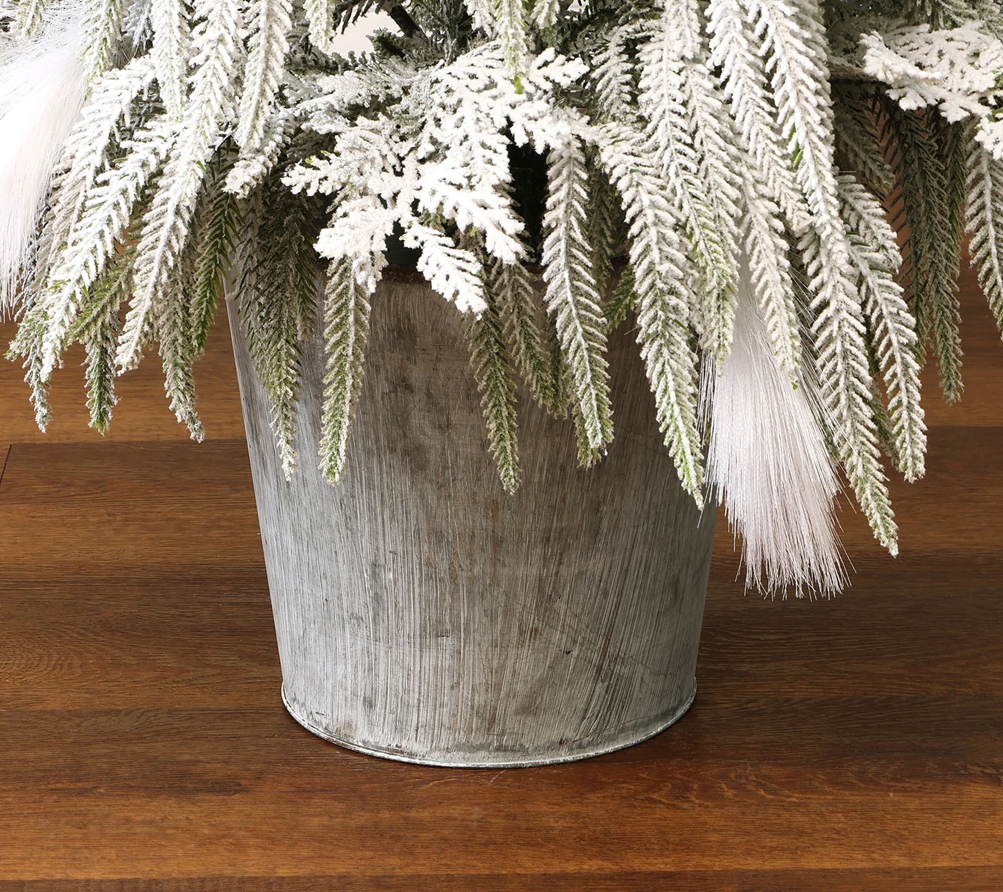 A snowy forest scene comes to life with this lifelike artificial Christmas tree, featuring 141 beautifully flocked branch tips and feather-like white strands for an airy, festive touch. The silver metallic pot base offers modern appeal while keeping the tree sturdy in entryways, offices, or cozy corners. Easily assembled and stored for stress-free holiday decorating. From LuxenHome.