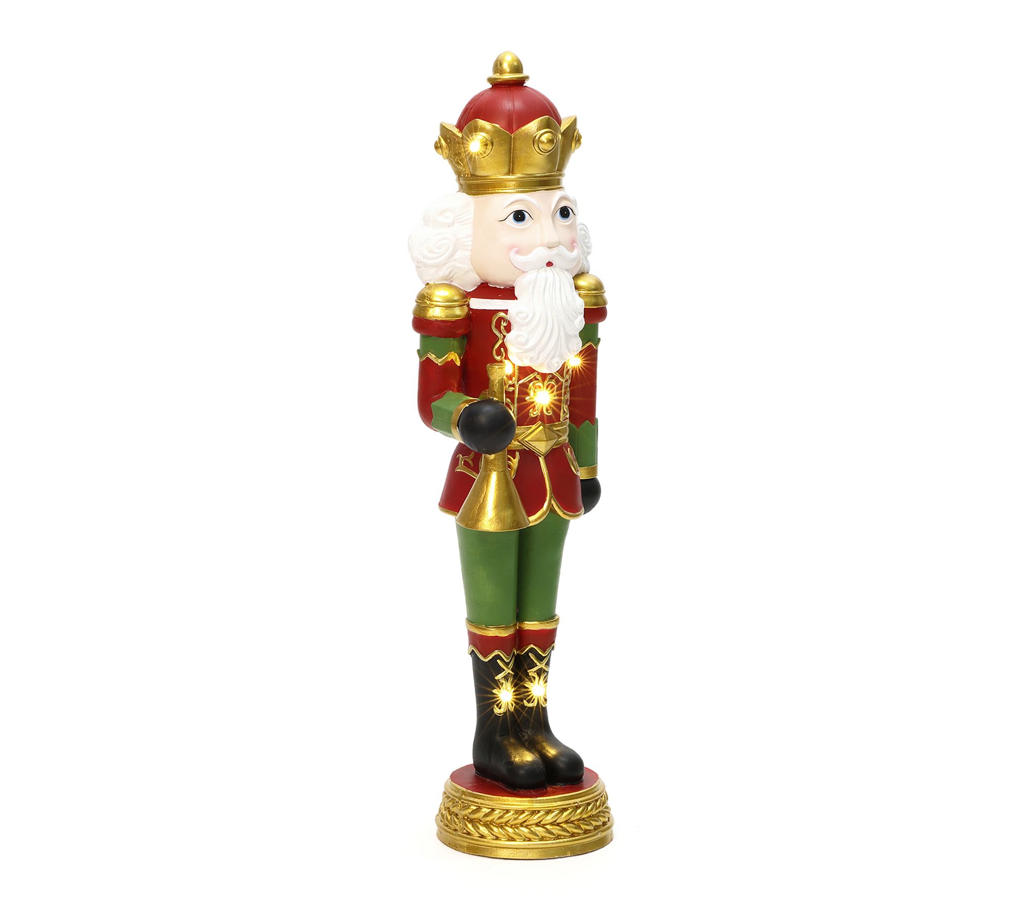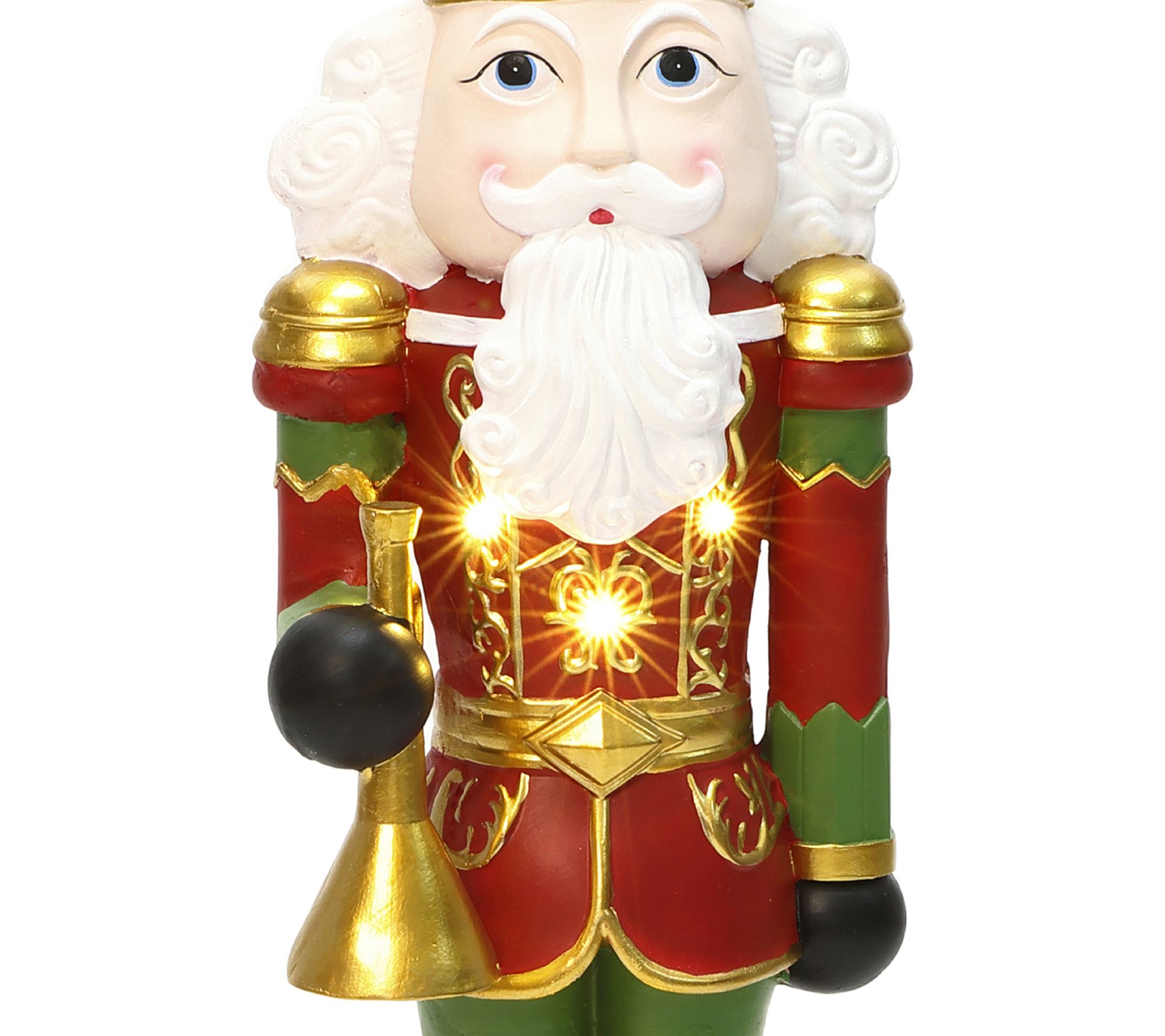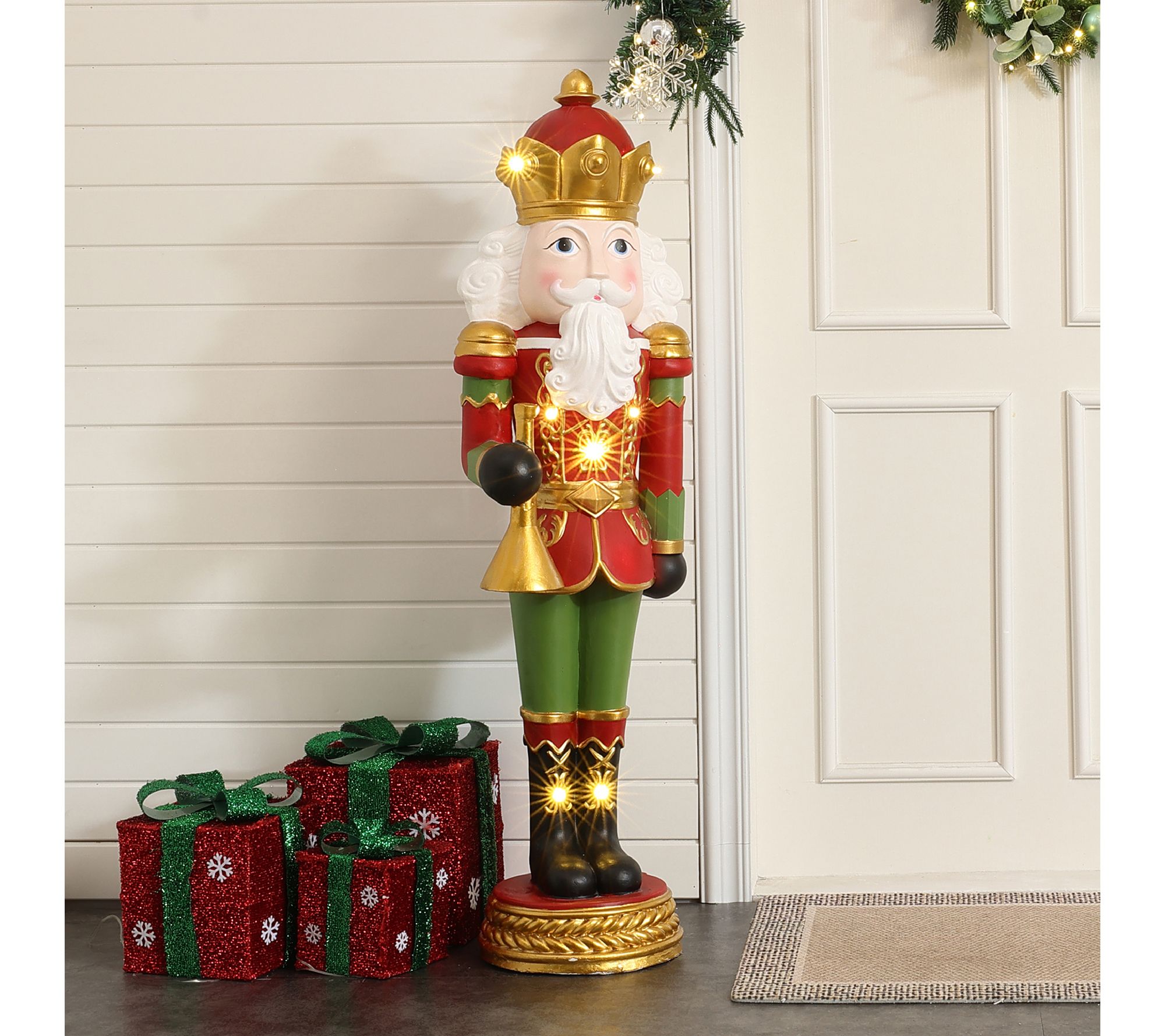 Holiday greetings start at your doorstep when the 4' Lighted Nutcracker Bugling Soldier salutes guests with classic charm. Five warm LED lights glow through the richly painted red, green, and gold soldier, adding festive sparkle to foyers, porches, or next to the tree for cheerful photo ops. From LuxenHome.