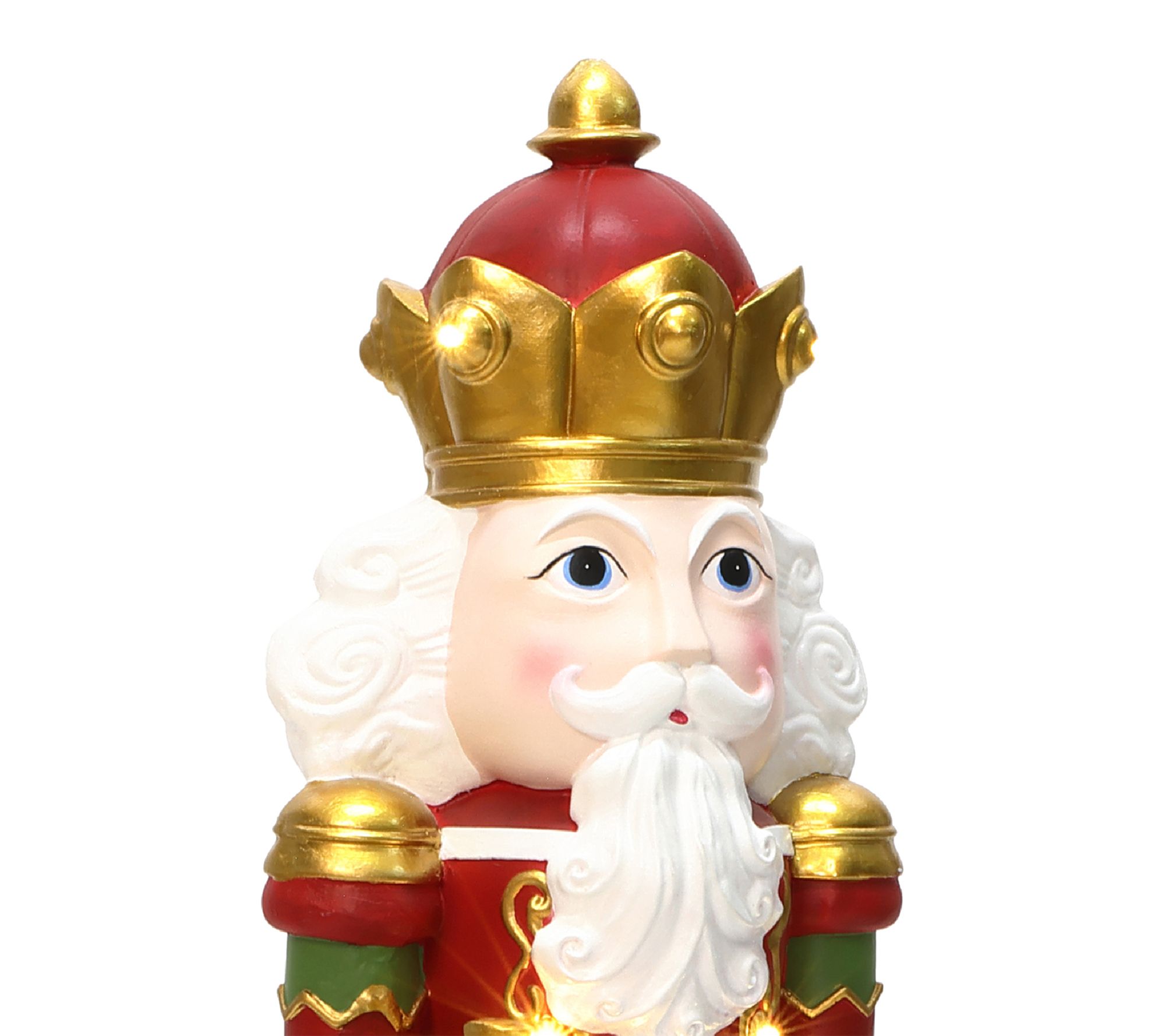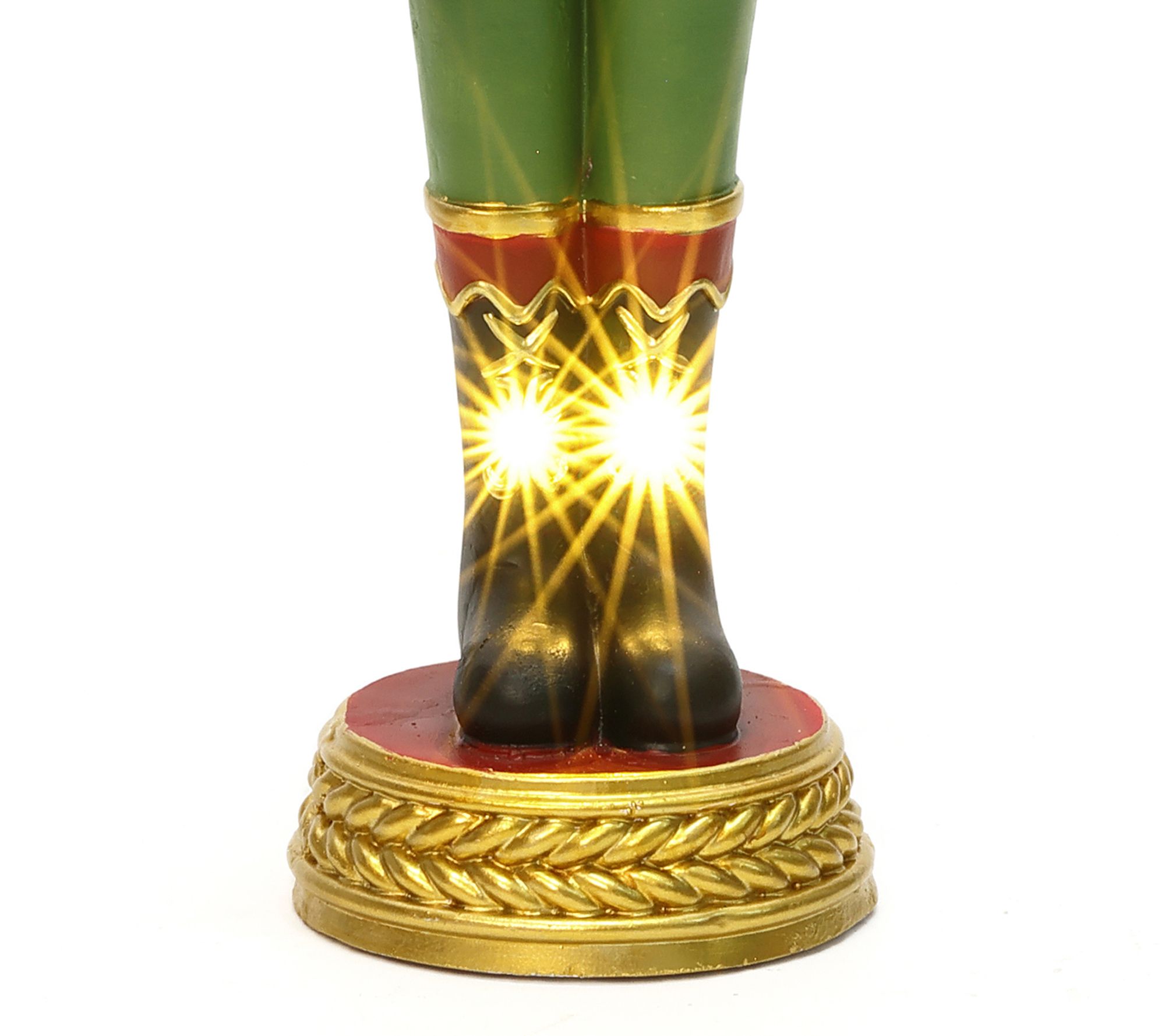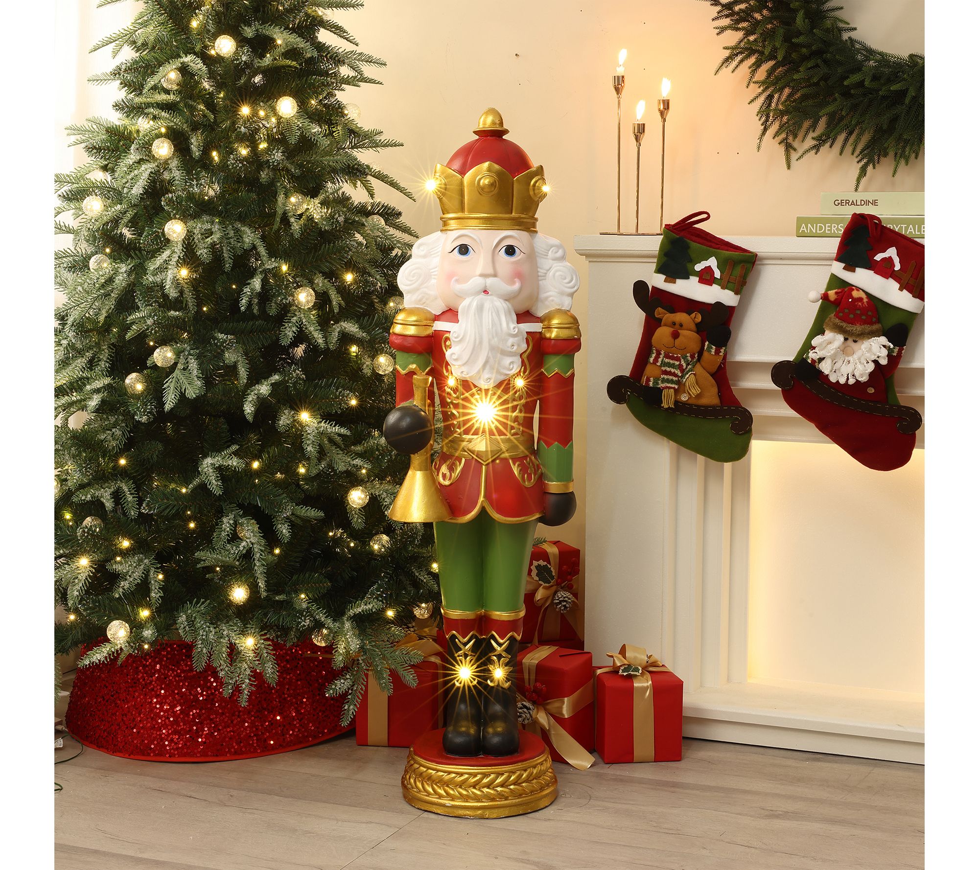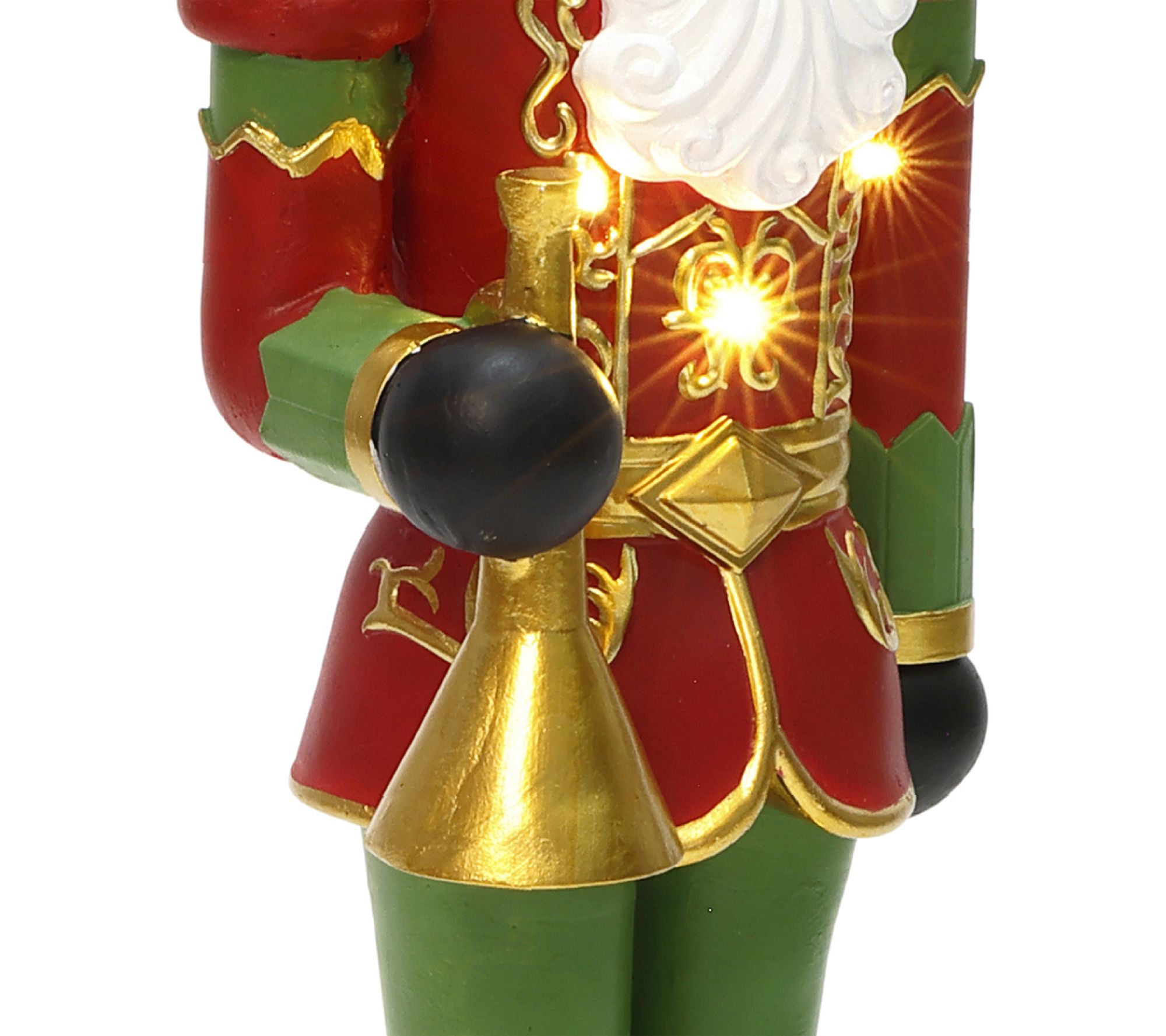 Holiday greetings start at your doorstep when the 4' Lighted Nutcracker Bugling Soldier salutes guests with classic charm. Five warm LED lights glow through the richly painted red, green, and gold soldier, adding festive sparkle to foyers, porches, or next to the tree for cheerful photo ops. From LuxenHome.