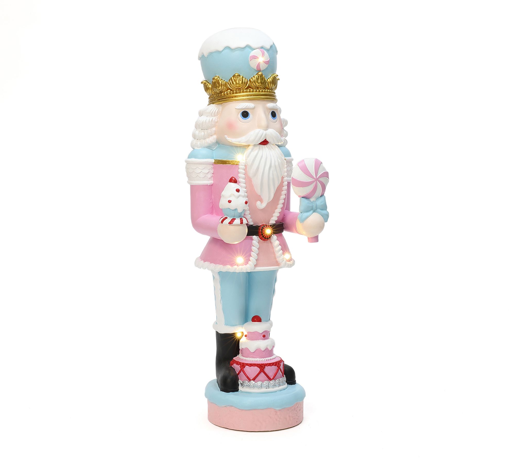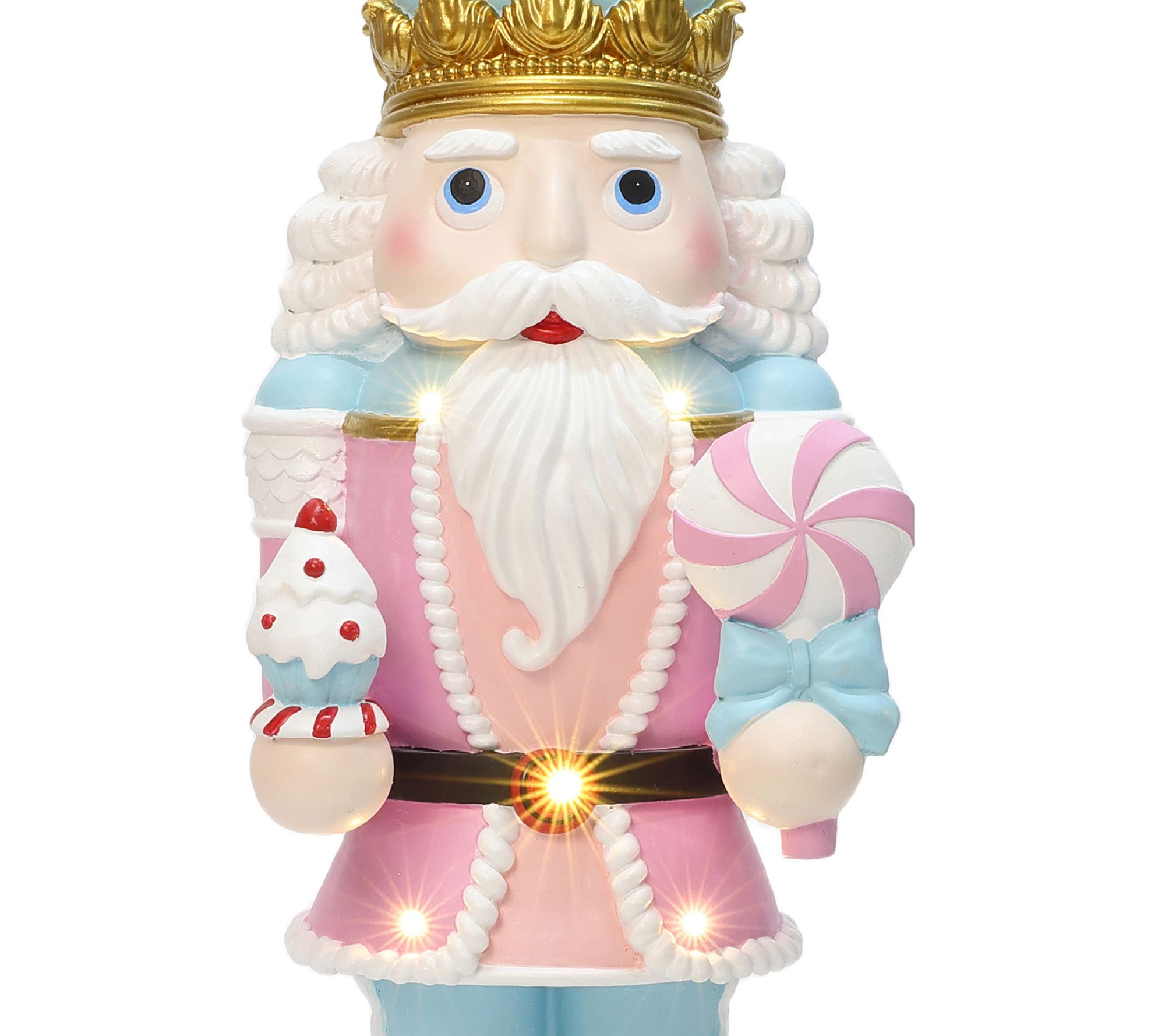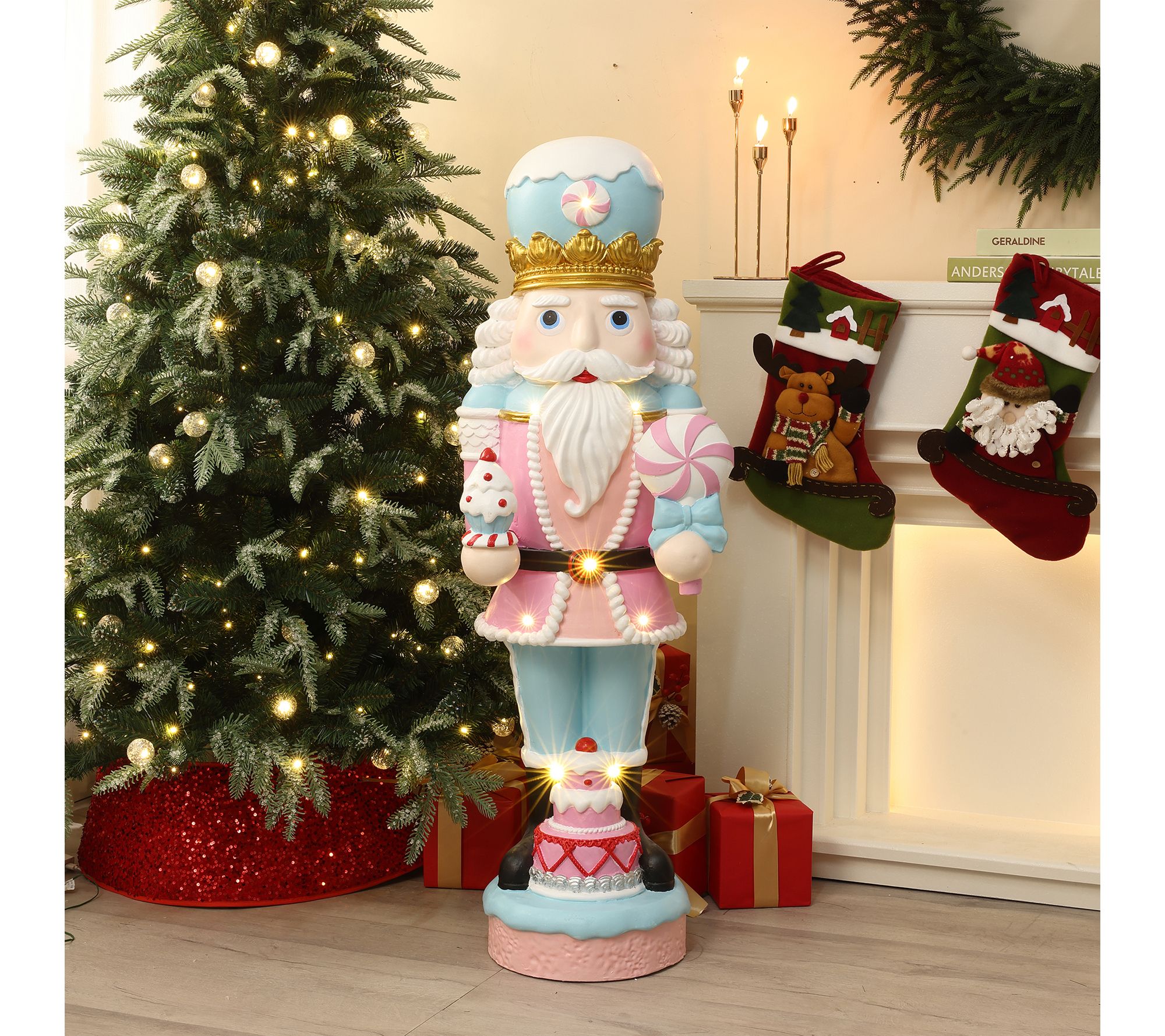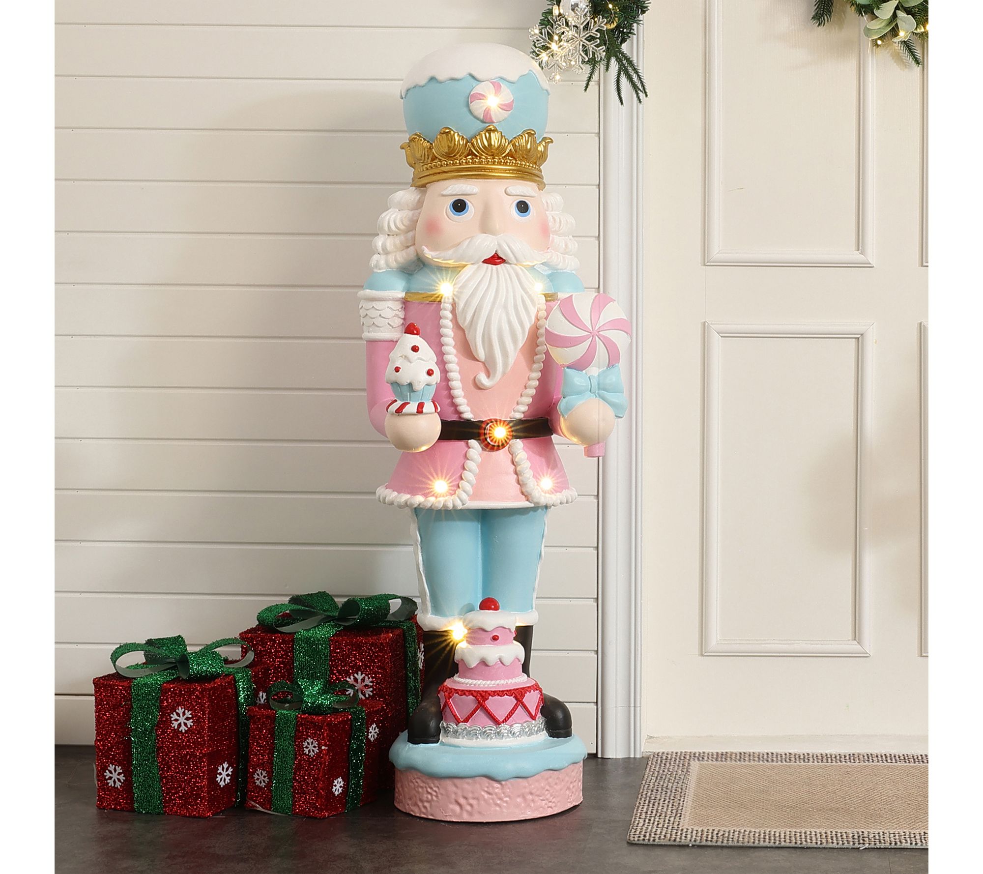Bring a touch of whimsy to your holiday season with this 4-foot lighted pink nutcracker, featuring playful cake and candy details. Pastel colors and built-in LED lights create a soft glow, brightening entryways or living spaces for festive gatherings. From LuxenHome.