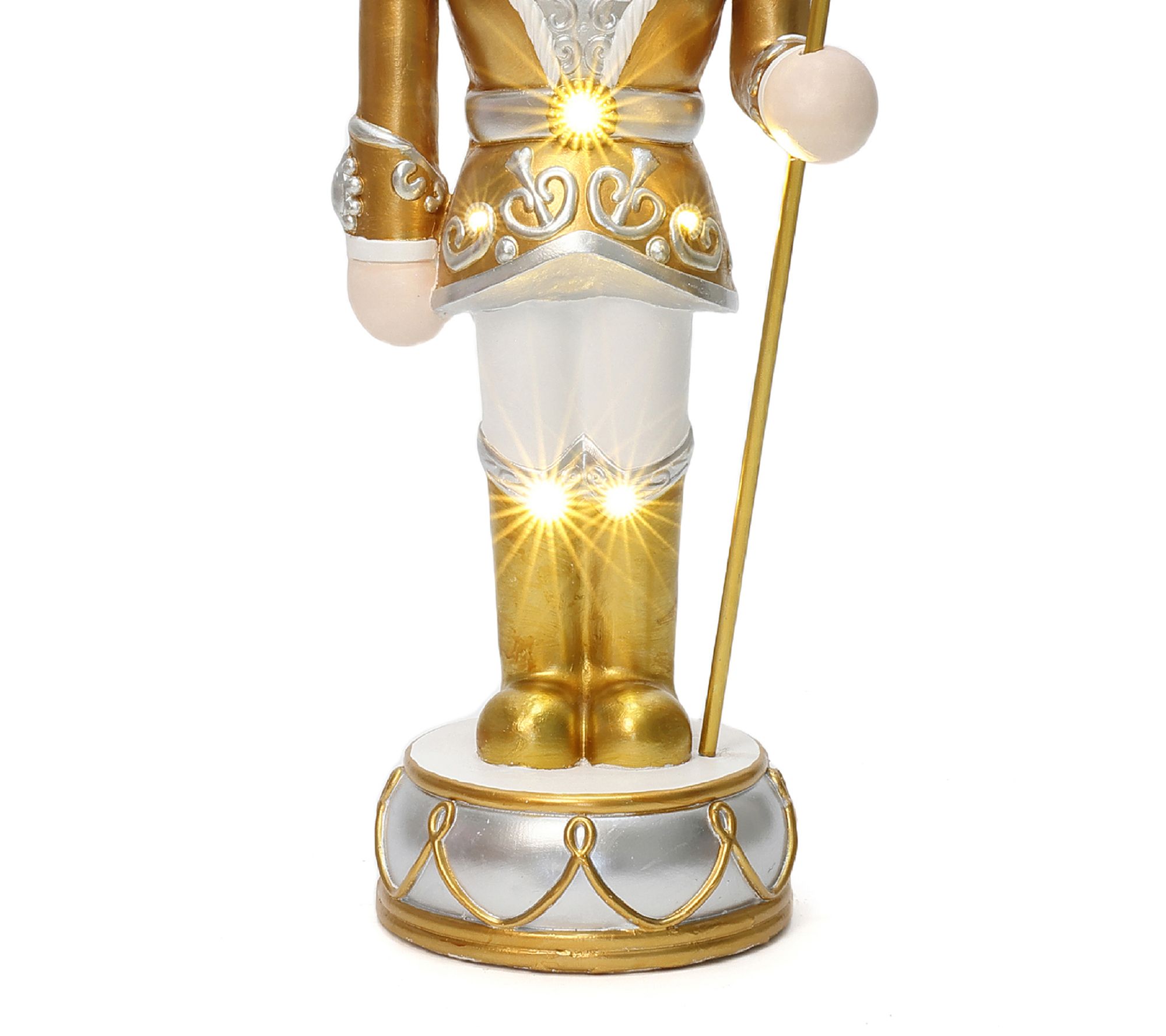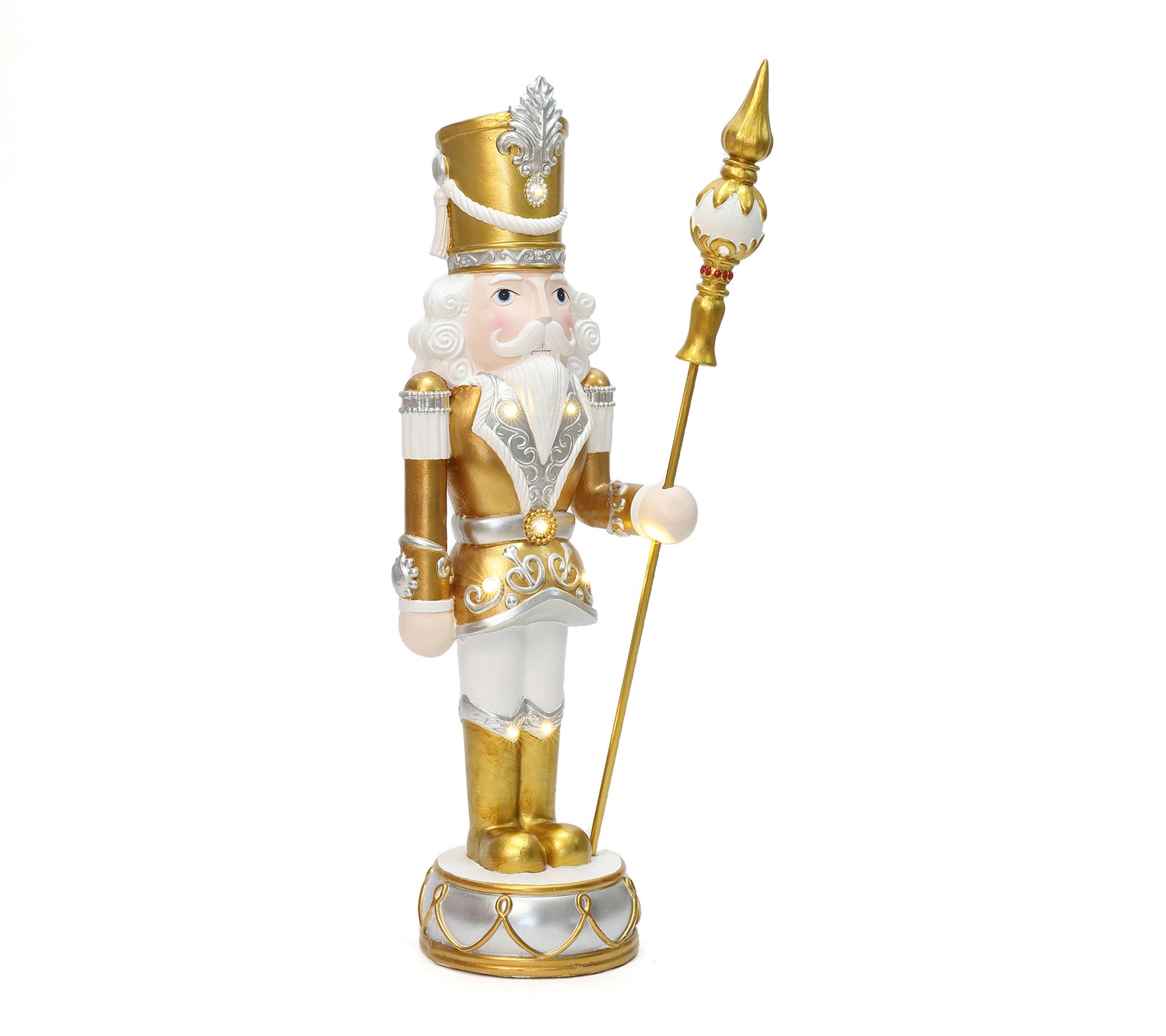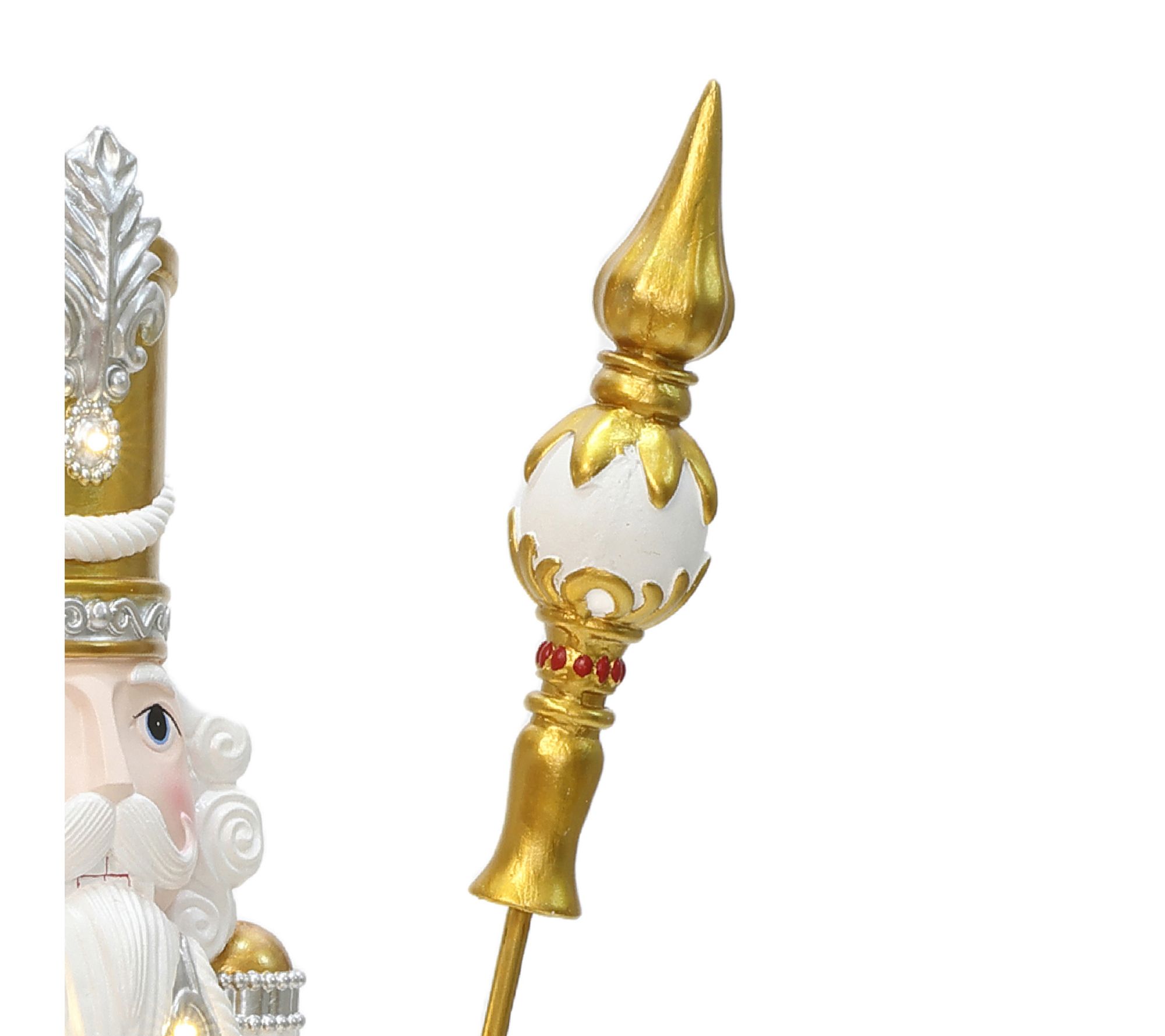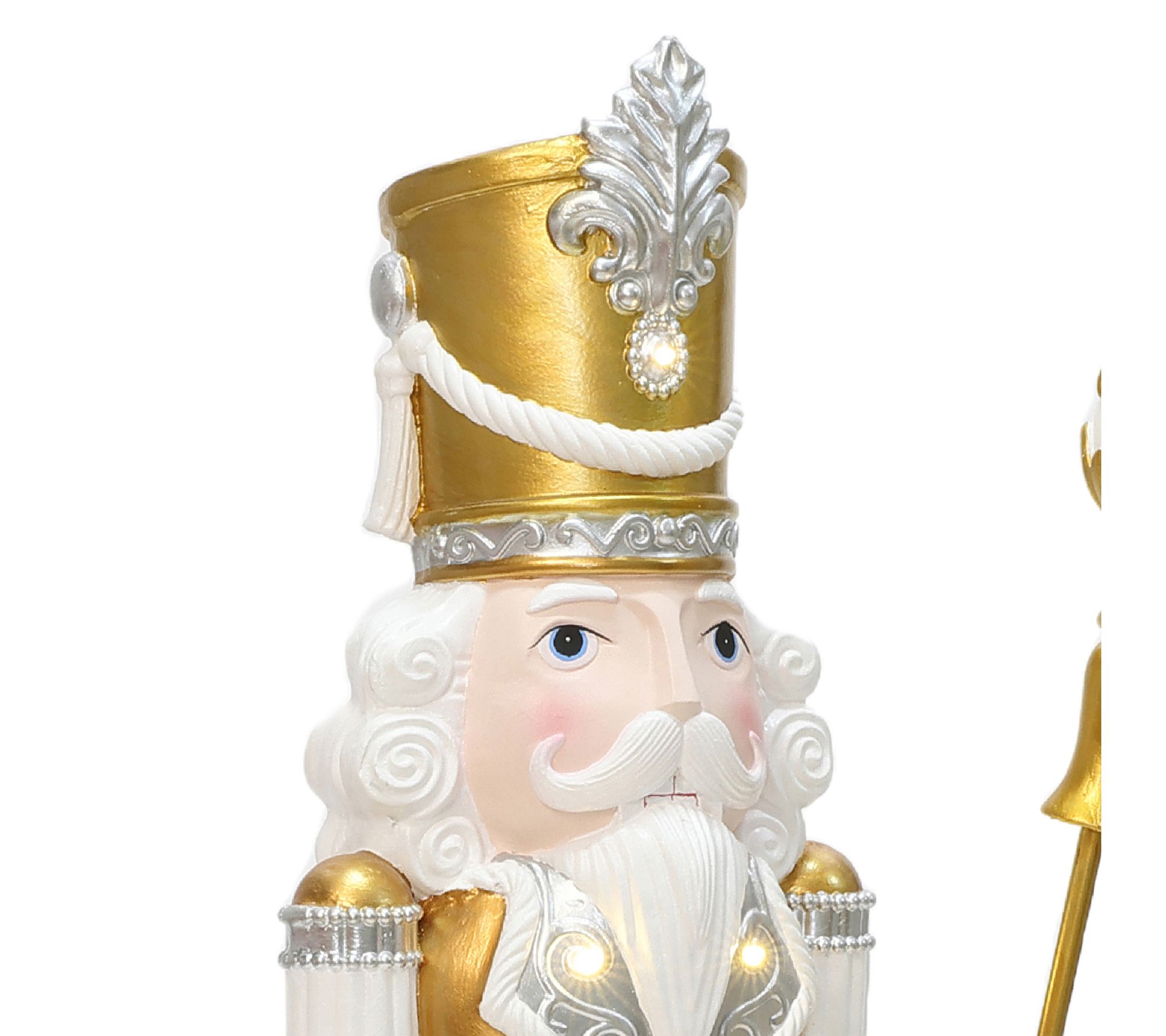 A grand nutcracker decoration brings brilliant holiday elegance to any home or business. Gleaming in silvertone and goldtone, this stately figure holds a scepter and features ornate scrollwork and a sparkling finish, while gentle warm LED lights cast a cozy glow on your festive display. Let this battery-powered accent welcome guests all season long with a luxurious, cheerful presence. From LuxenHome.