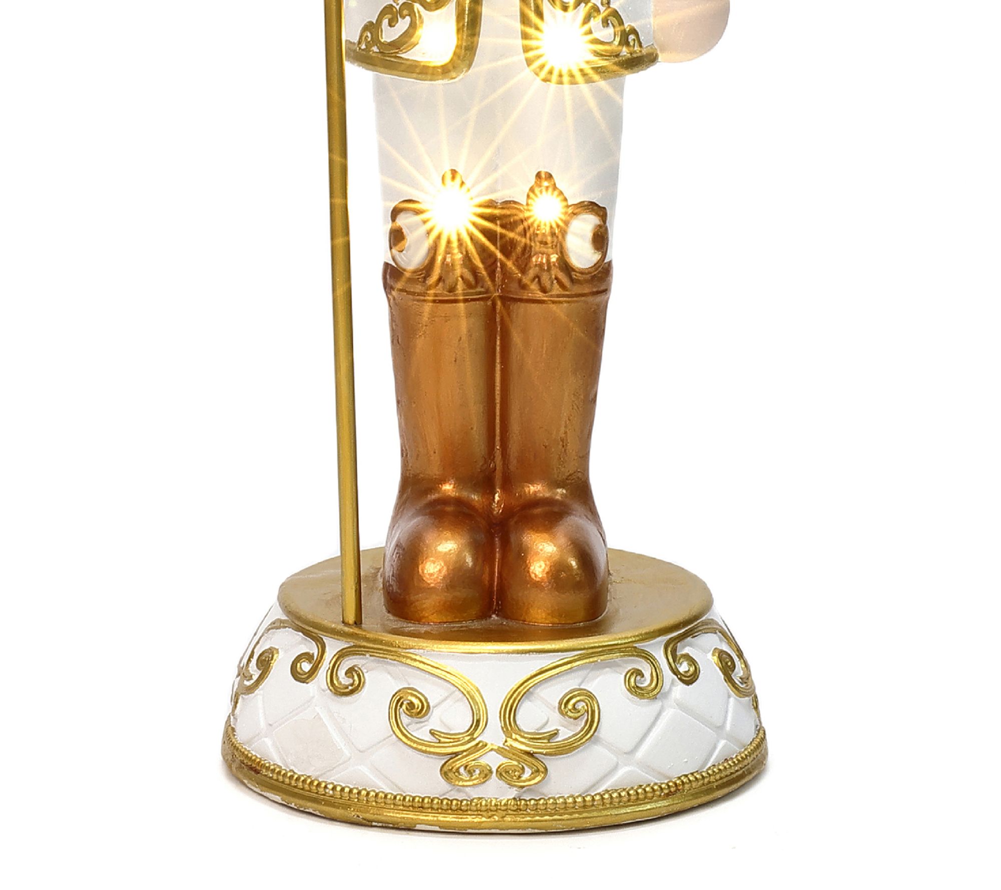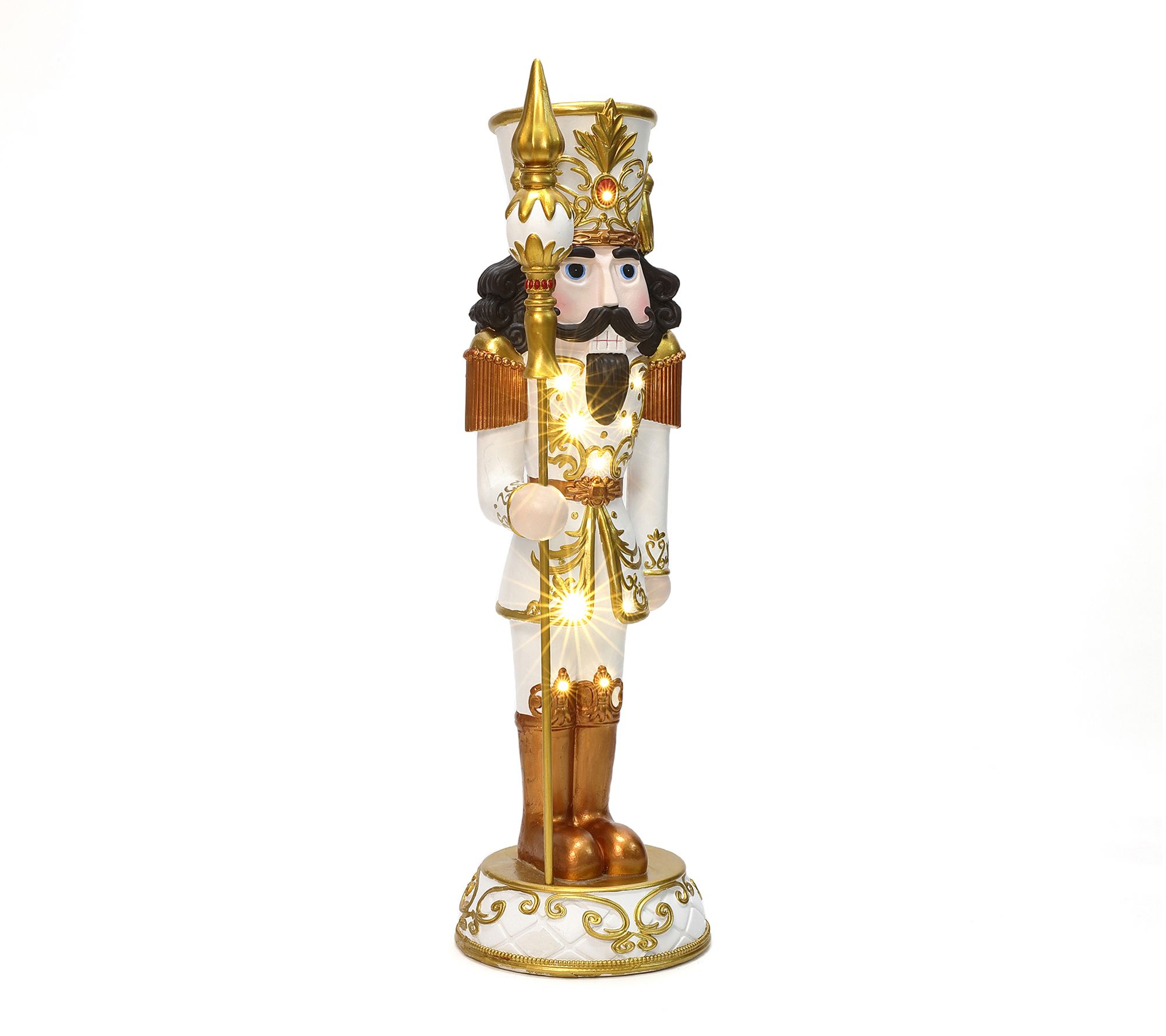 Holiday memories shine even brighter with this lighted nutcracker standing guard beside your entryway or gracing your fireplace. Ornate gold accents and a jewel-topped crown invite a regal touch to your seasonal celebrations, while eight gentle white LED lights cast a festive glow. No cords, no fuss -- just a grand statement for indoor festivities. From LuxenHome.