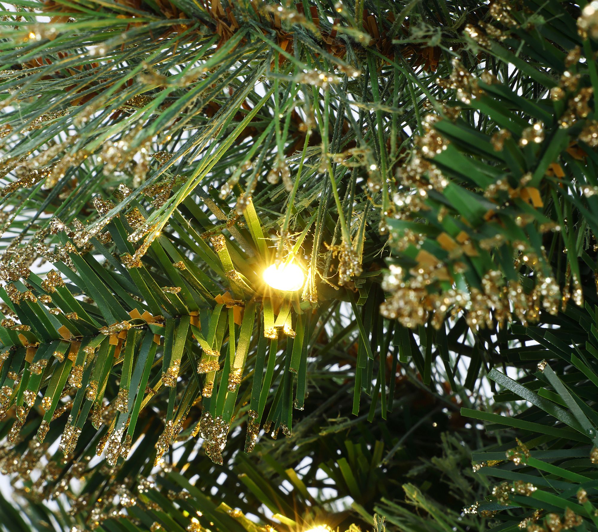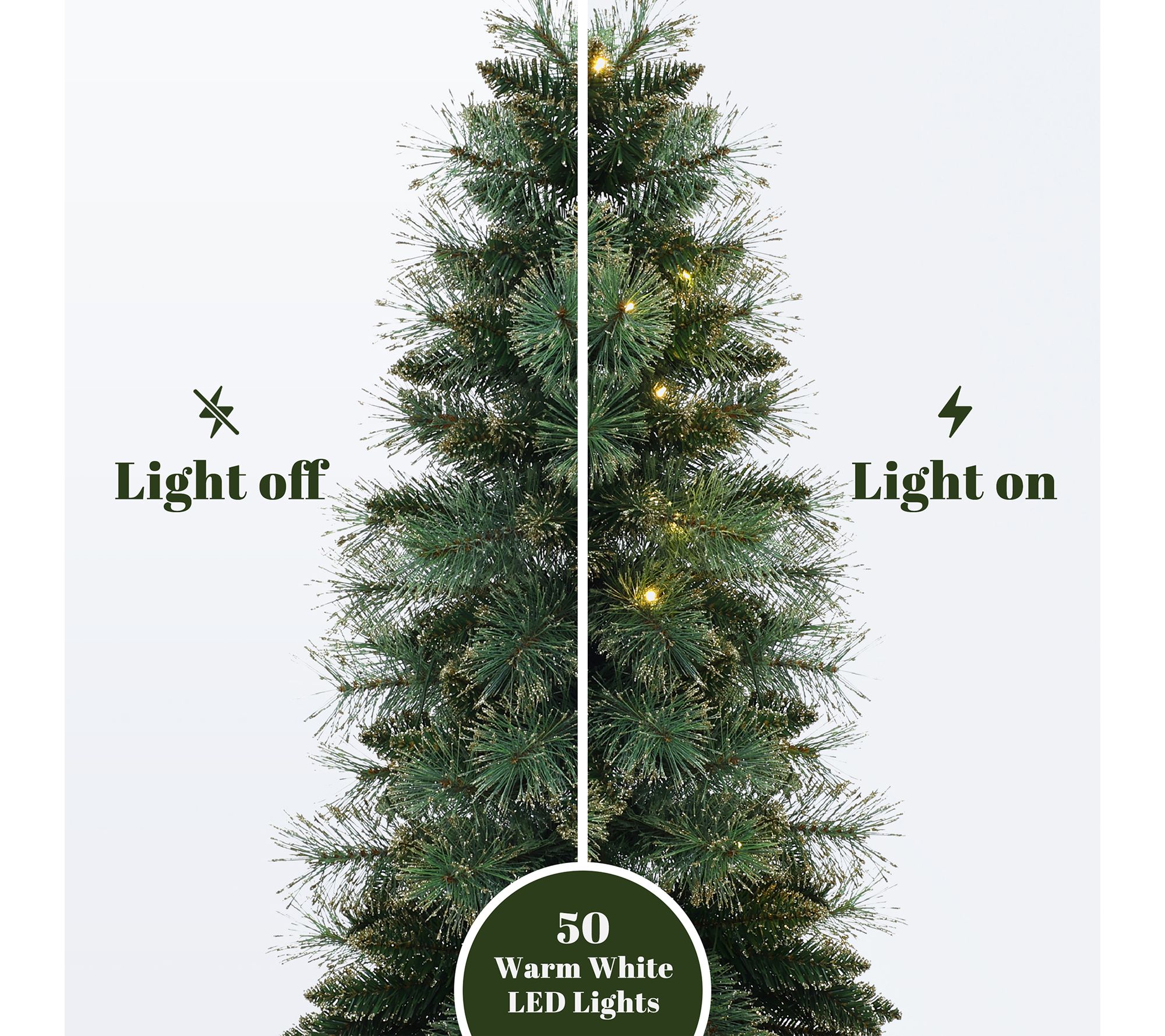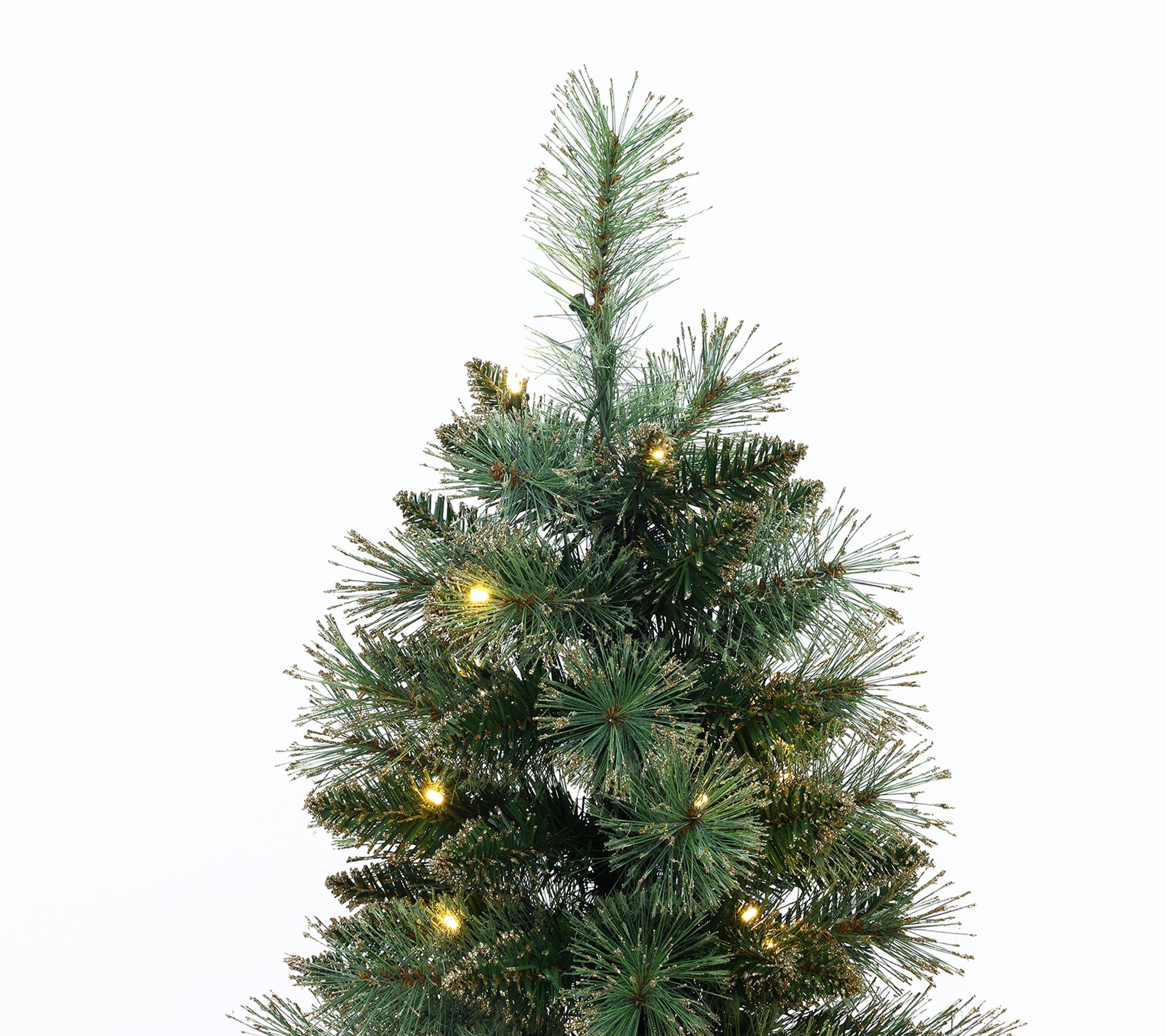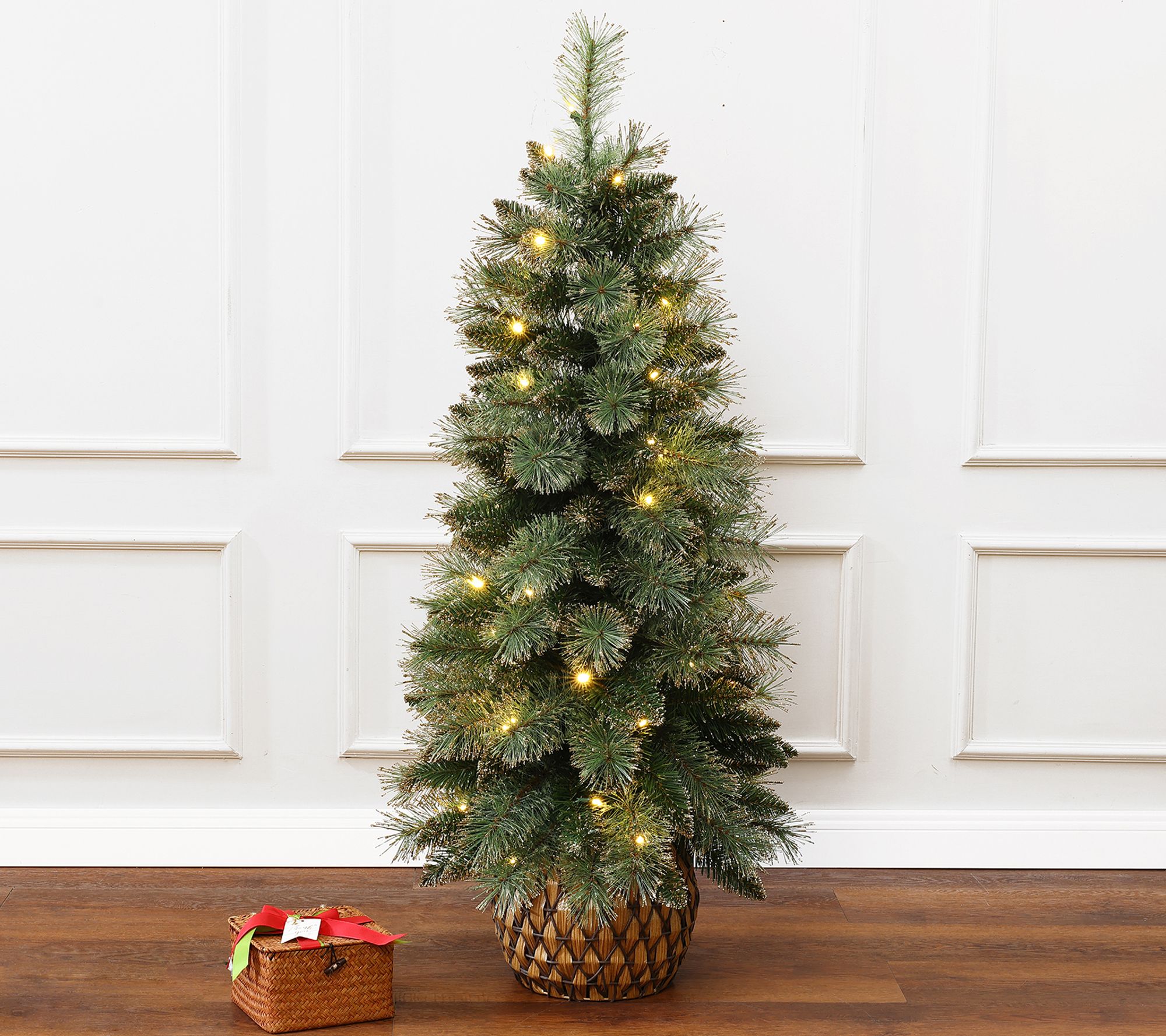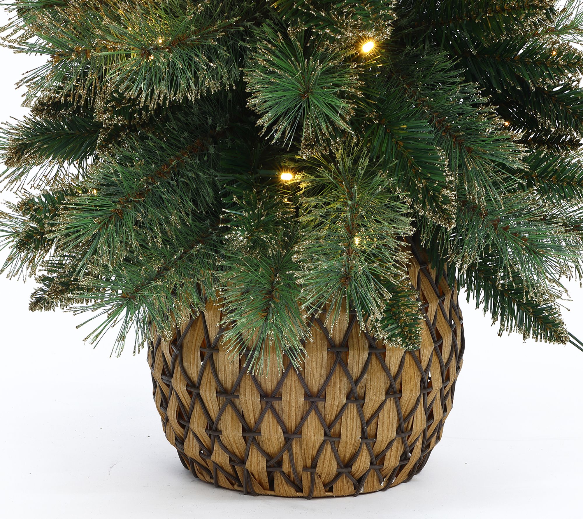 Infuse your home with holiday spirit by displaying this Christmas tree in your entryway, living room, or office. Glittered branches sparkle from every angle while warm LED lights cast a gentle glow for festive gatherings and seasonal moments. The woven pot gives this decor a rustic touch that blends easily with a variety of interiors. From LuxenHome.