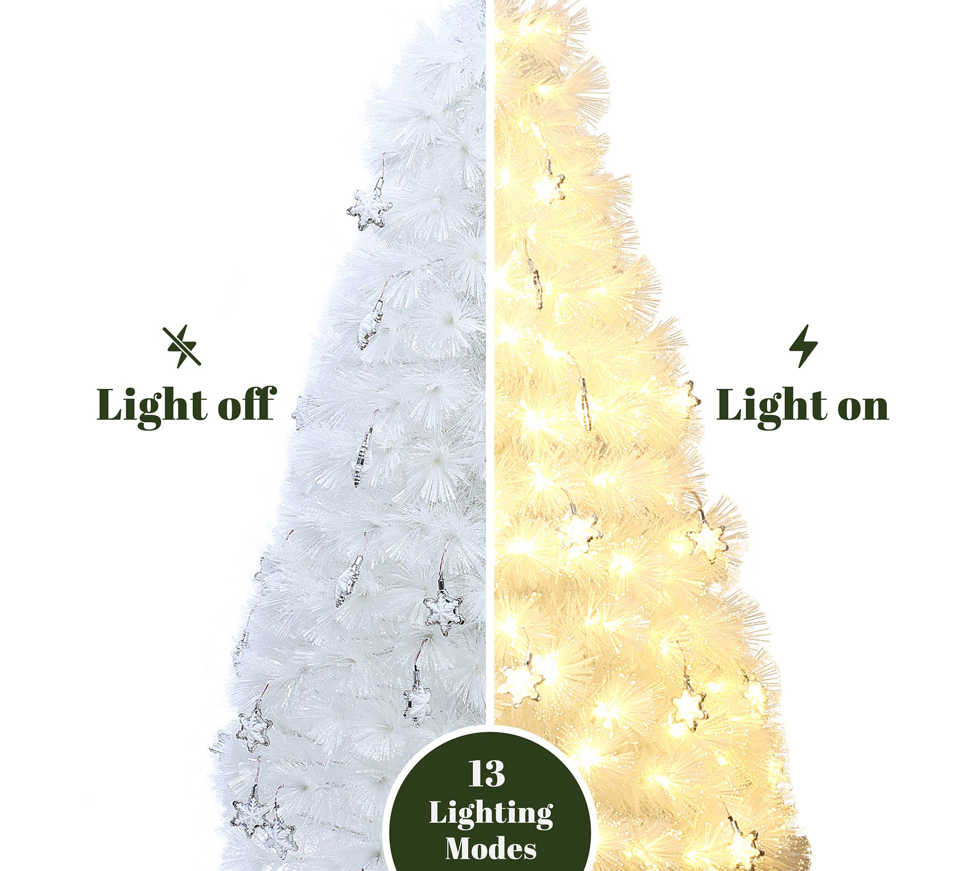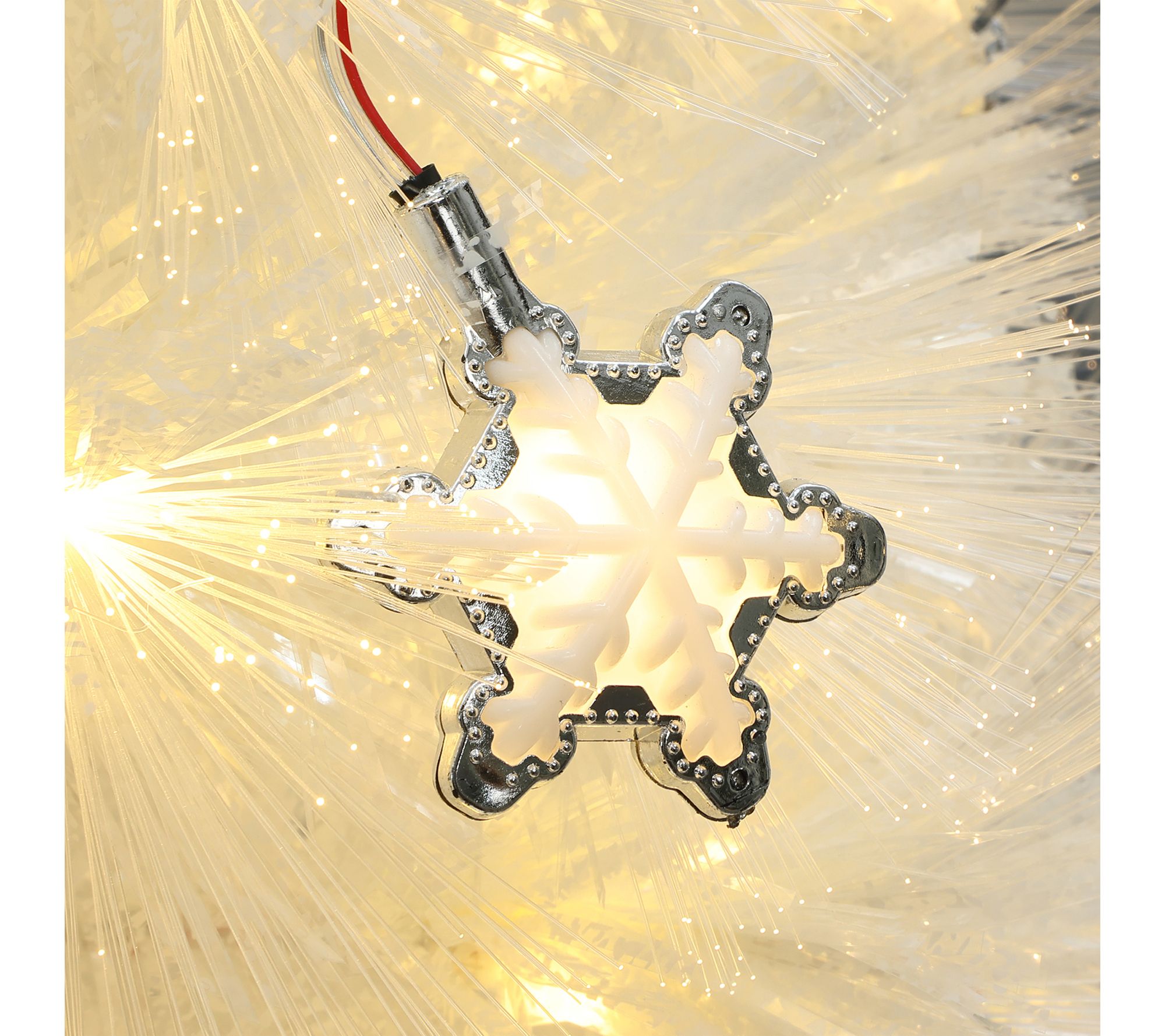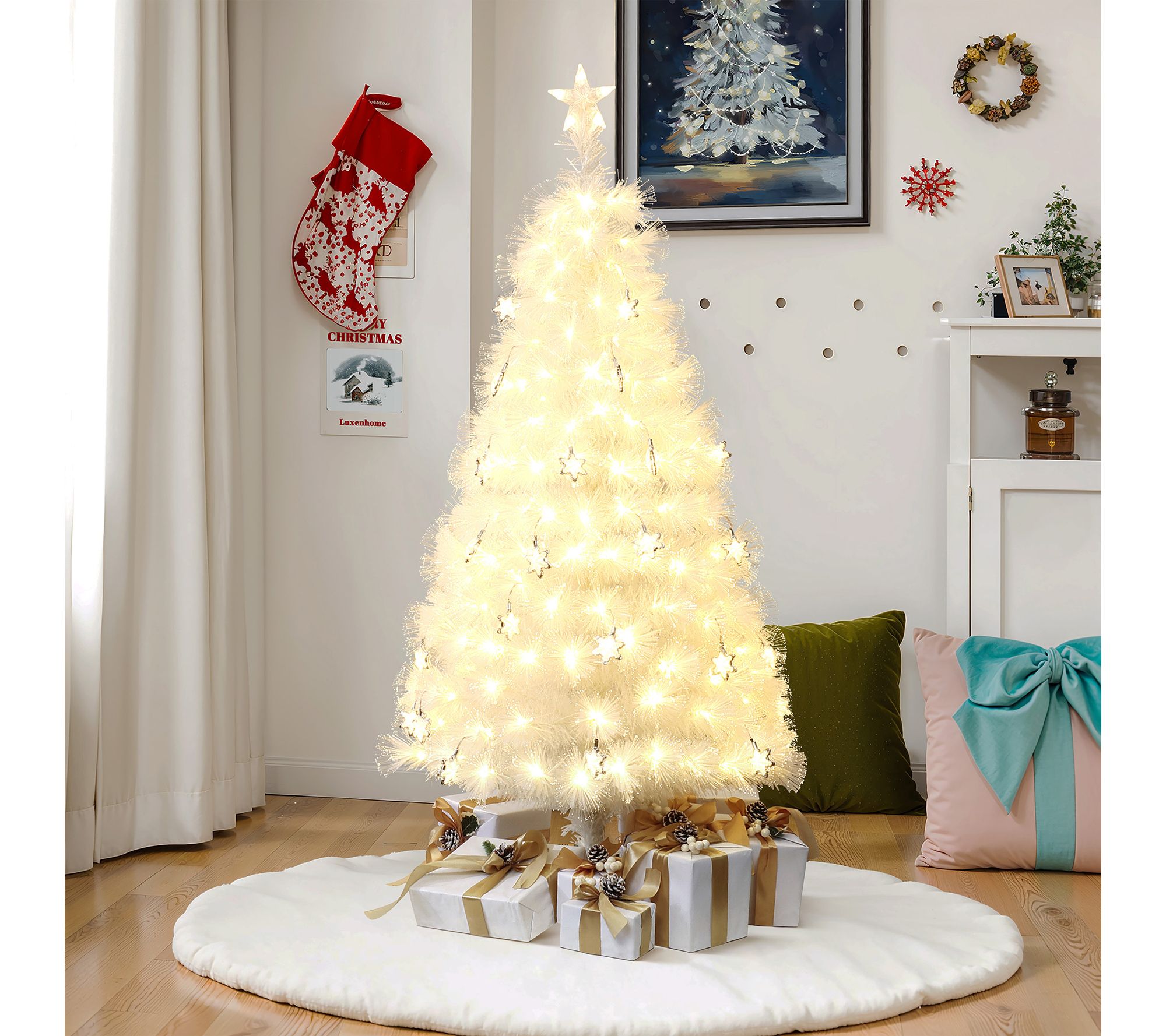 Set a festive mood in any room with this 5' fiber optic Christmas tree, full of glowing snowflake lights and shimmering white branches. Watch as vibrant colors and light effects dance through your living space, creating a magical holiday scene for gatherings, quiet evenings, or memorable photos. Display indoors for a cheerful centerpiece that brightens up apartments, bedrooms, or cozy corners. From LuxenHome.