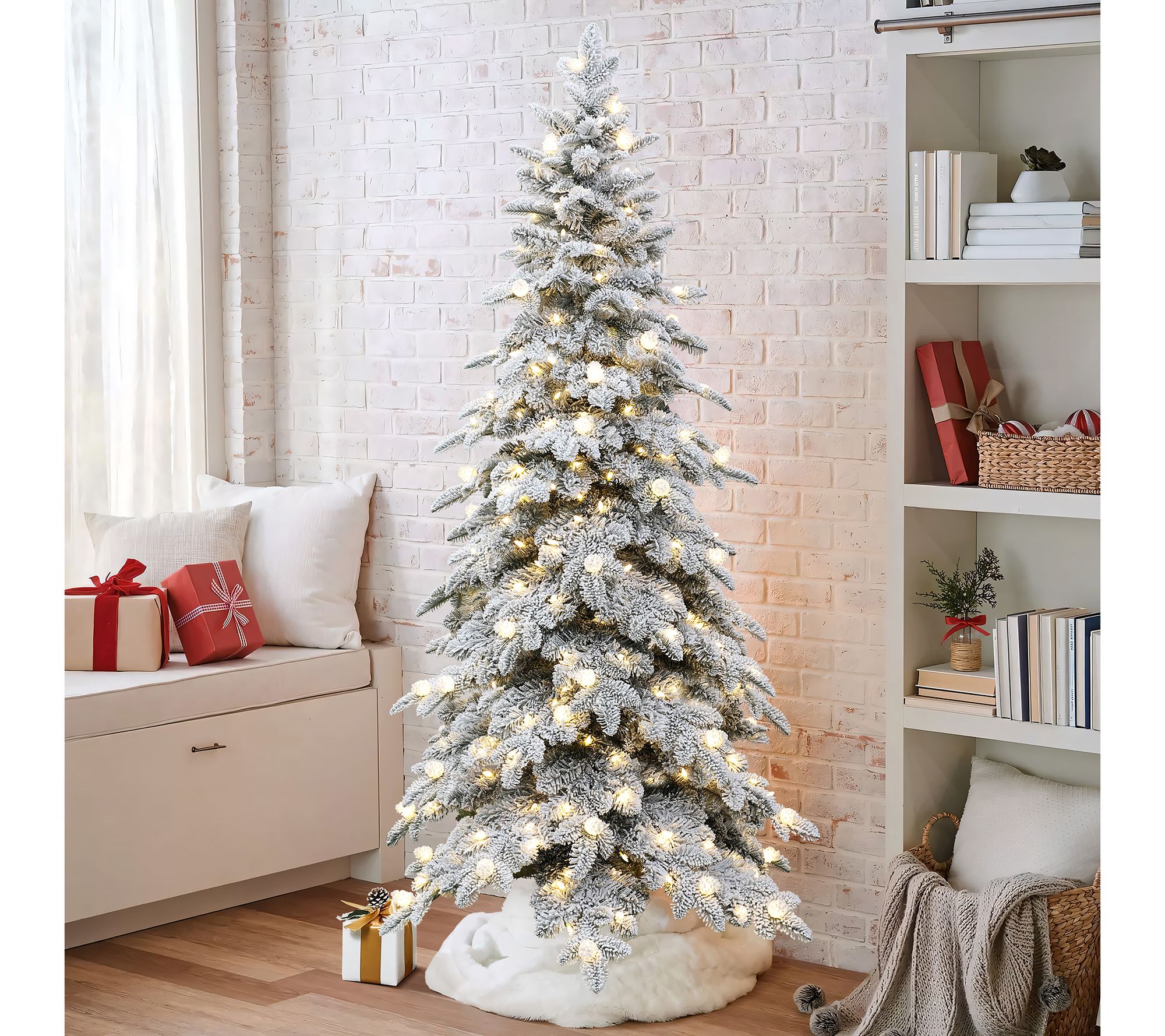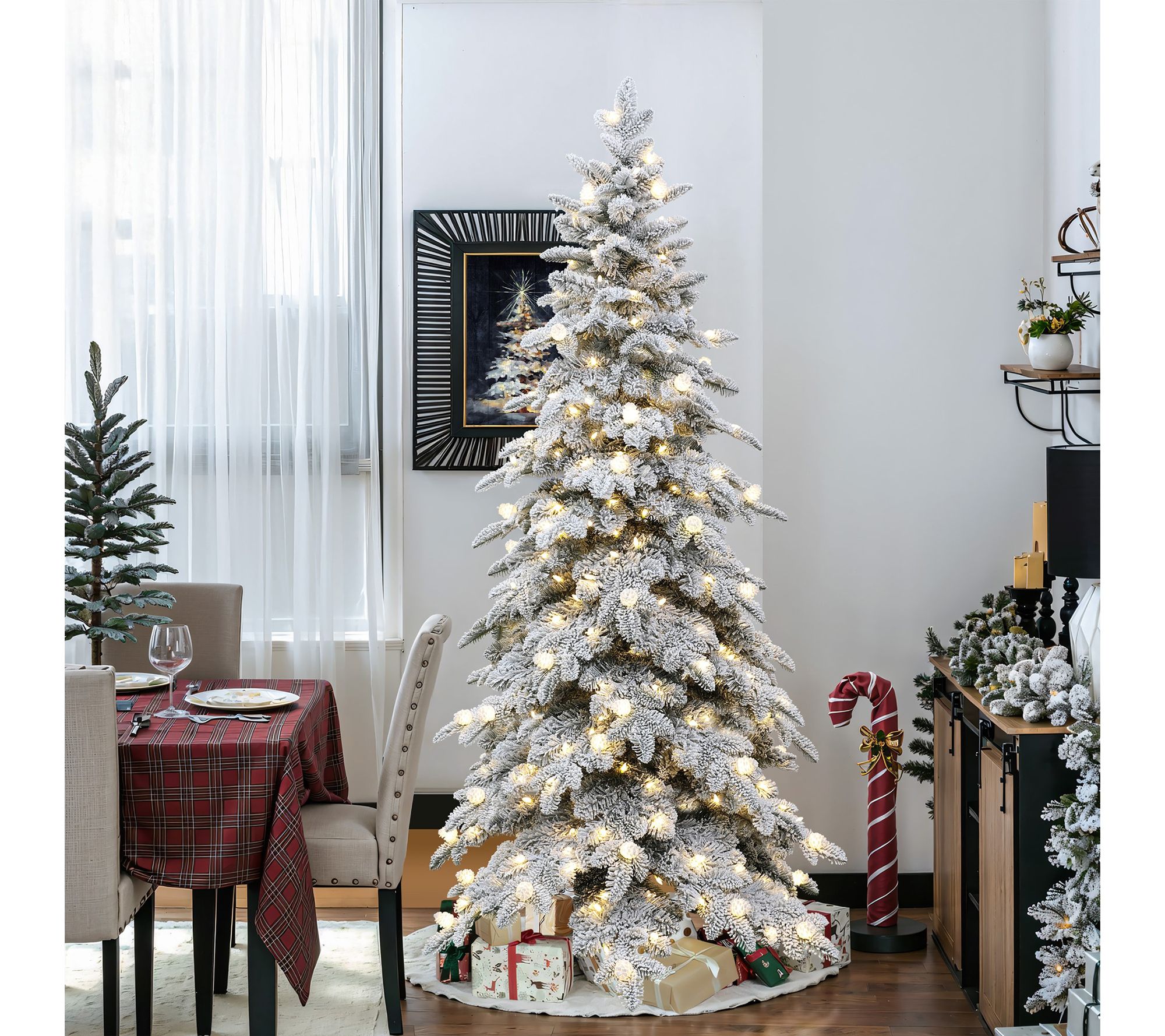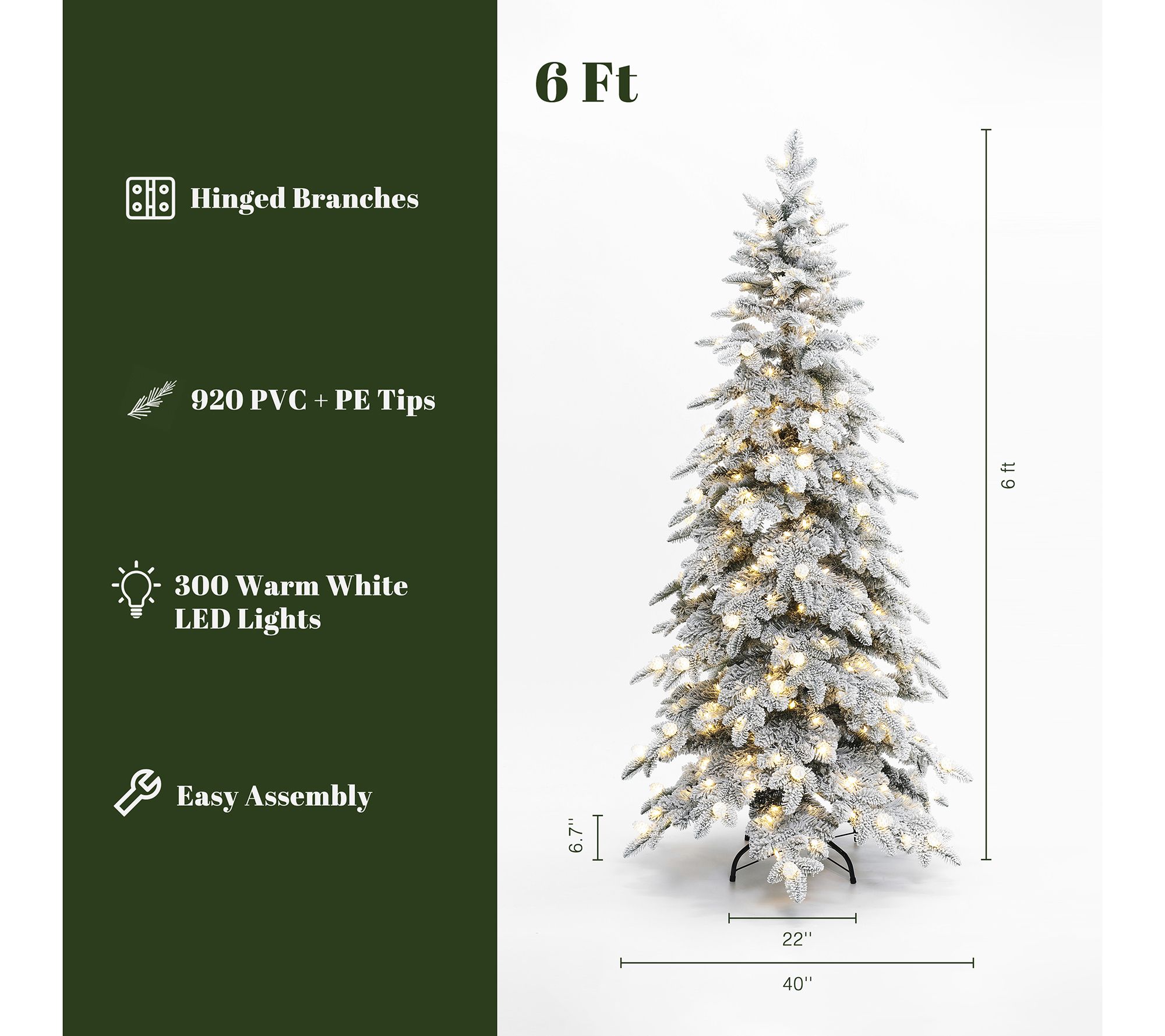 Celebrate the magic of Christmas with this flocked lifelike tree. With snow-dusted branch tips and pre-lit with 300 cone lights, it brings the beauty of a winter wonderland into your home. Quick to assemble with hinged branches and a sturdy metal stand, this showstopper will captivate every guest. From LuxenHome.