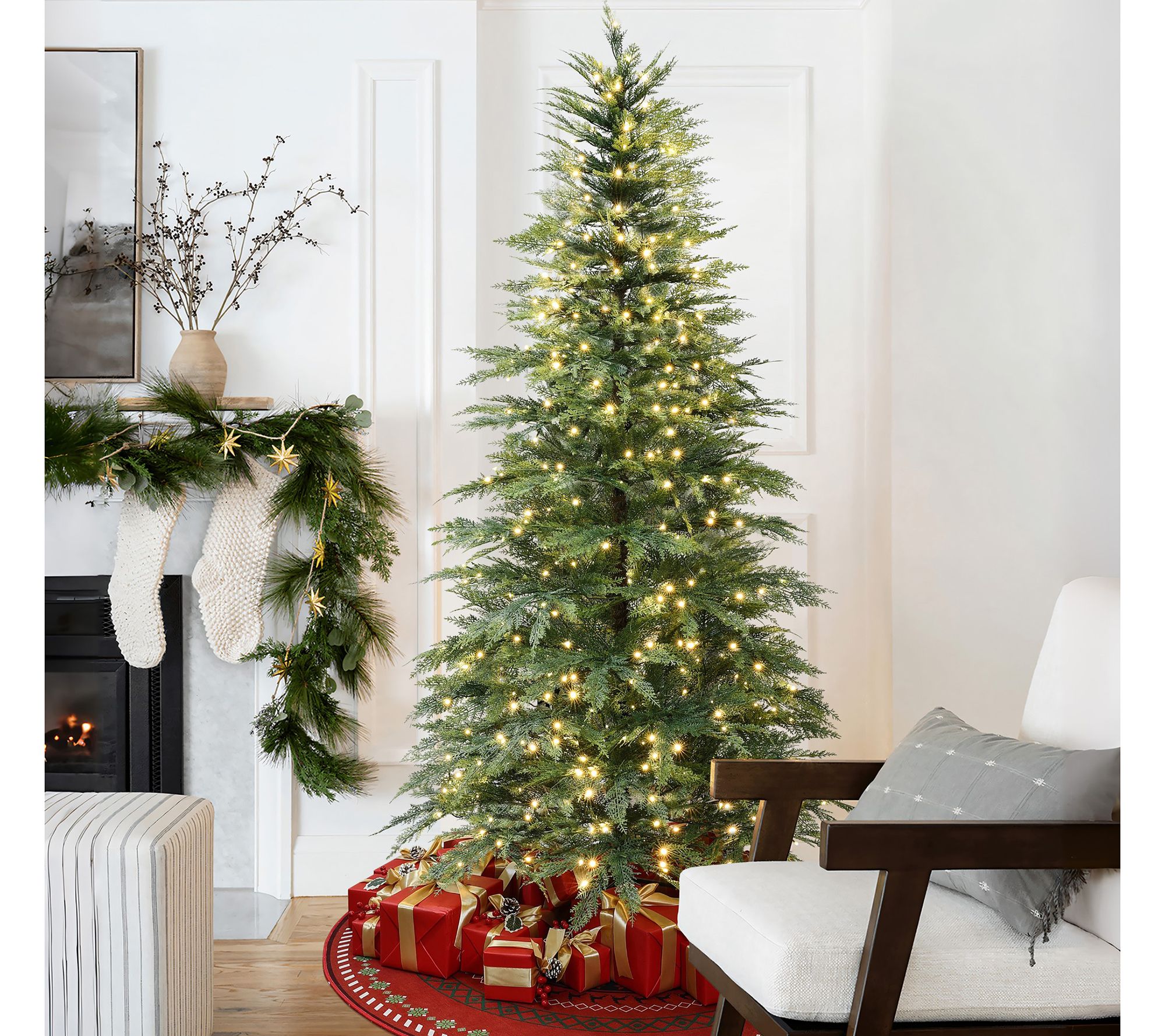 Bring the holiday spirit into your home with the LuxenHome Green Cypress artificial tree. This tree is meticulously designed to capture the authentic look of cypress trees and comes pre-lit with LED lights, casting a warm white glow. Setting up is a breeze with its hinged connections, making your holiday preparations easier than ever. From LuxenHome.
