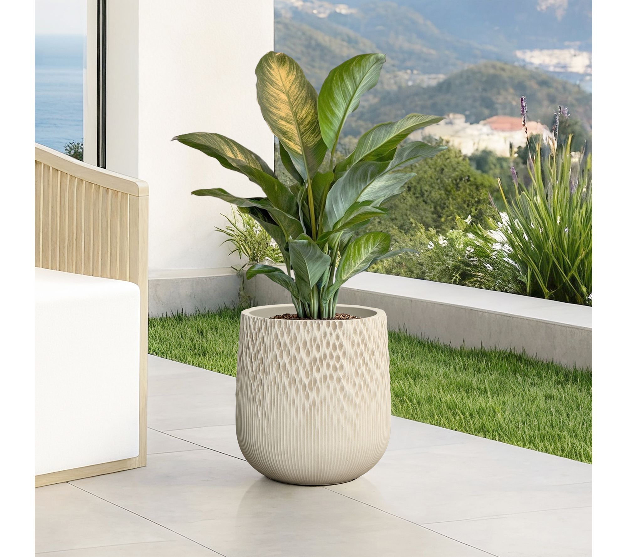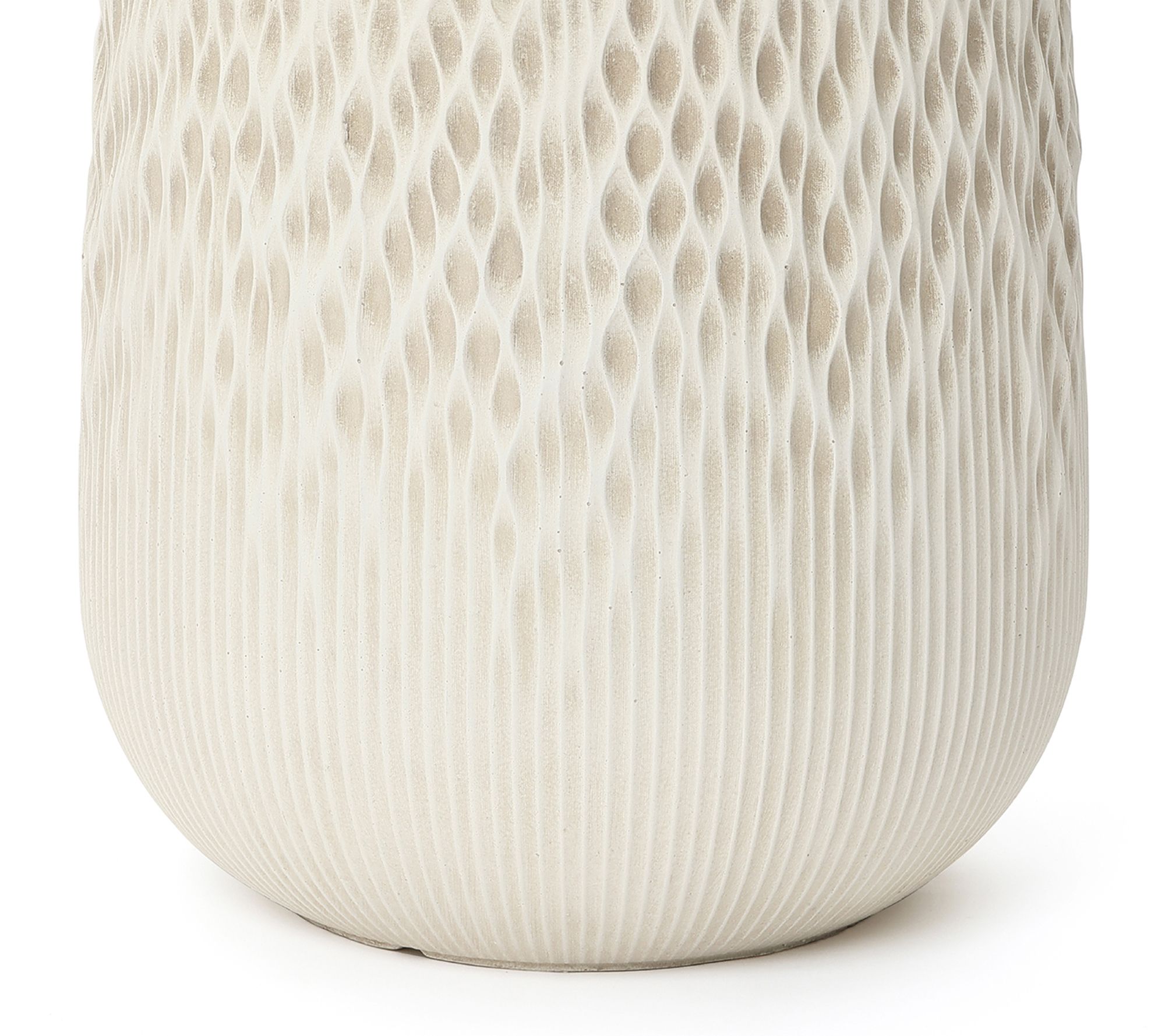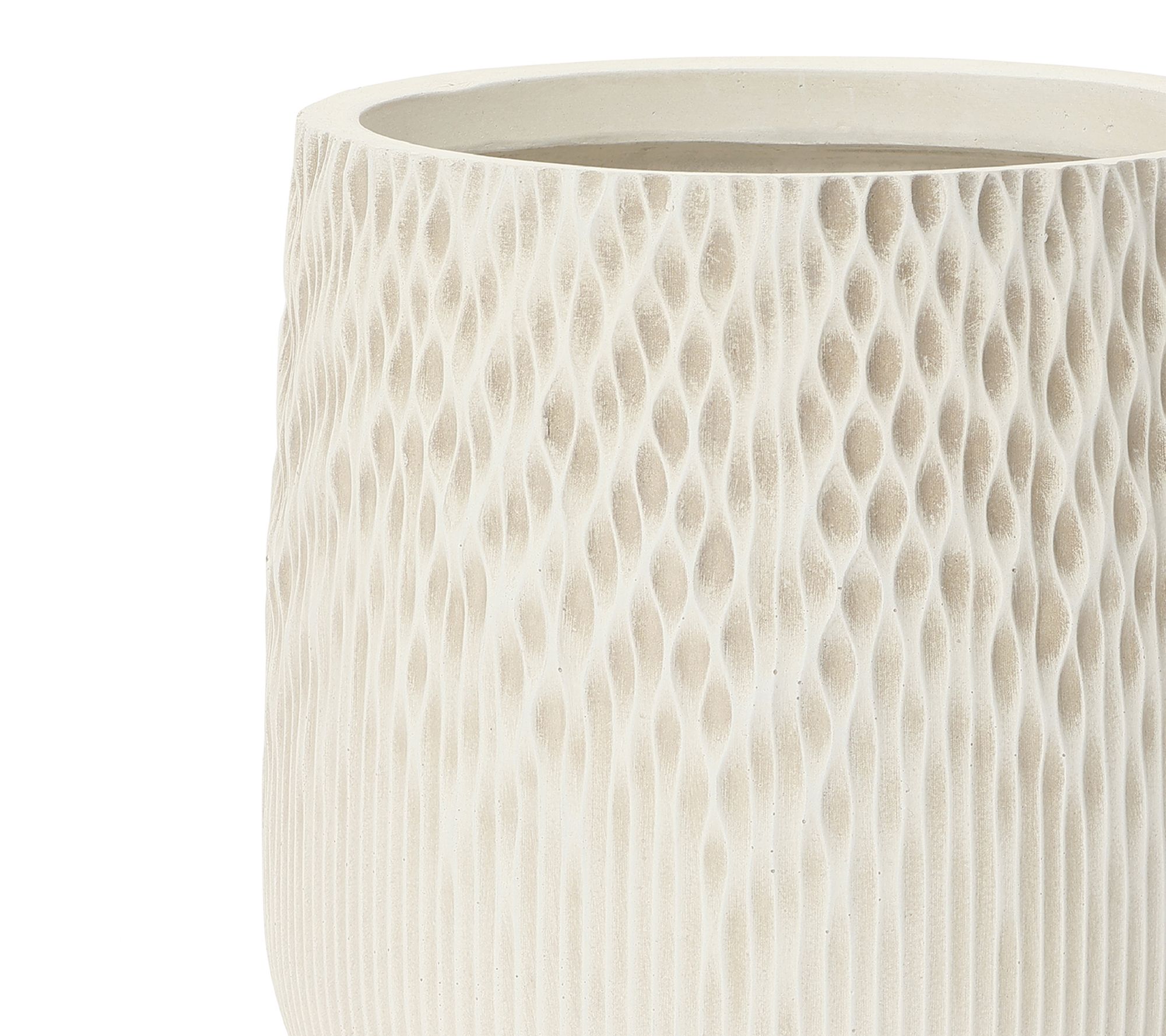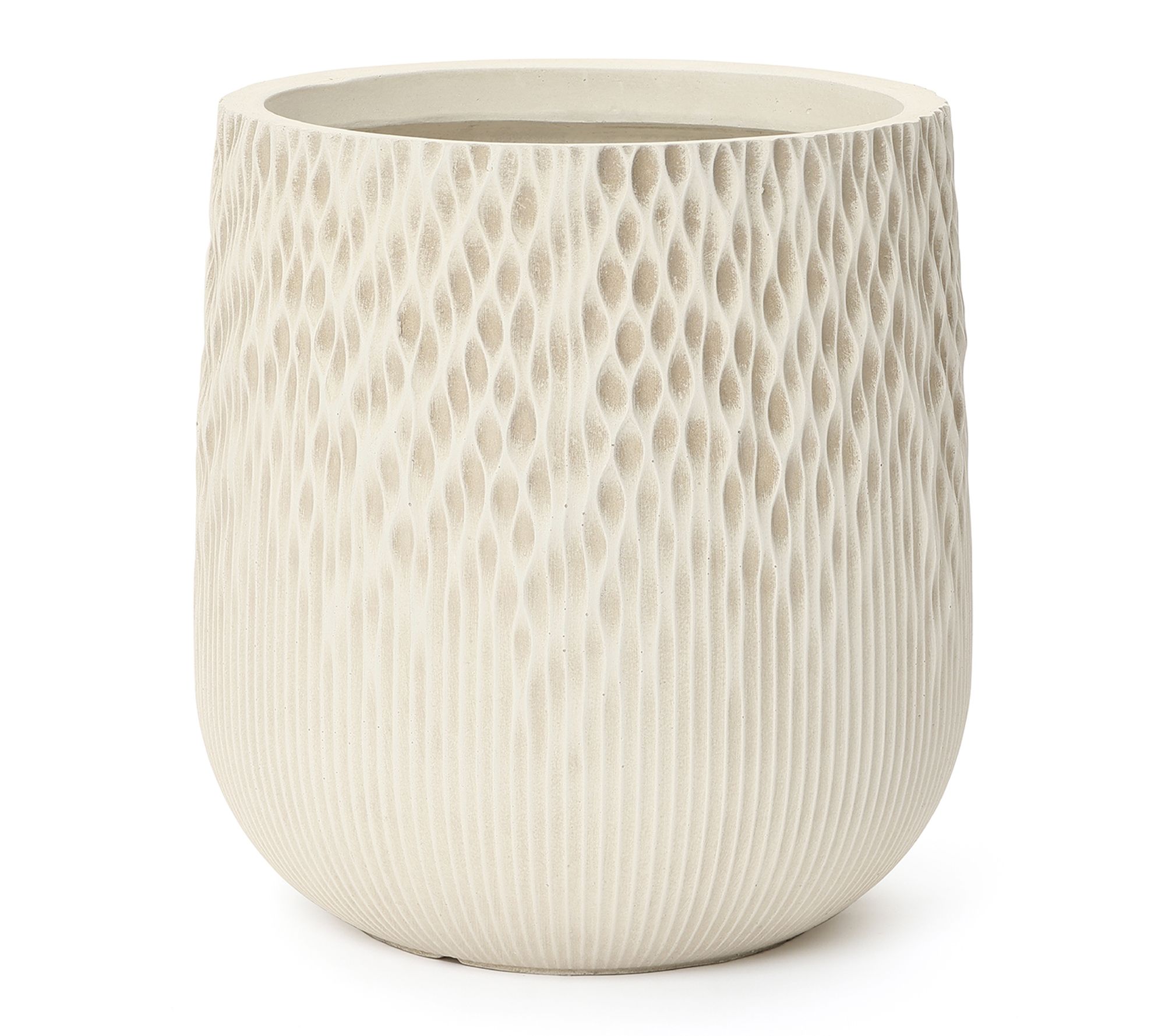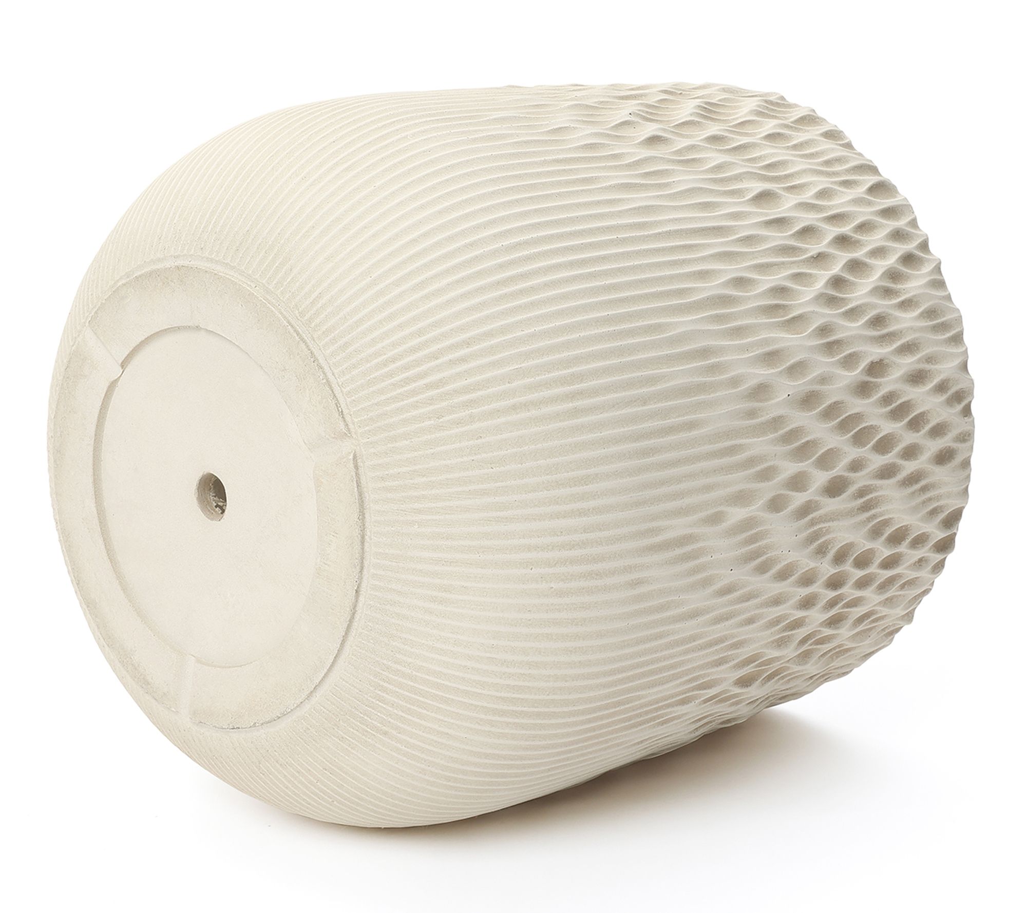 Bring understated artistry to your favorite greenery with this round planter, finished in antique off-white and sculpted with a gradient wave texture. Its elegant silhouette fits seamlessly into living rooms, patios, or gardens, offering modern flair while the drainage hole and removable plug help your plants thrive. From LuxenHome.