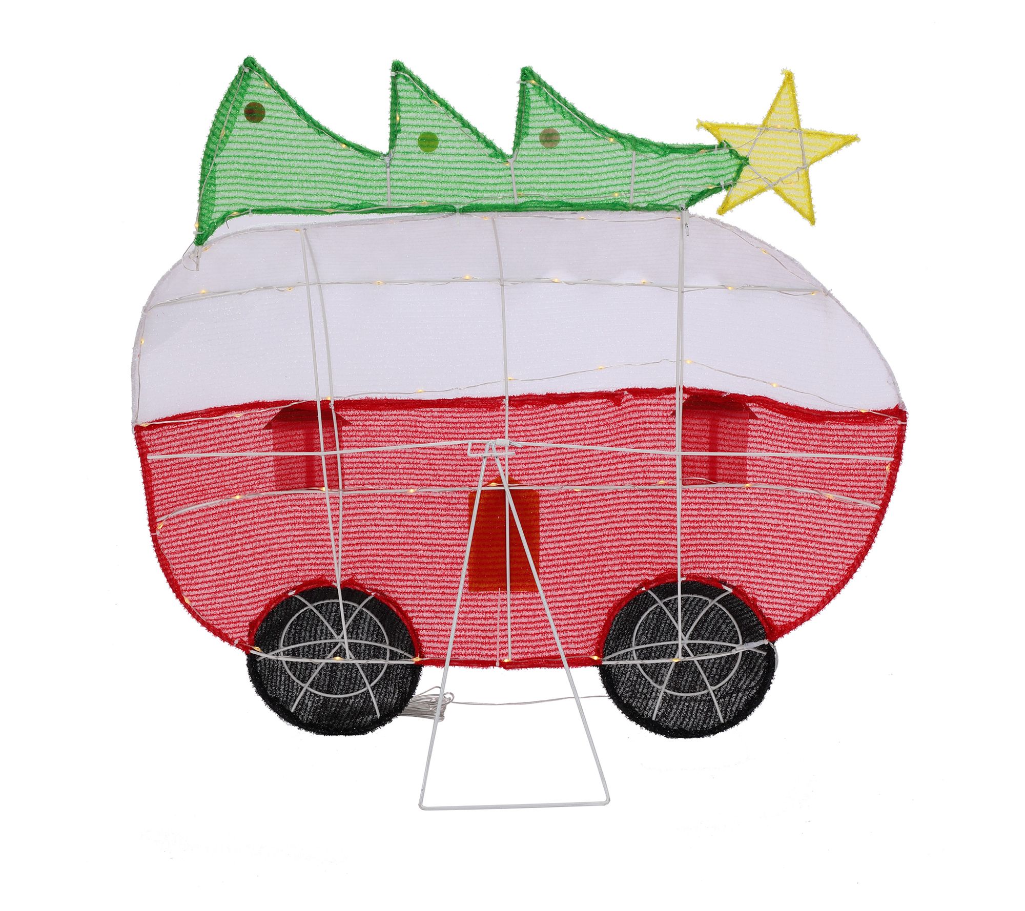 Styled to resemble a vintage camper trailer, this holiday decoration with a Christmas tree on top is ready to roll! From LuxenHome.