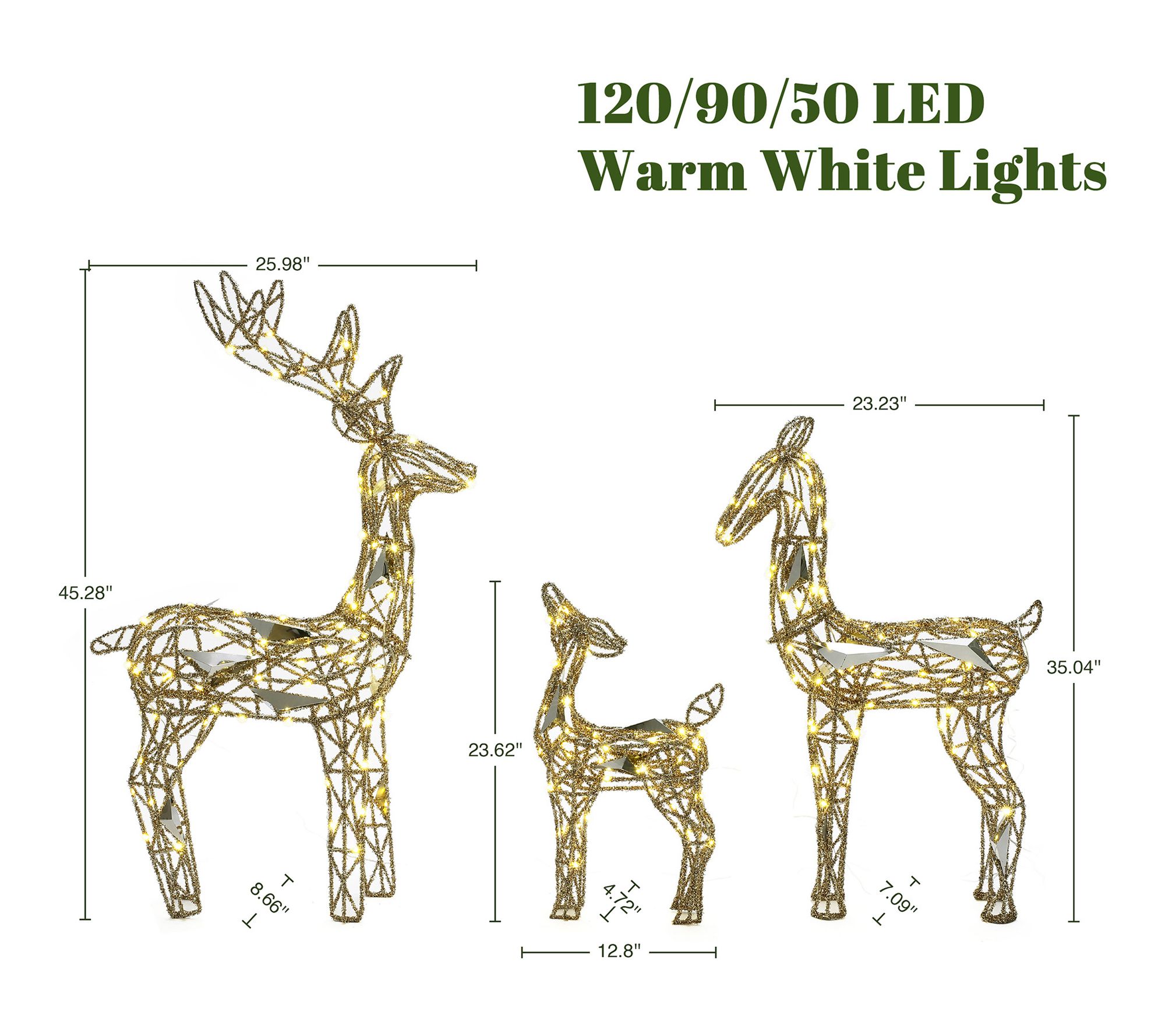 Measures large deer 45.25"H x 25.98"W x 8.66"D; medium deer 35.04"H x 23.23"W x 7.09"D; small deer 23.62"H x 12.8"W x 4.72"D; overall cord length 6'