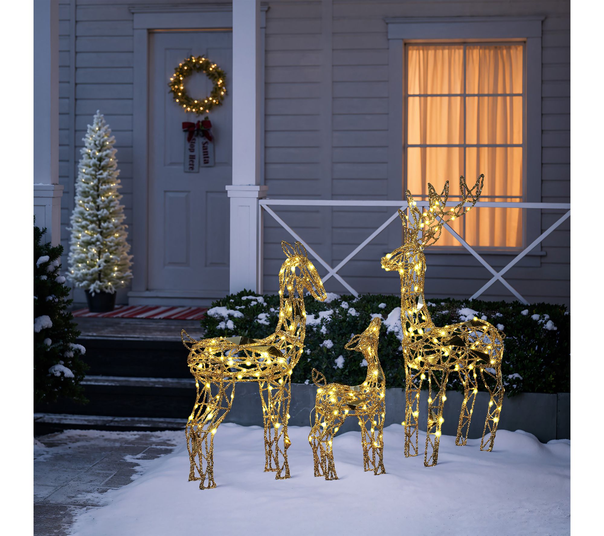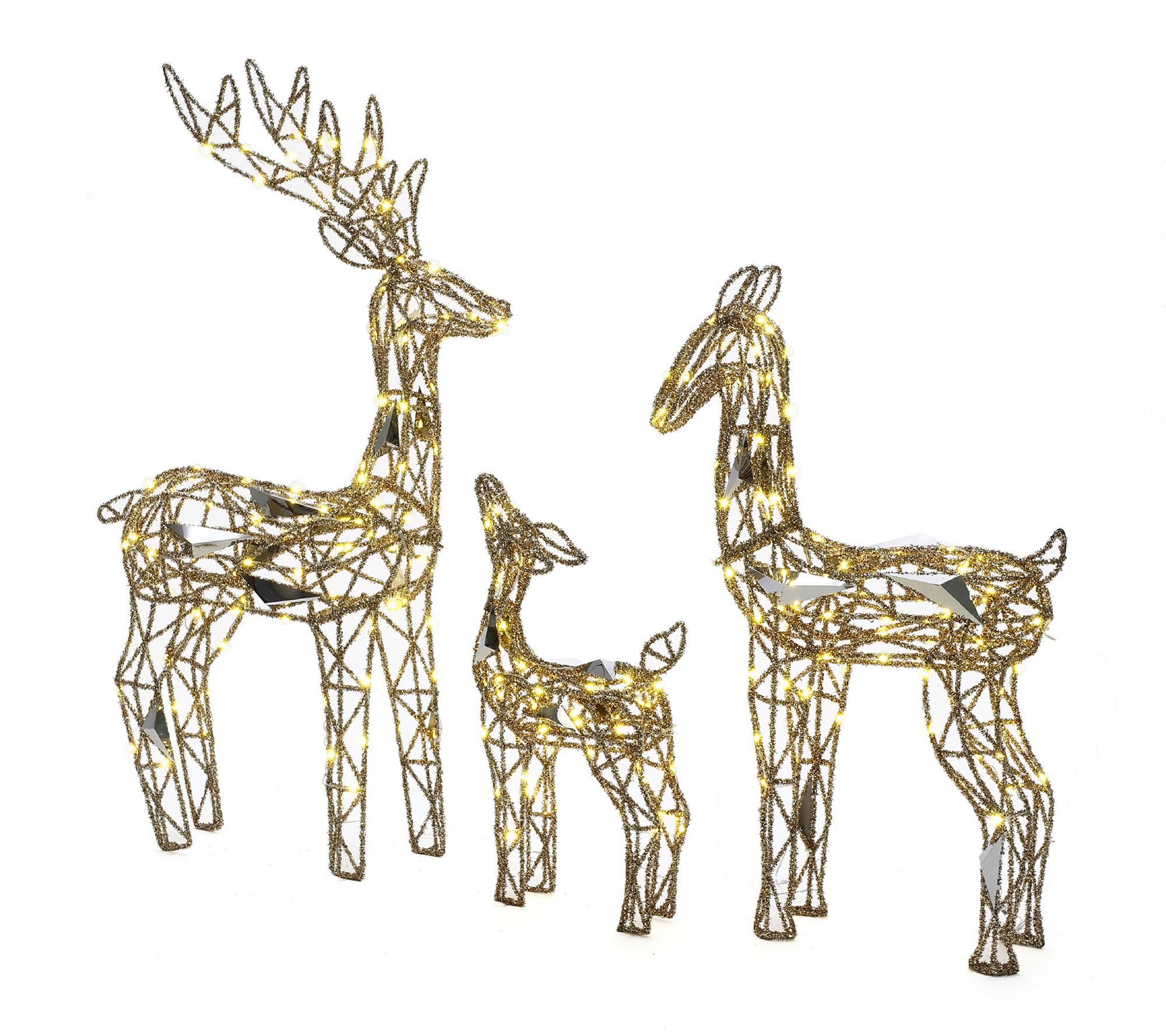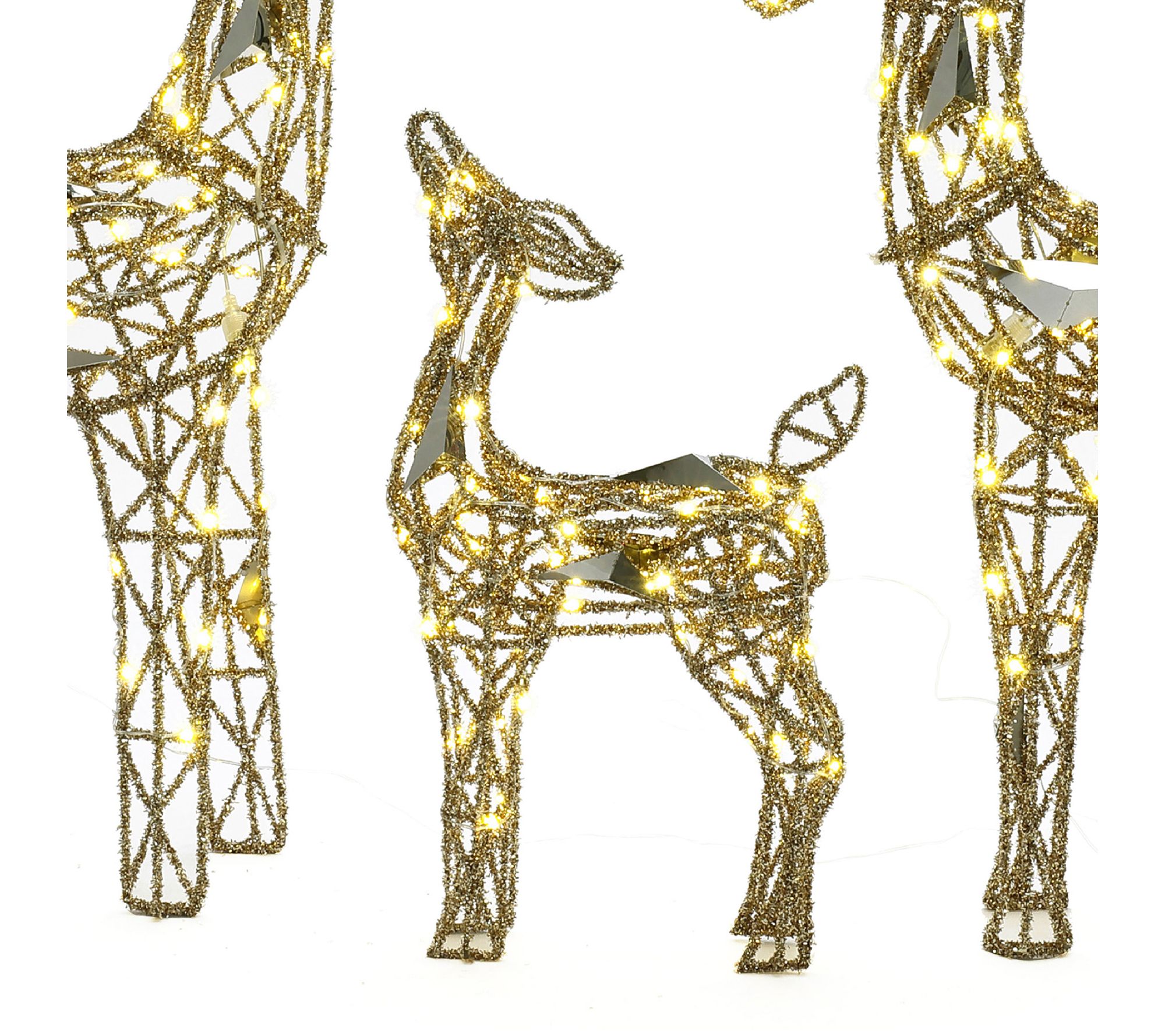 Glistening gold glitter and warm white LED lights create a magical scene with this deer decoration set, perfect for brightening up your lawn or porch during the holidays. With three figures -- a buck, doe, and fawn -- it's easy to set the stage for festive gatherings and memorable evenings as they shine in your outdoor space. From LuxenHome.