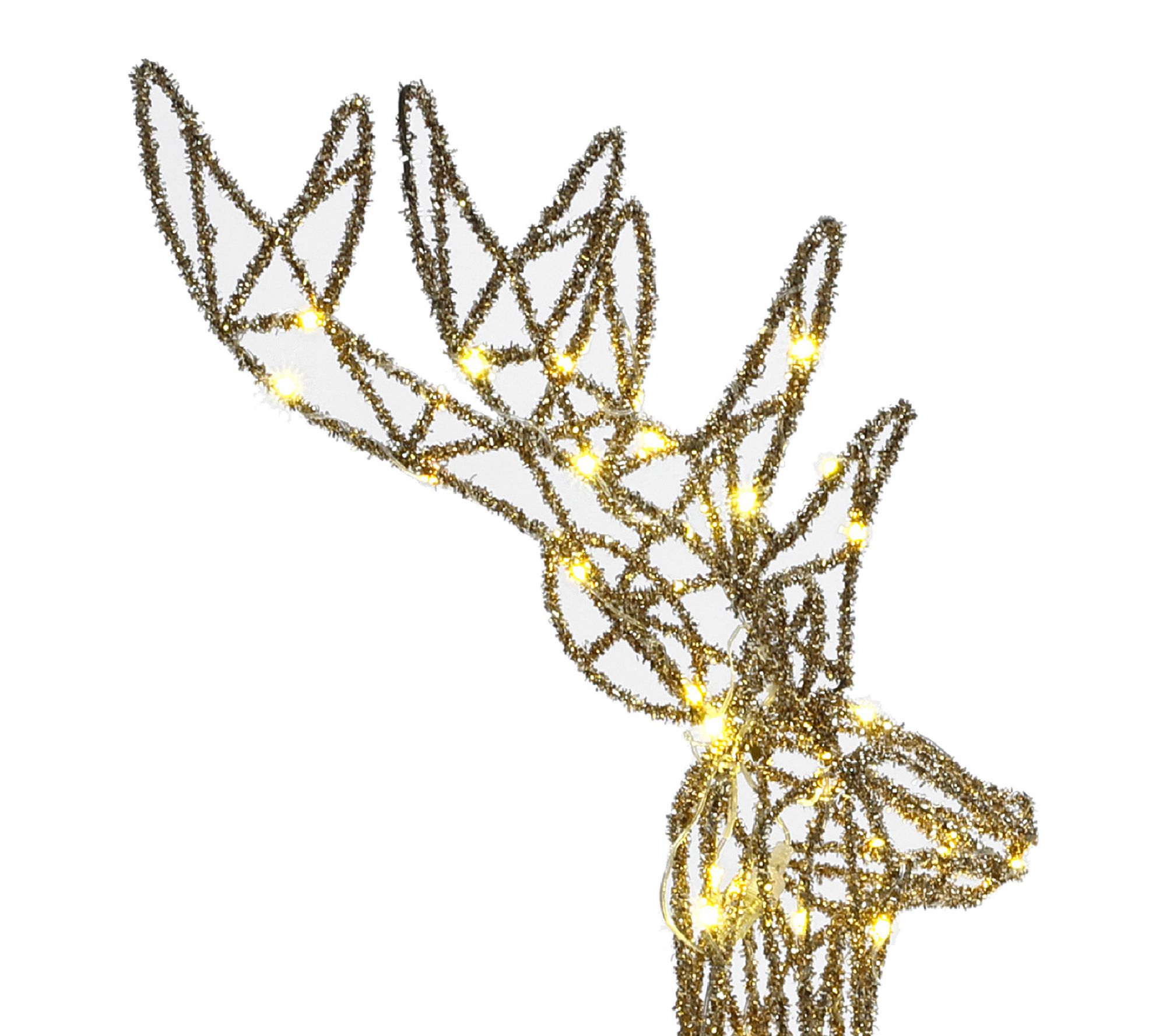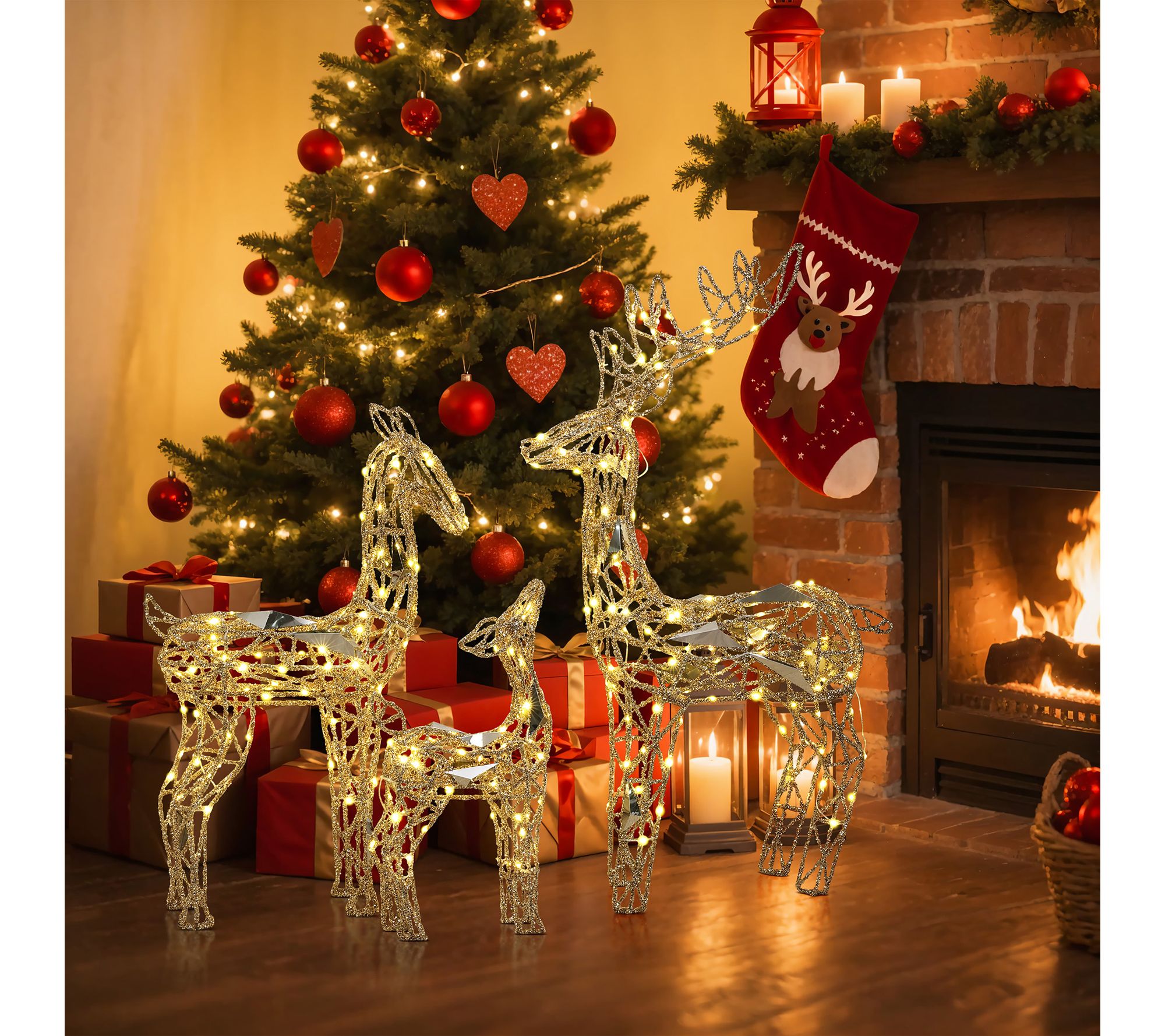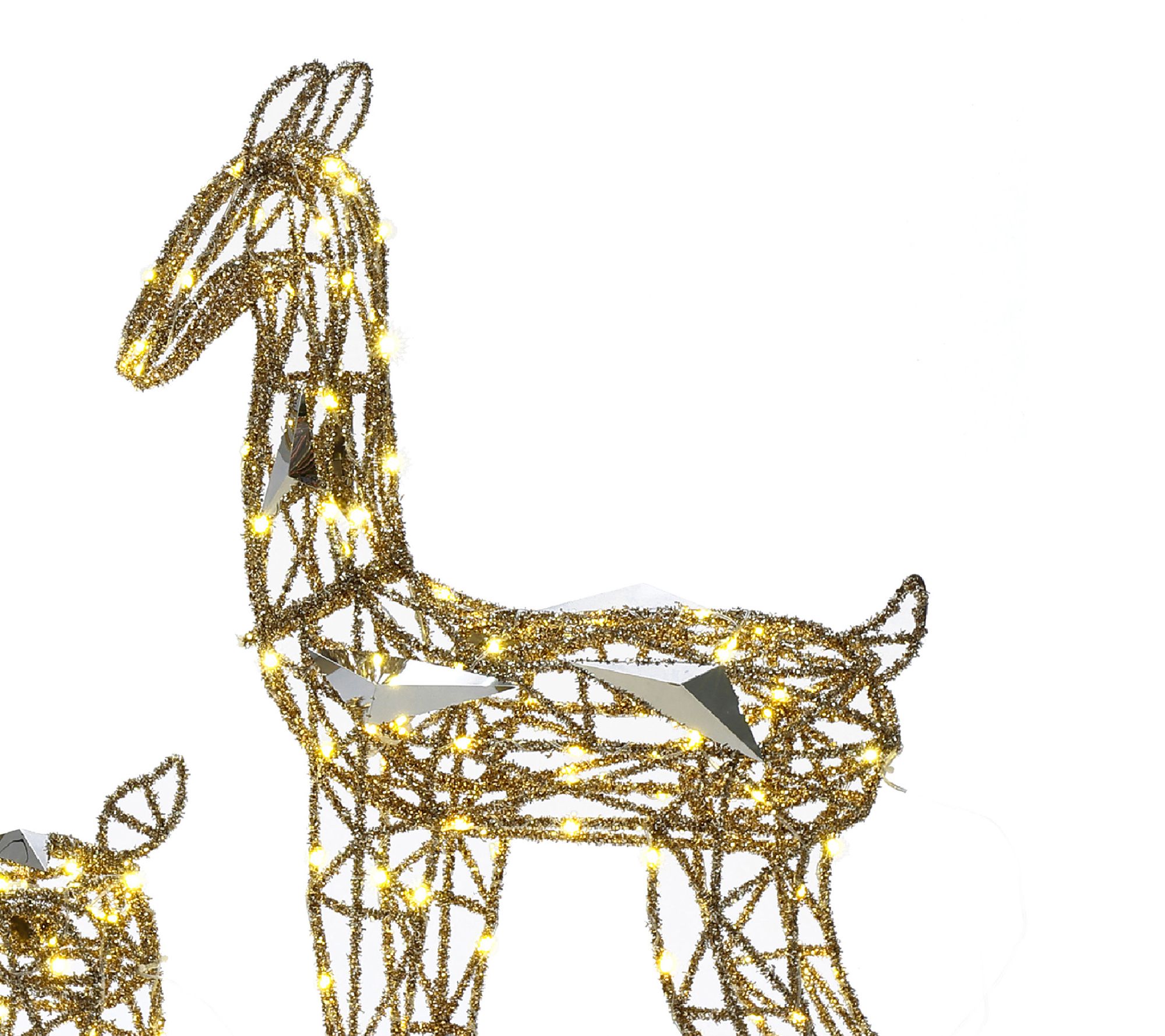 Glistening gold glitter and warm white LED lights create a magical scene with this deer decoration set, perfect for brightening up your lawn or porch during the holidays. With three figures -- a buck, doe, and fawn -- it's easy to set the stage for festive gatherings and memorable evenings as they shine in your outdoor space. From LuxenHome.