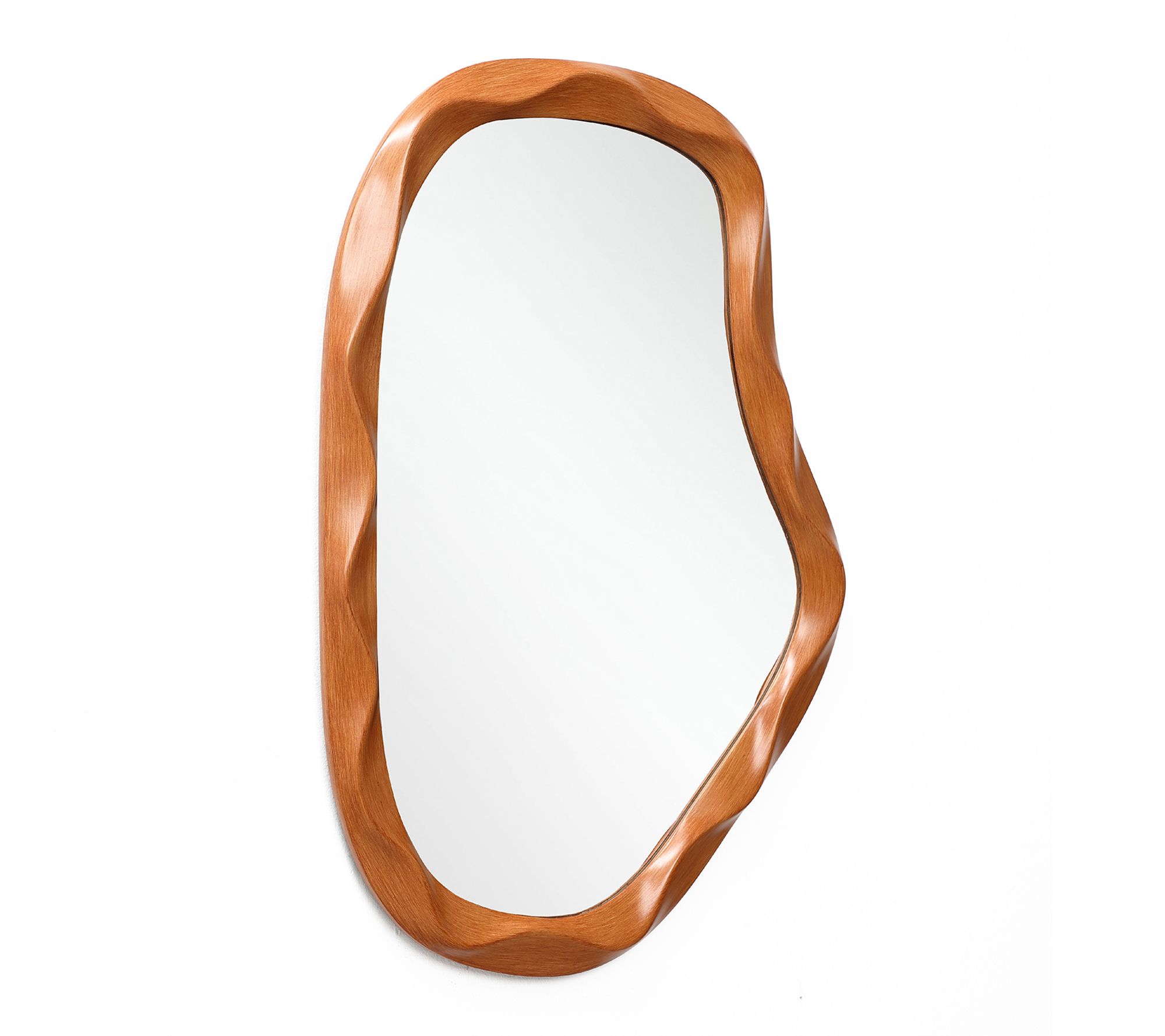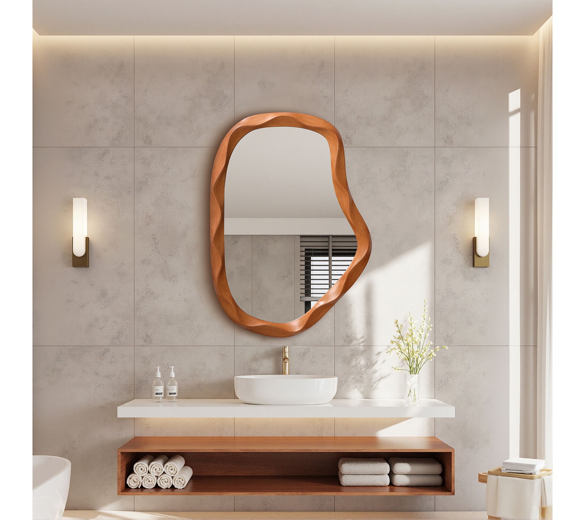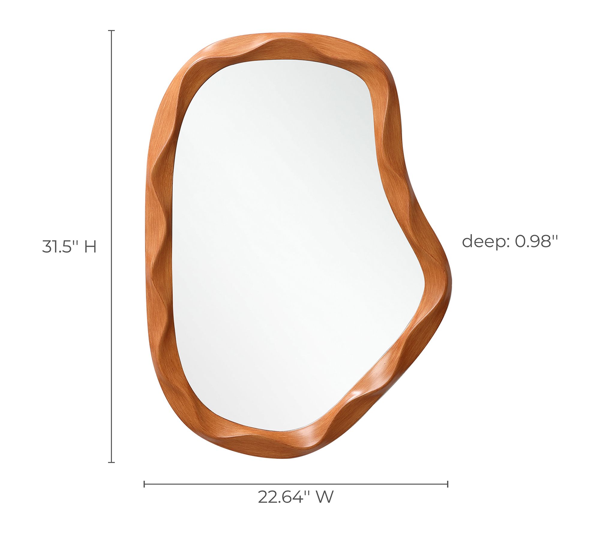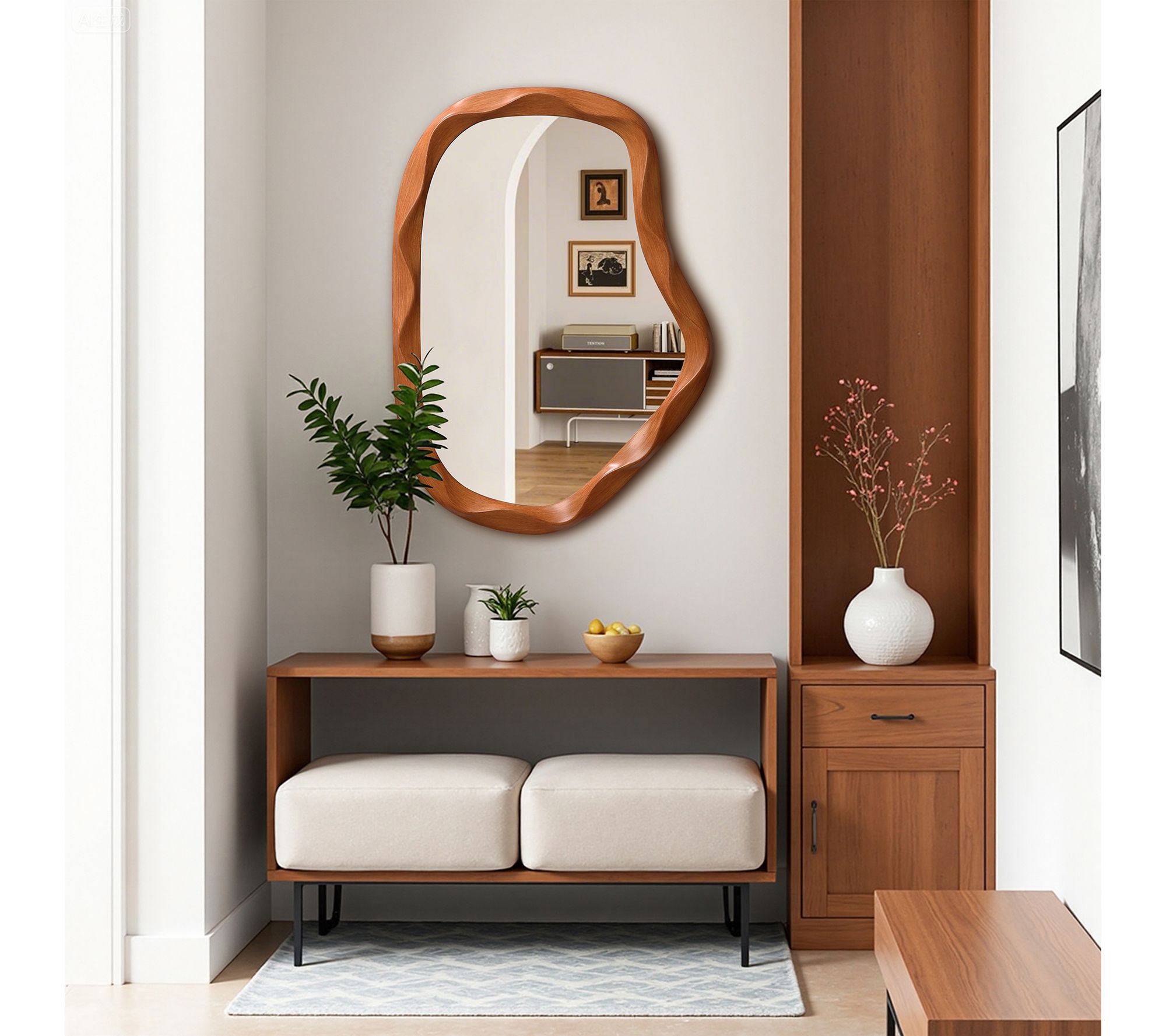 • Modern, irregular decorative accent mirror with golden brown MDF wood frame