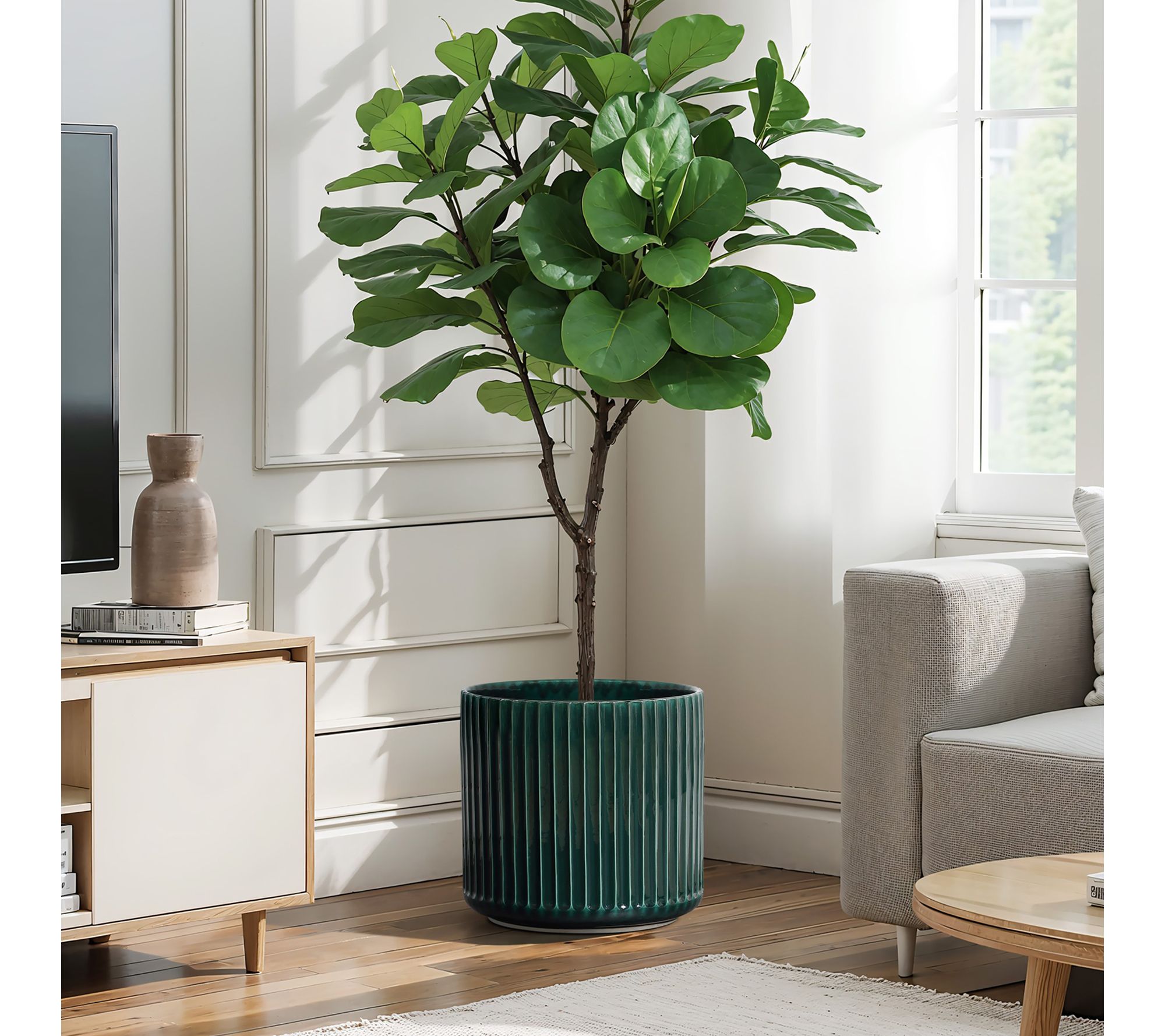 Breathe new life into your space with this round ceramic planter, featuring an alluring jade green glaze and vertical ribbed stripes that bring modern flair to your garden or home. The spacious design welcomes everything from leafy foliage to colorful blooms and includes a drainage hole and plug for easy upkeep, making it a versatile choice for both indoor and outdoor use. From LuxenHome.
