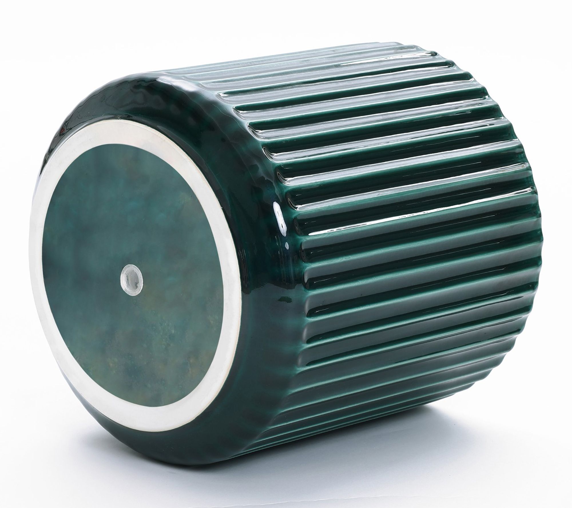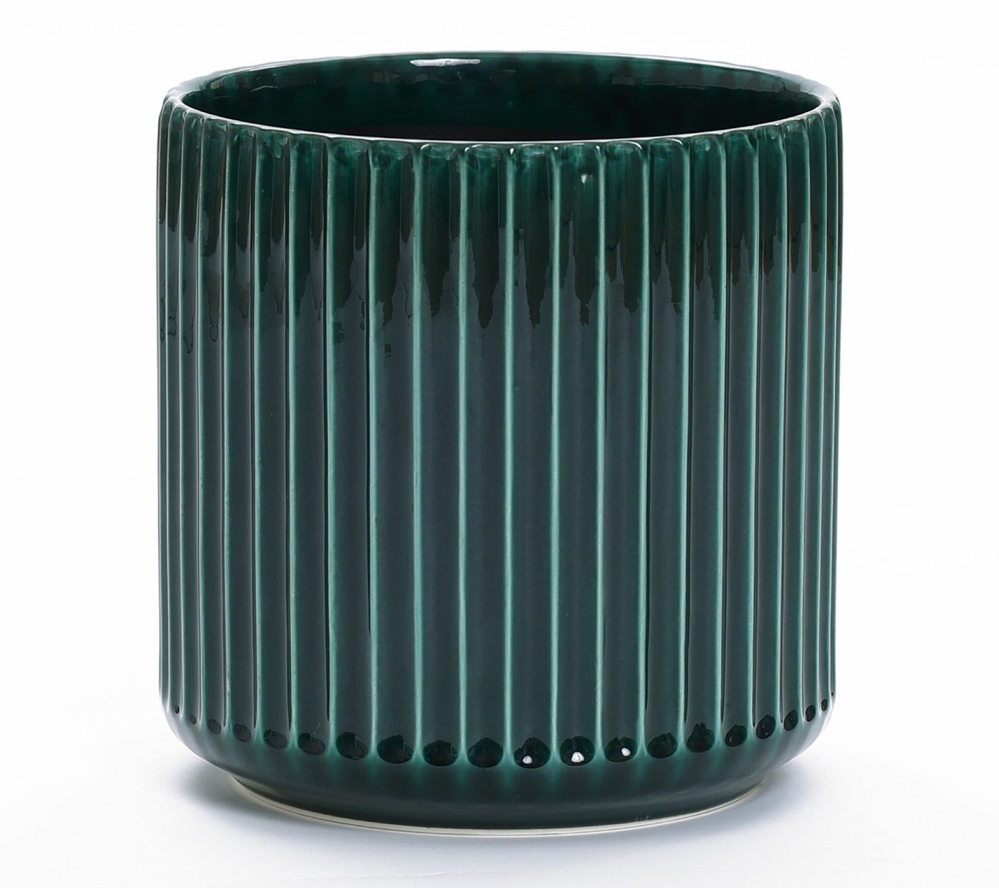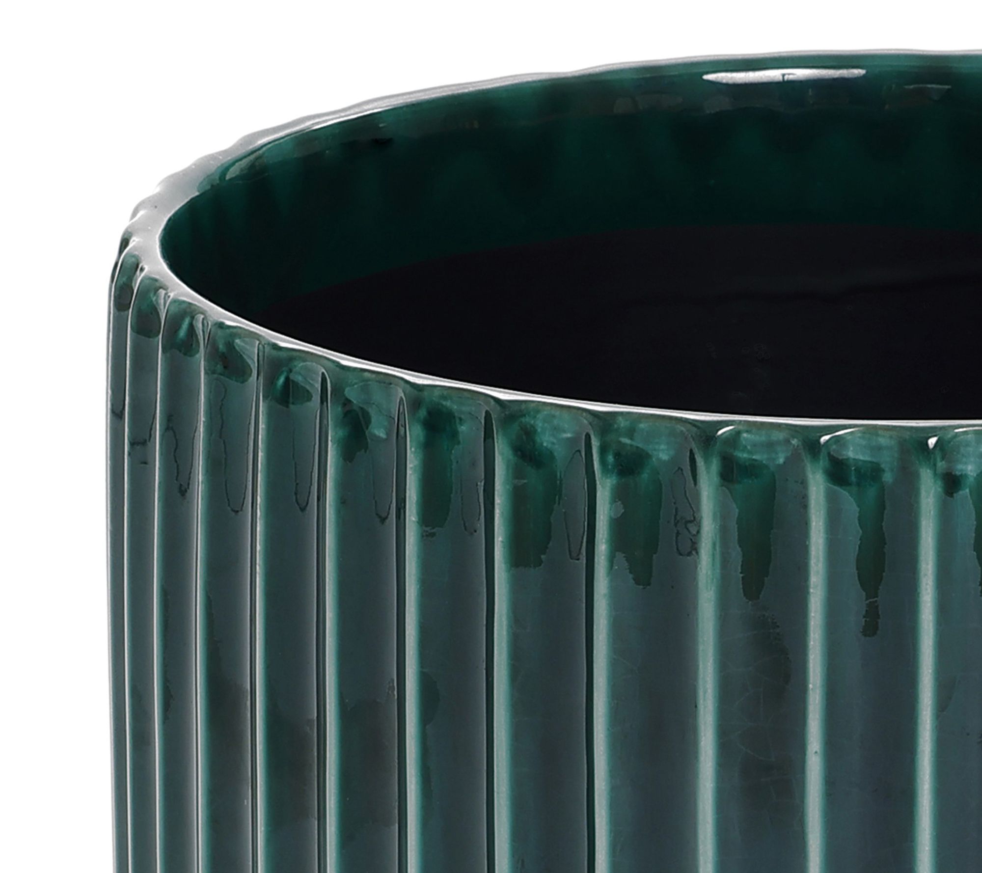 • Smooth jade green ceramic planter with vertical ribbed stripes