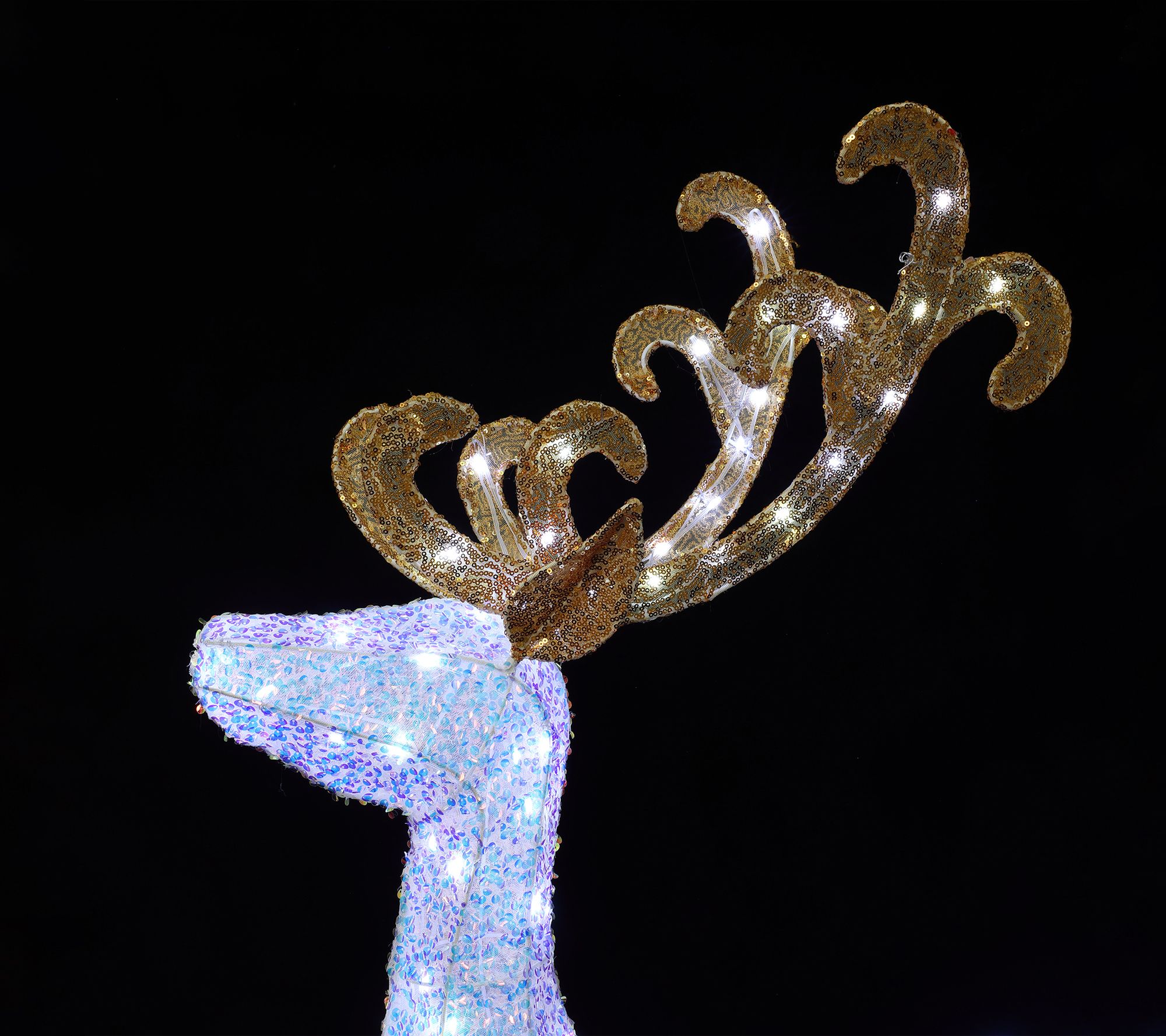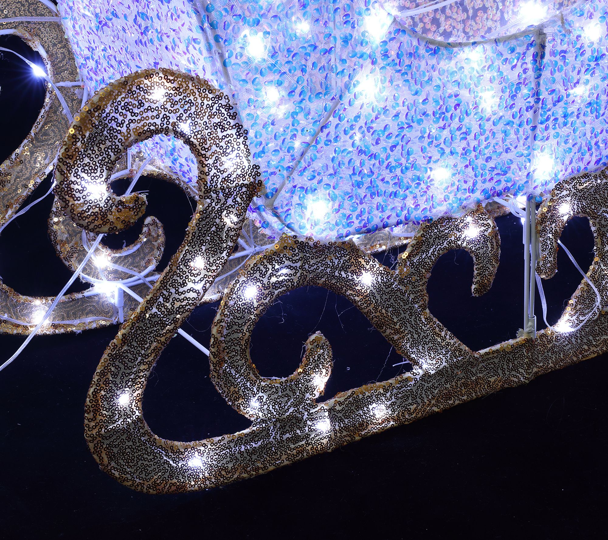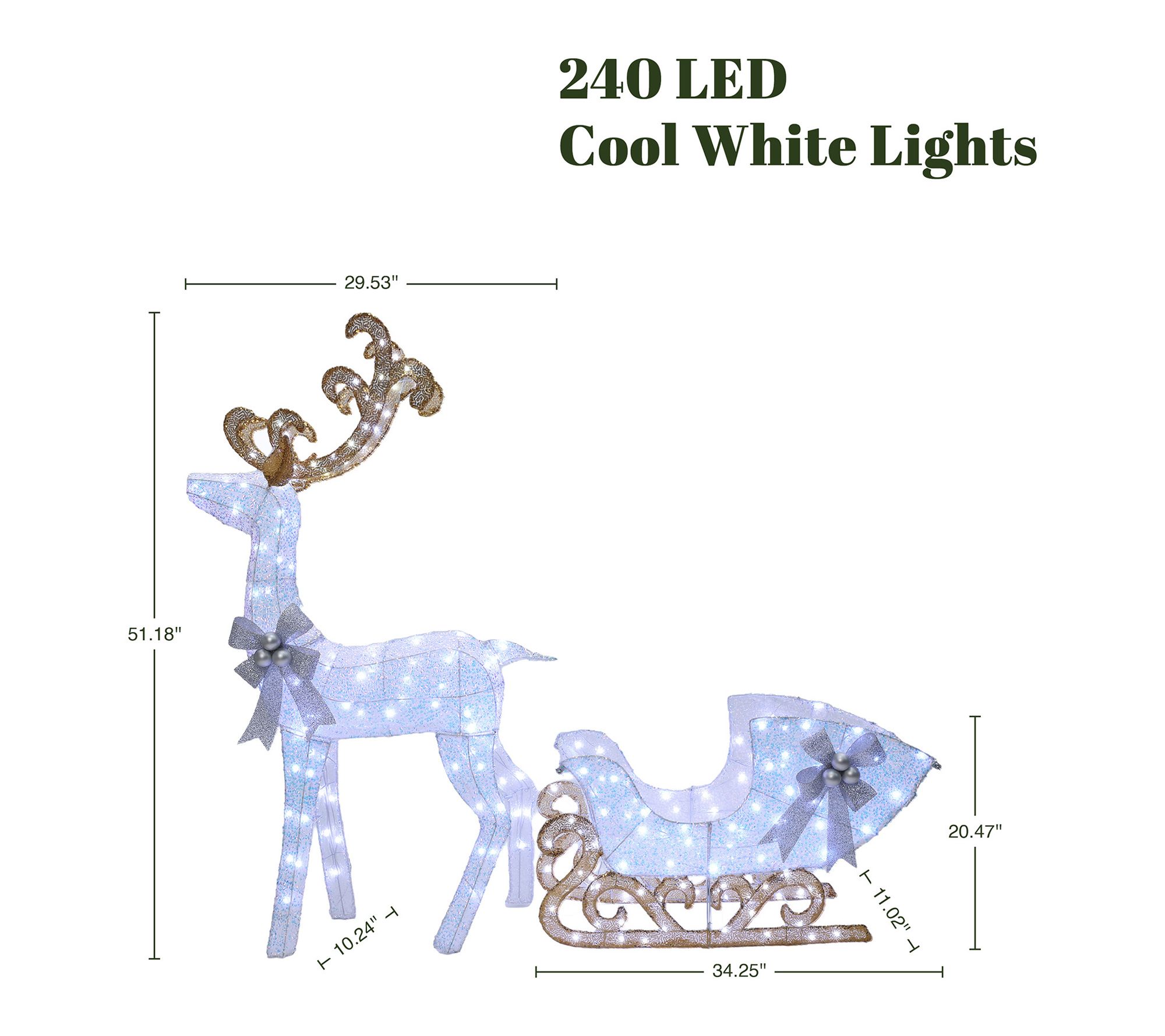 Measures reindeer 51.18" H x 29.53" W x 10.24" D; sleigh 20.47" H x 34.25" W x 11.02" D; cord 16' L