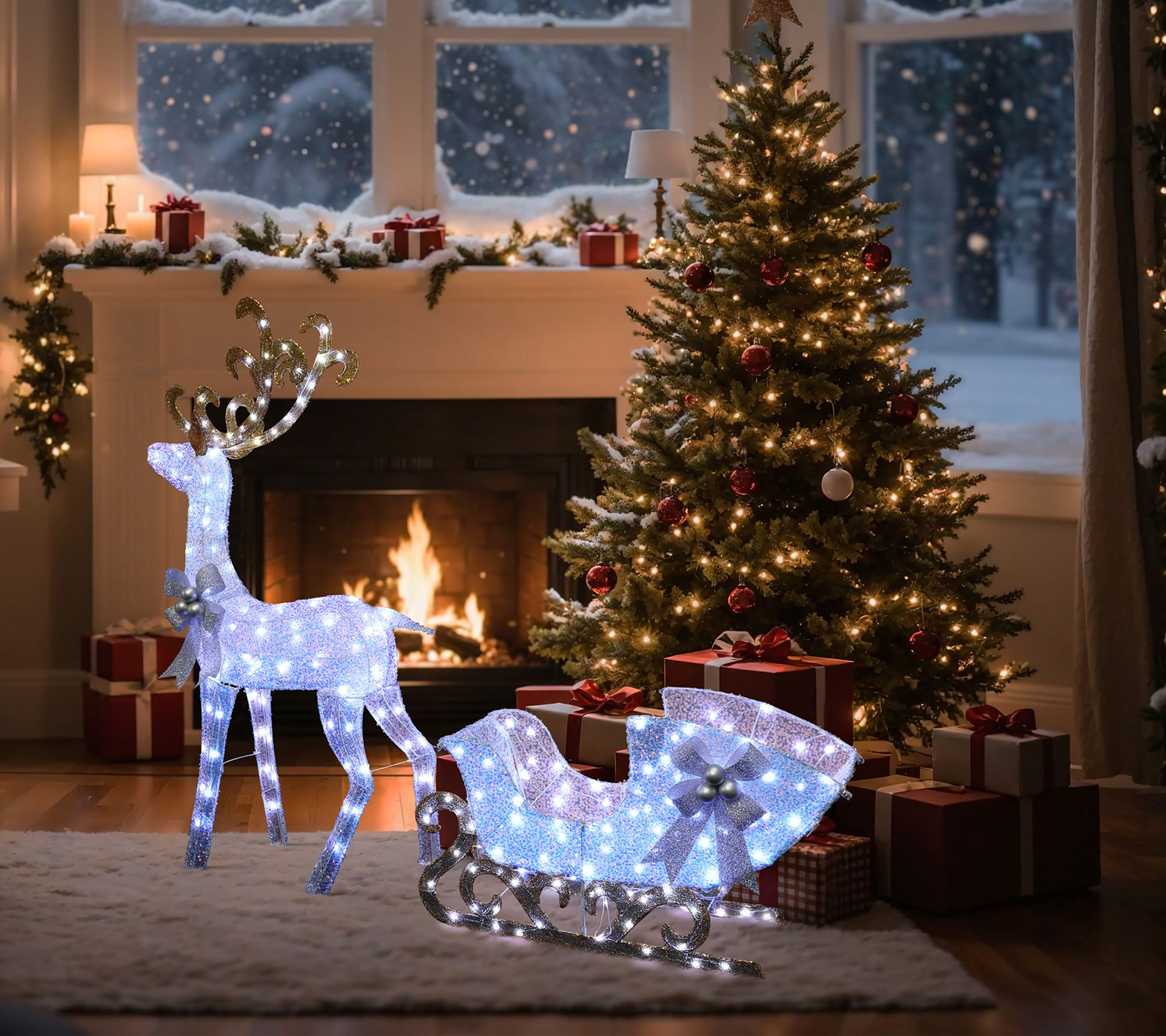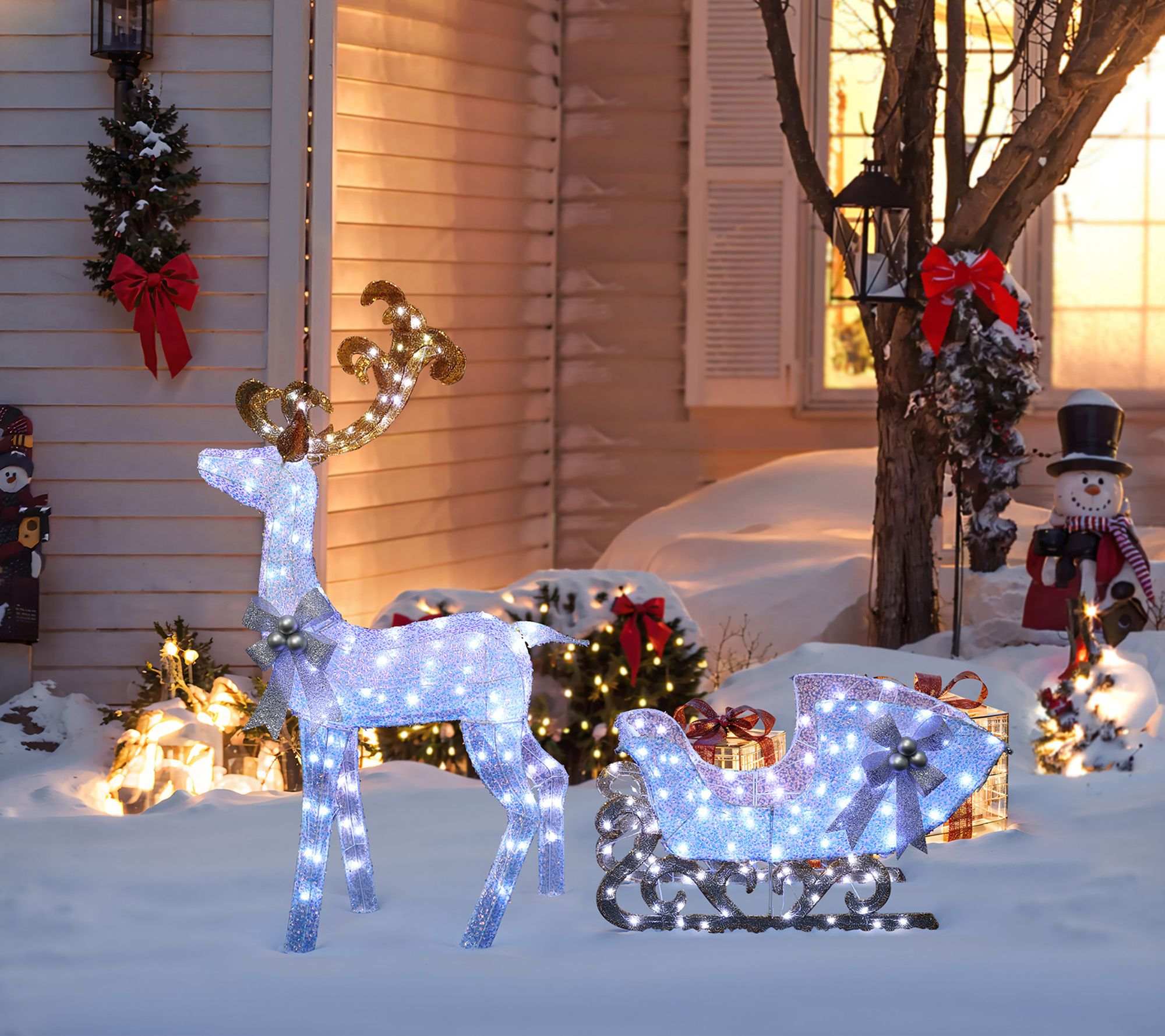 Transform your lawn or entryway into a magical setting with this lighted white reindeer and sleigh holiday decoration. Bathed in a radiant glow from 240 cool white LED lights, the gleaming figures add festive charm whether perched indoors beside a fireplace or greeting guests outdoors. A shimmering finish and elegant silver bows create a captivating centerpiece for seasonal celebrations. From LuxenHome.