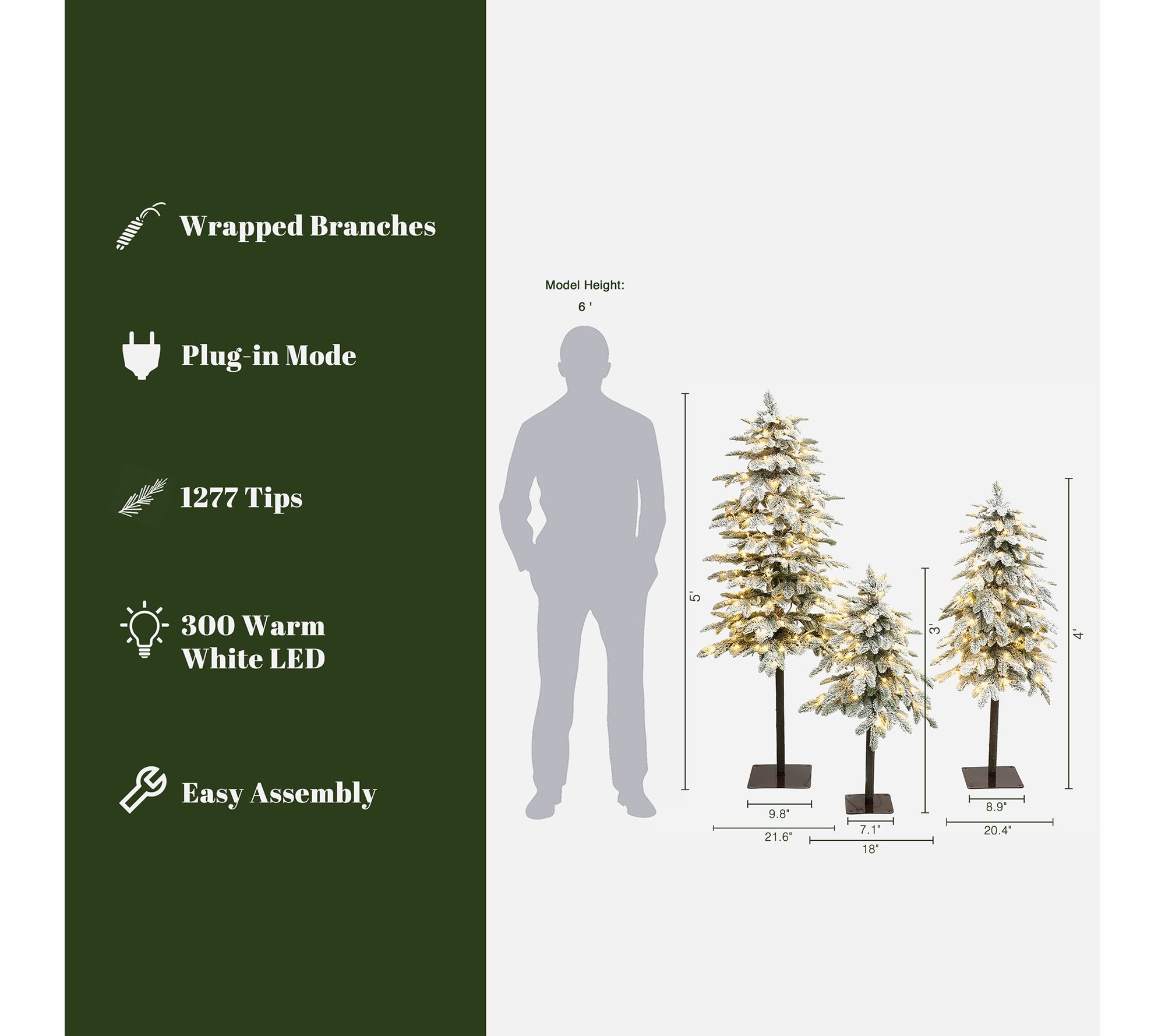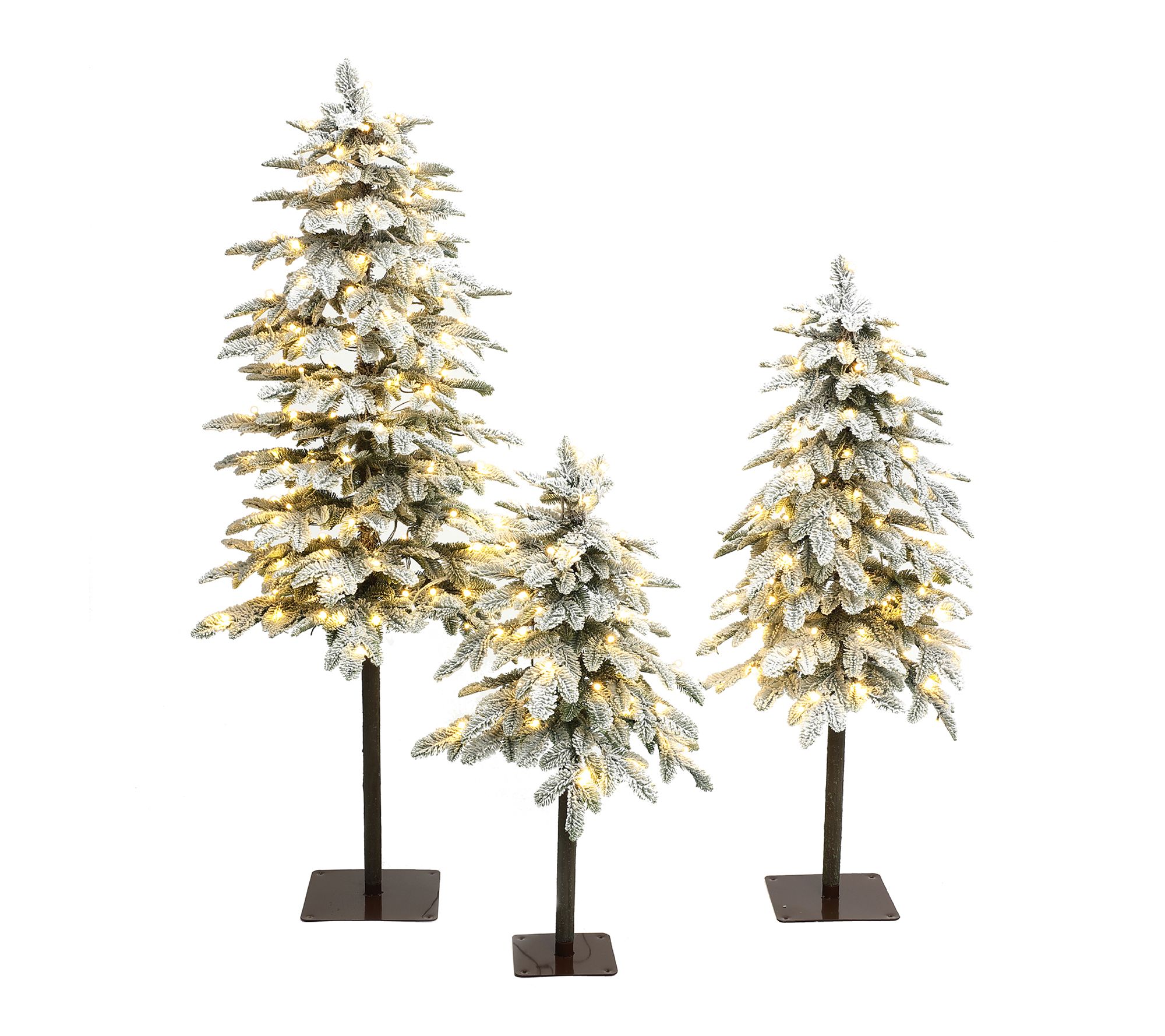 Includes three artificial trees (five-foot, four-foot, and three-foot) with flat metal bases