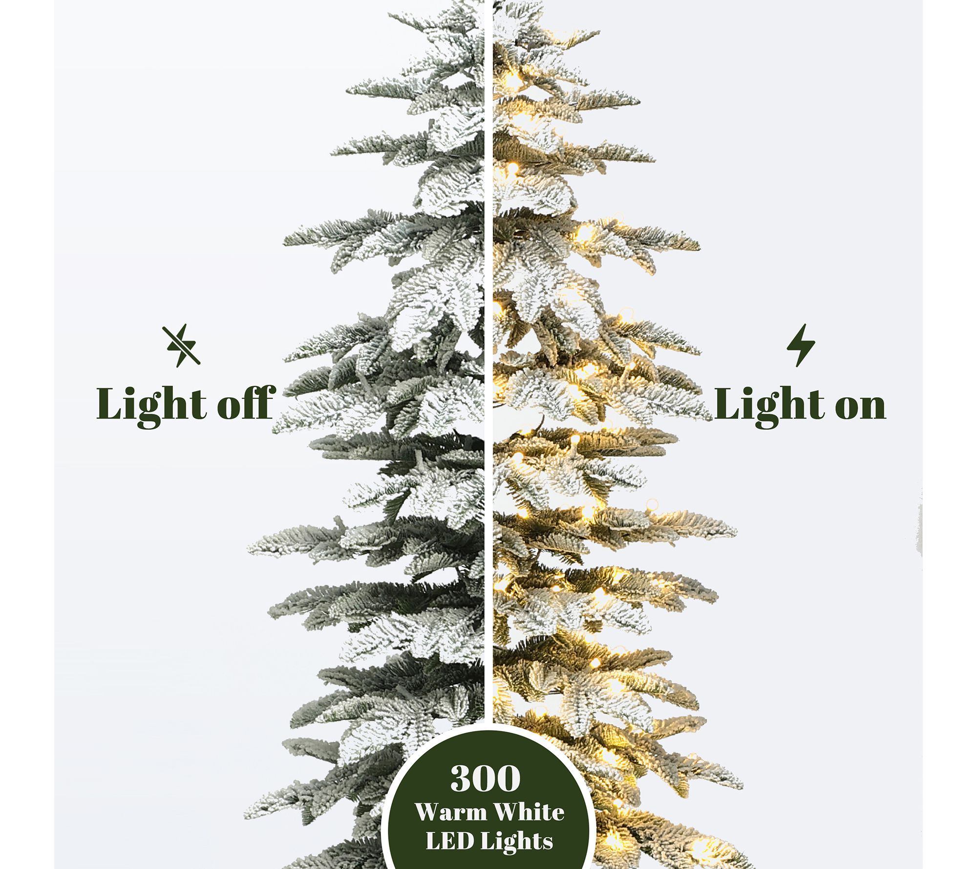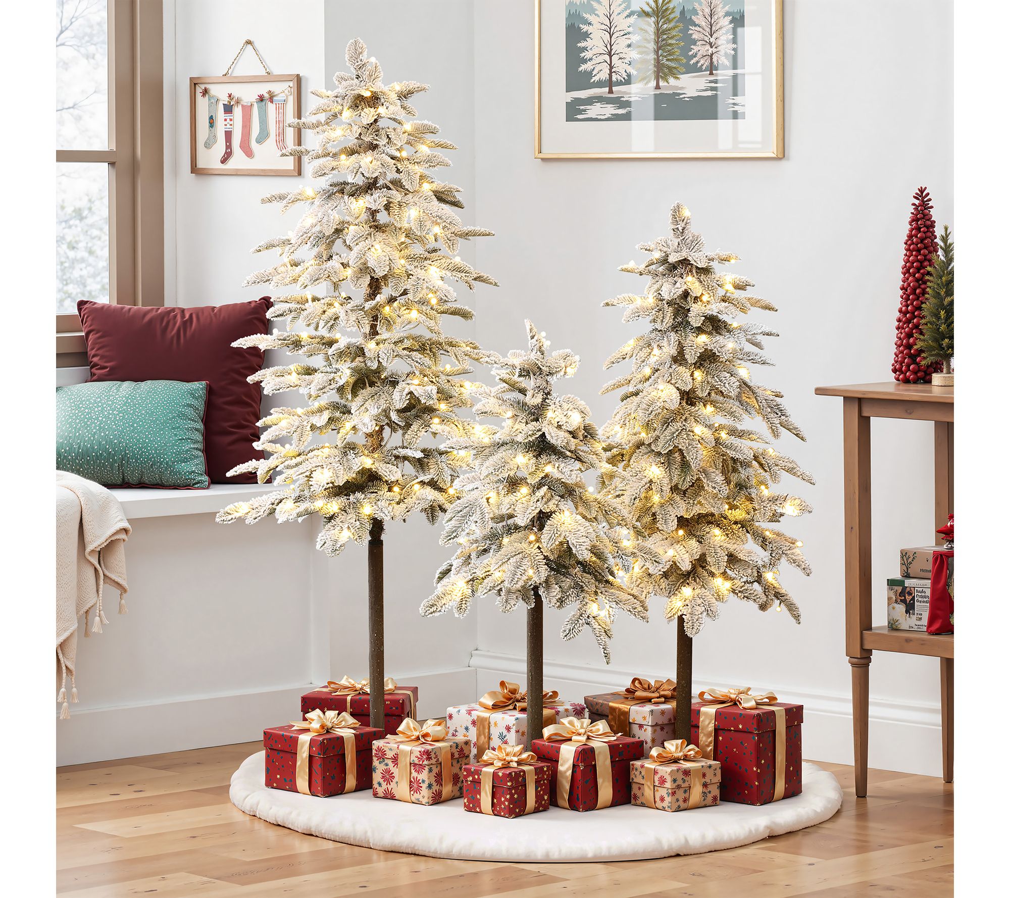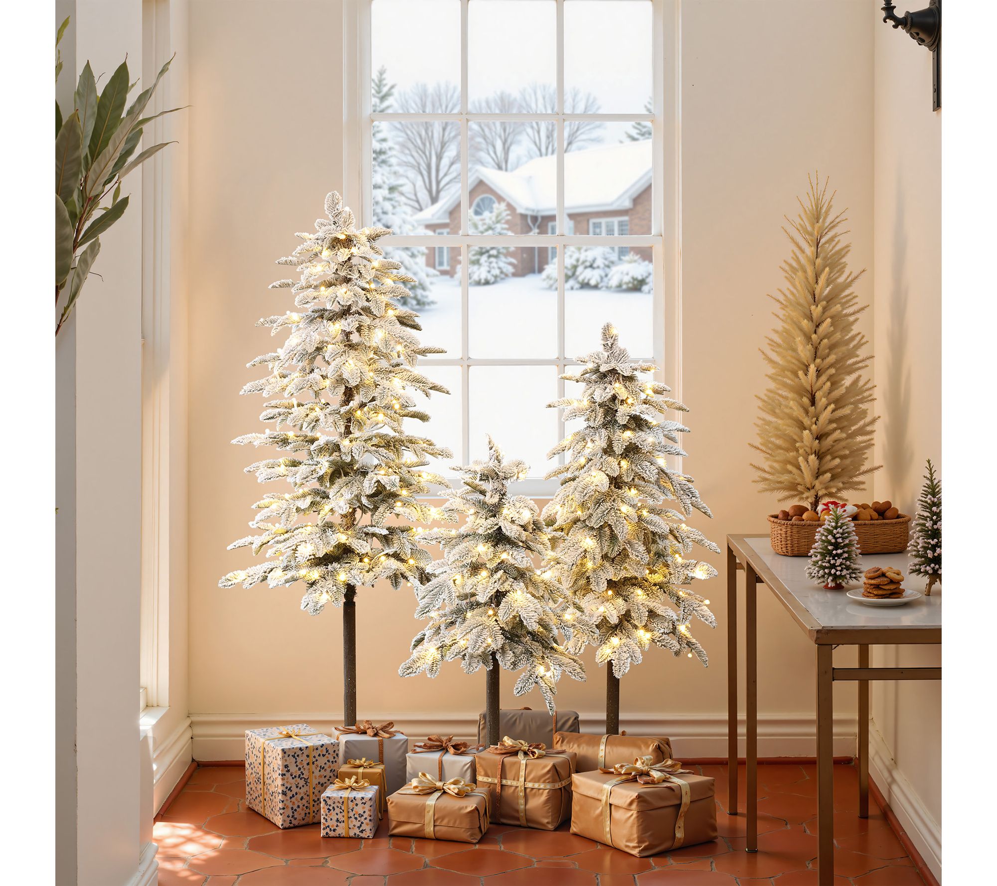 Celebrate the holidays with a flocked artificial Christmas tree set that creates a whimsical wintry scene the moment you plug it in. Each tree shines with warm, clear LED lights, bringing a cozy glow to living rooms, covered porches, or bedrooms. Designed in space-saving sizes, this set delivers festive elegance wherever you want to welcome friends and family. From LuxenHome.